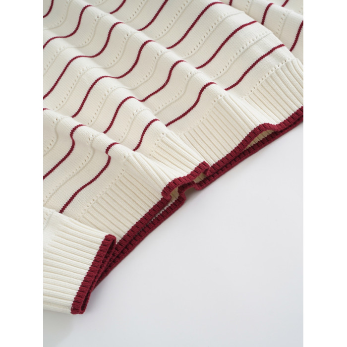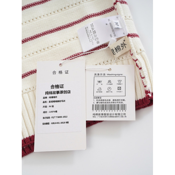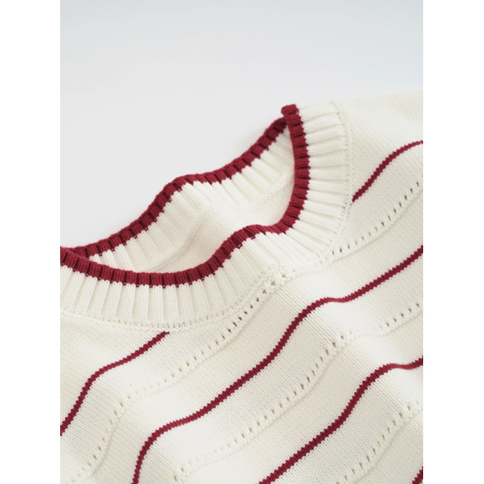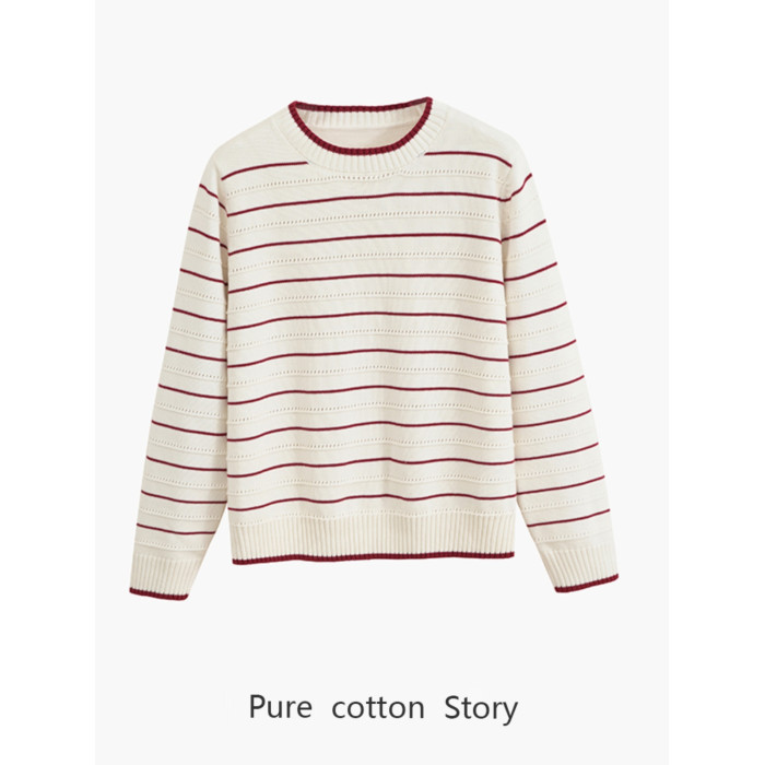 全棉100% 紅白條紋毛衣女套頭圓領秋冬長袖針織打底衫粗線 寬松版