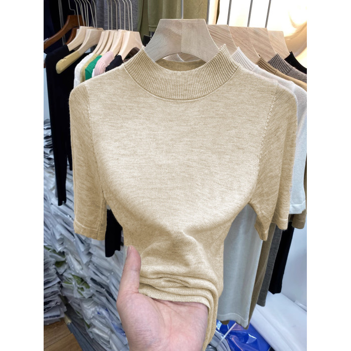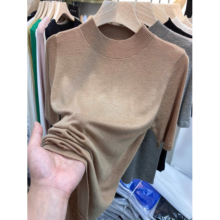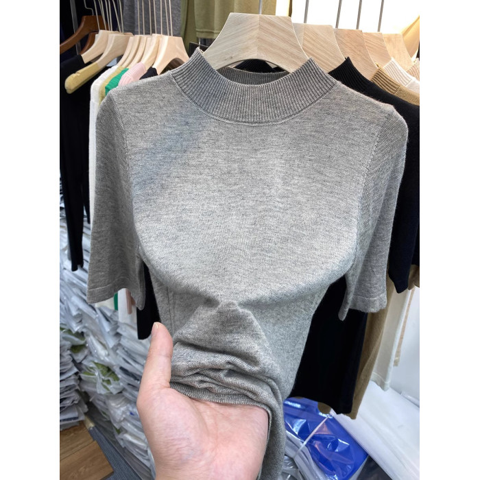 大碼春秋寬松半高領針織打底衫女胖mm五分袖氣質洋氣中袖內搭上衣