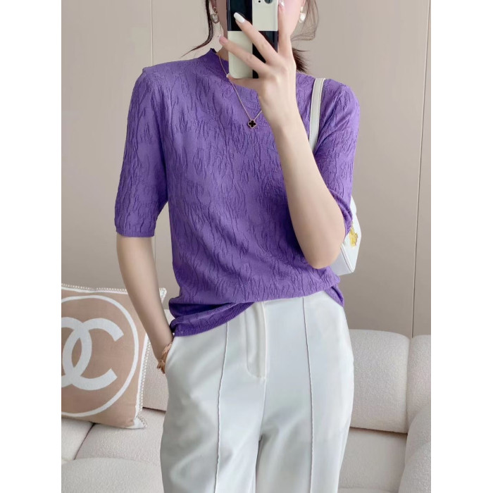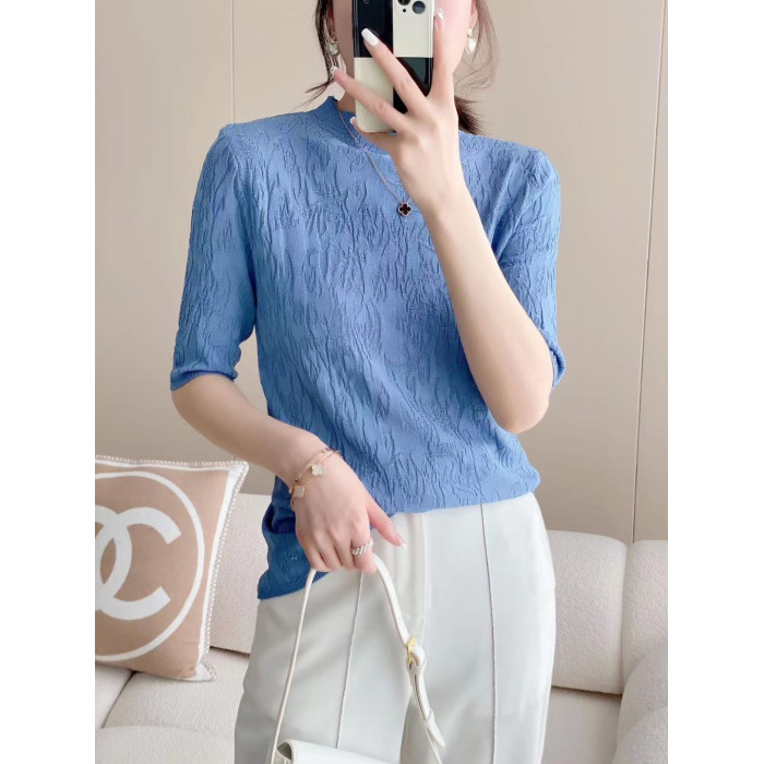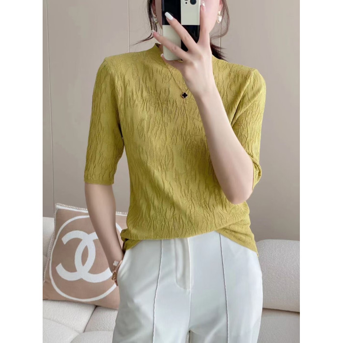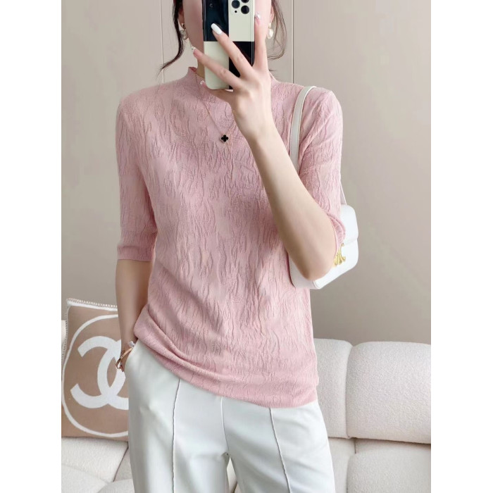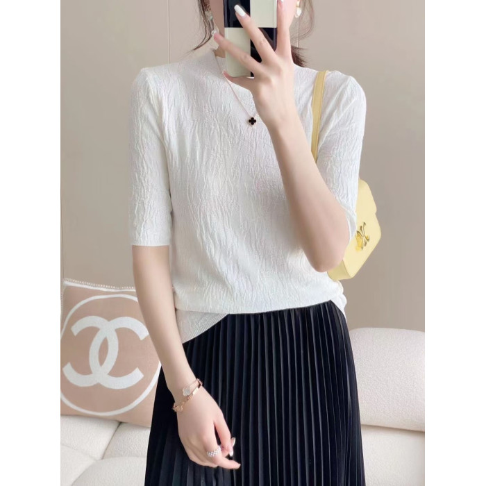 春夏薄款半高領中袖冰絲針織衫上衣女外穿洋氣百搭寬松螺紋打底衫