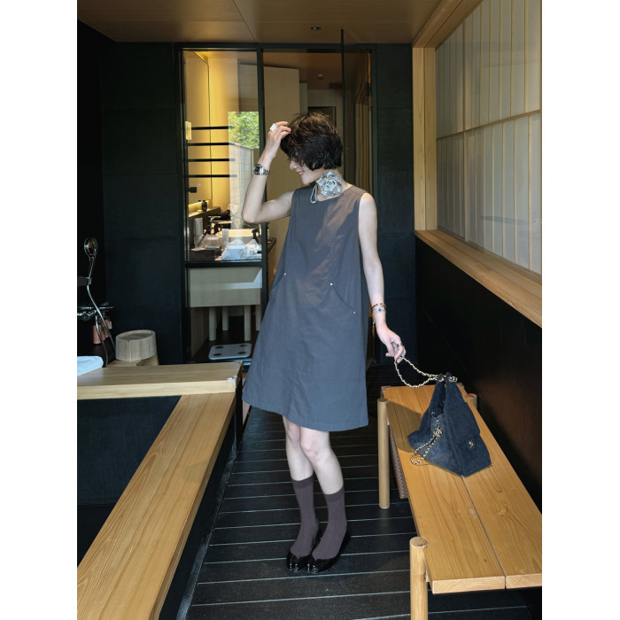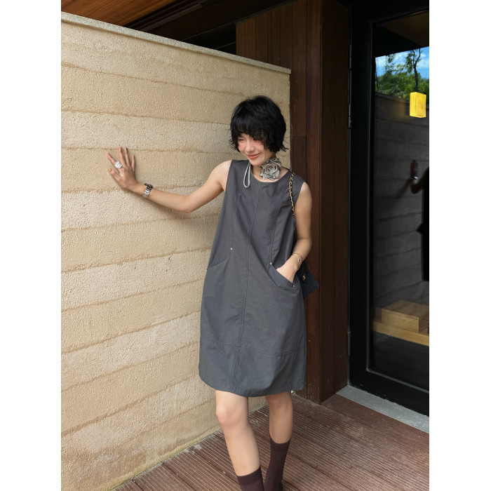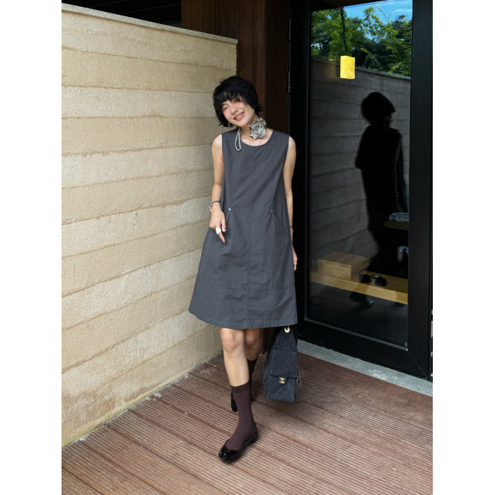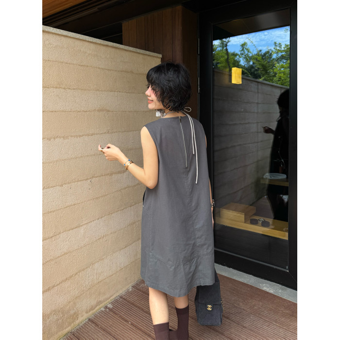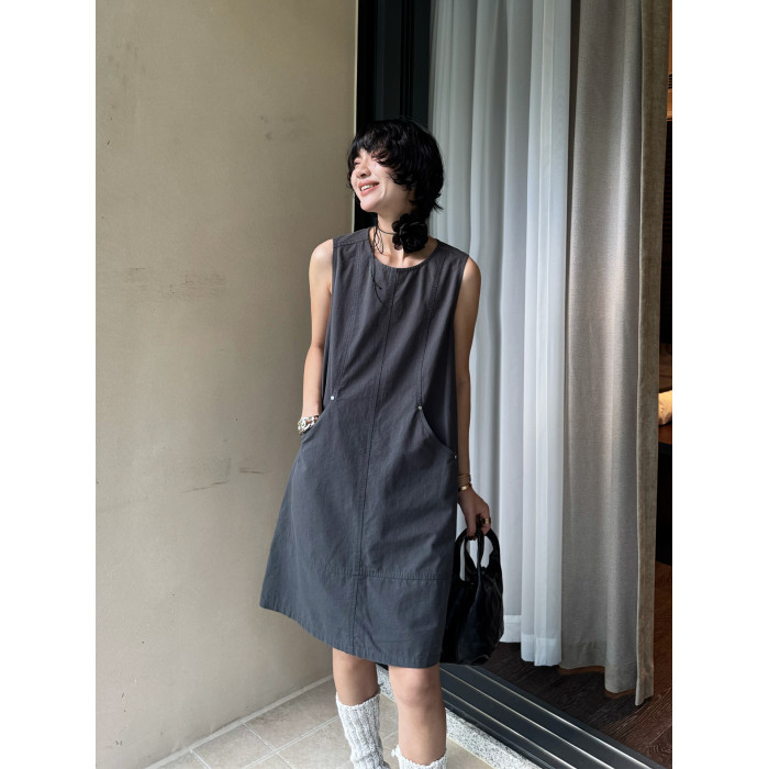 BUUYIE 昀辰 無袖背心裙女夏新款高級感氣質中長款寬松馬甲連衣裙