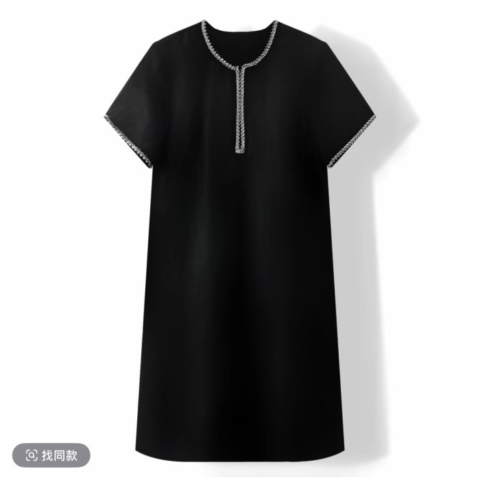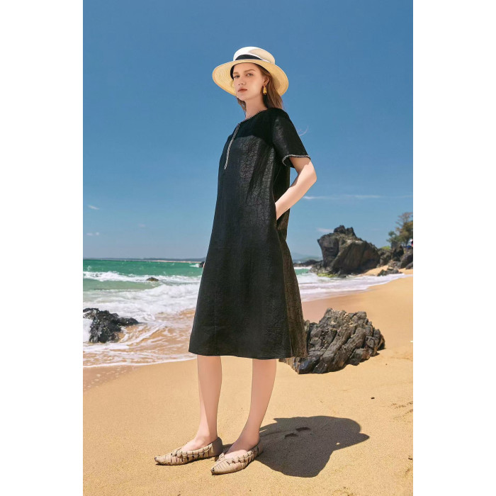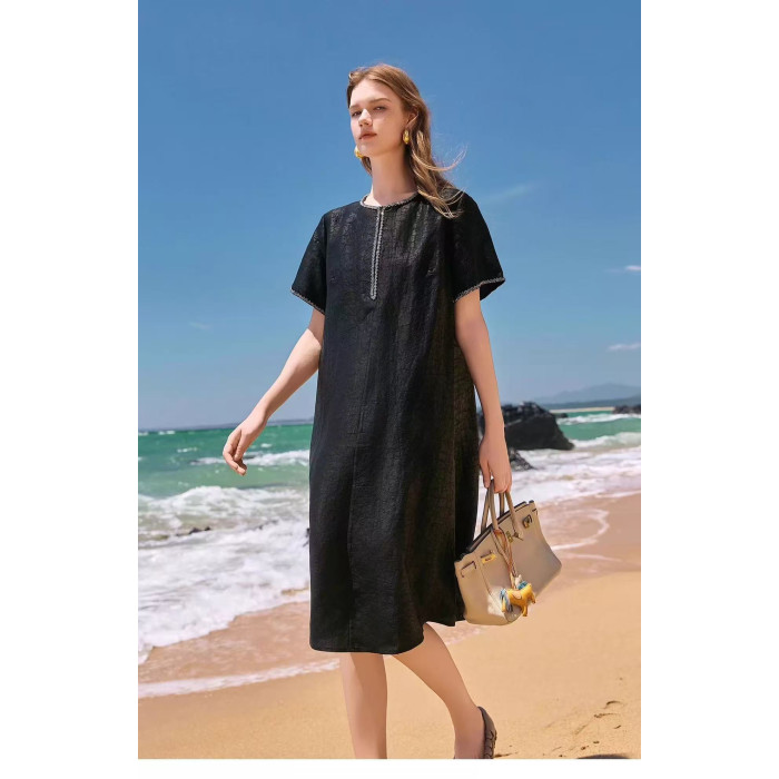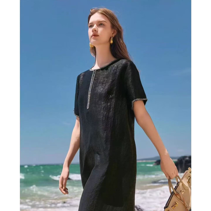 【黑鑽】香雲漢麻連衣裙女氣質釘珠短袖簡約寬松裙子夏季新25182