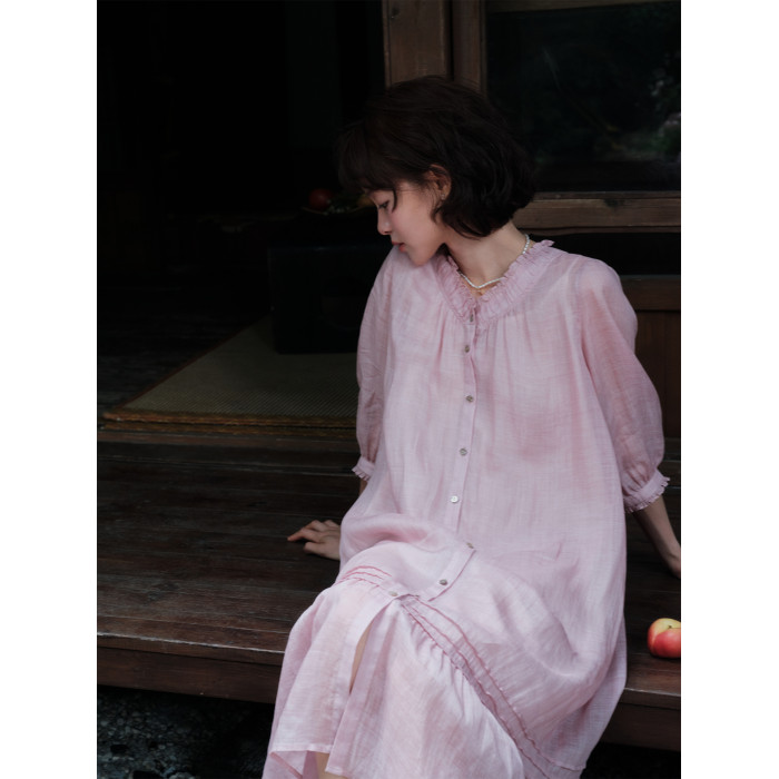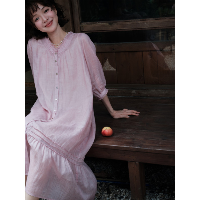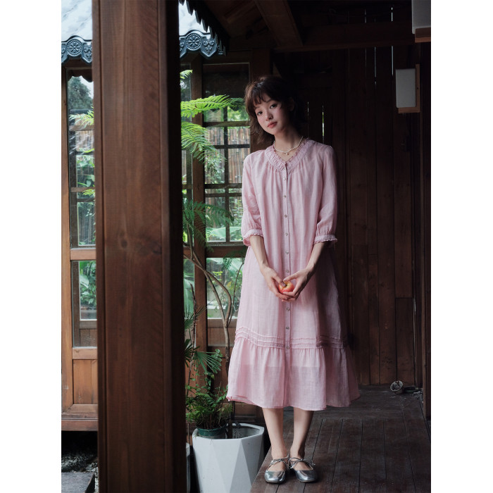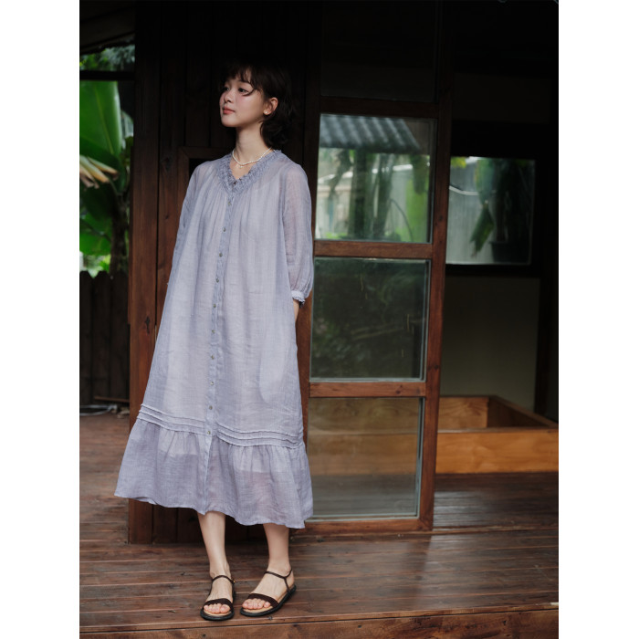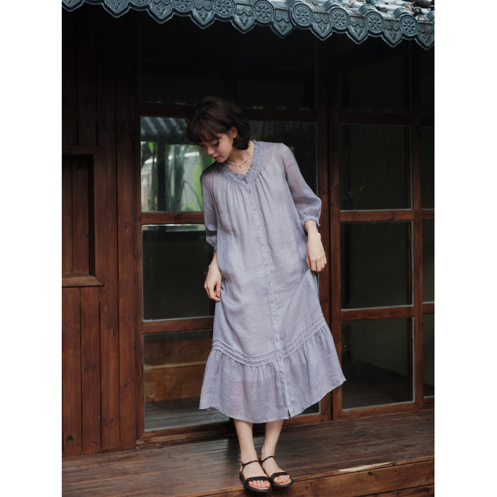 說與山聽「紫霞」兩色苧麻連衣裙 7分袖V領松弛感日系風女夏 6936
