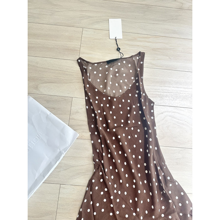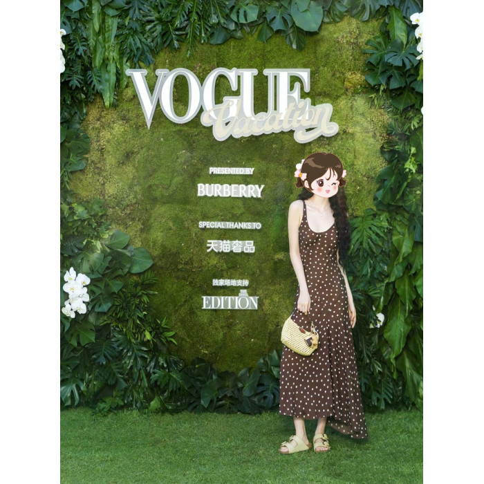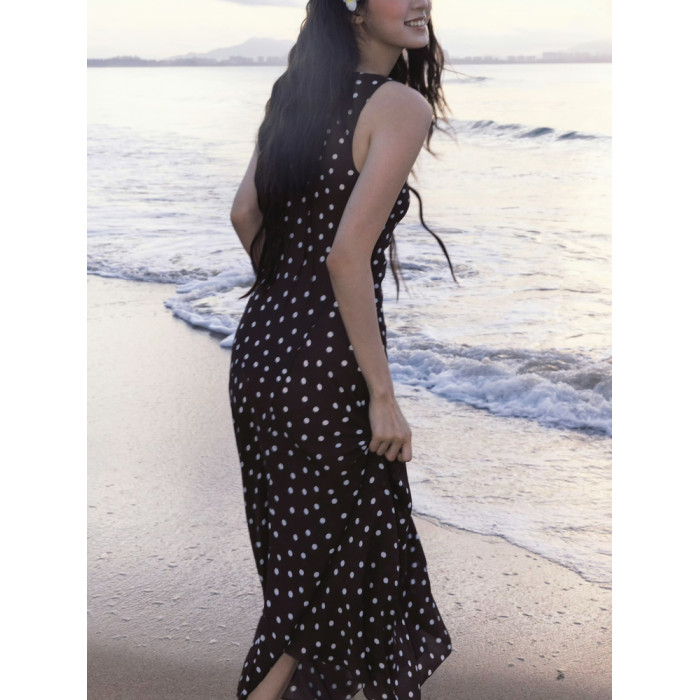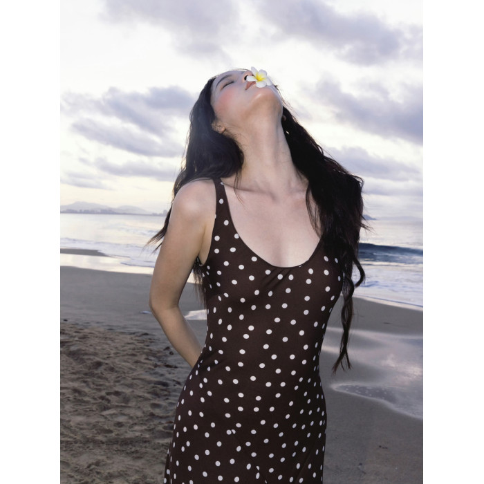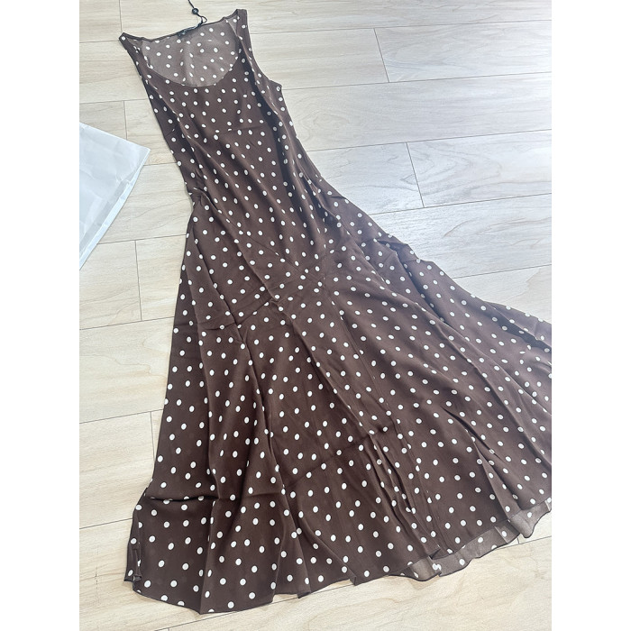 Dec自製 歐陽娜娜同款大U領棕色波點真絲中長連衣裙度假仙女裙