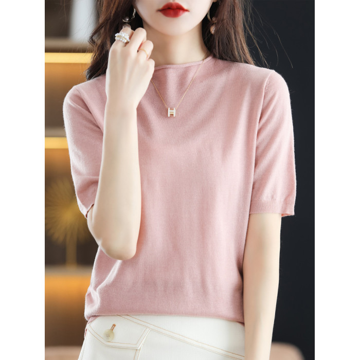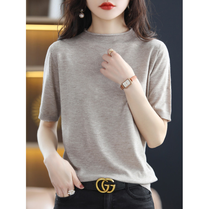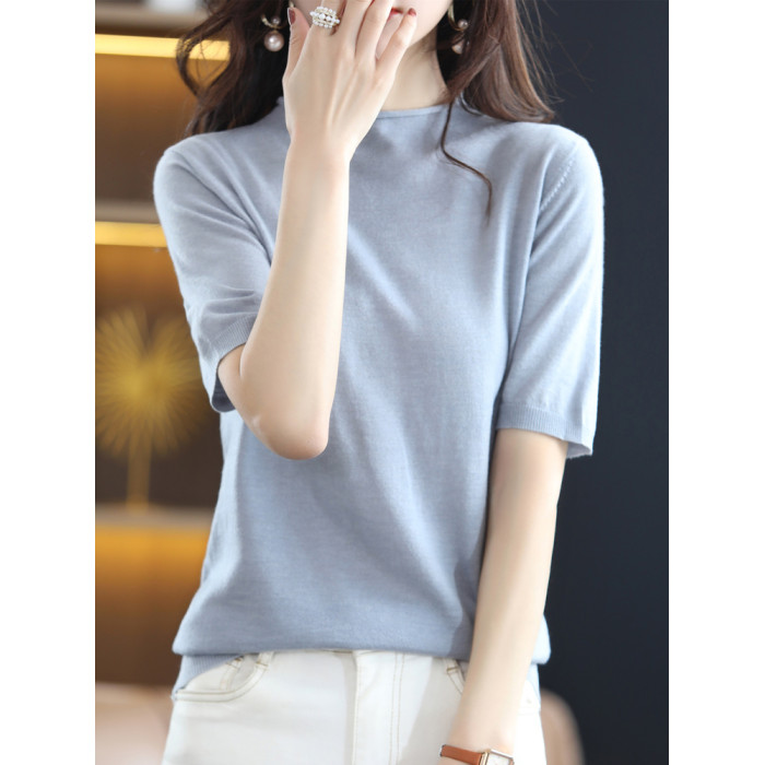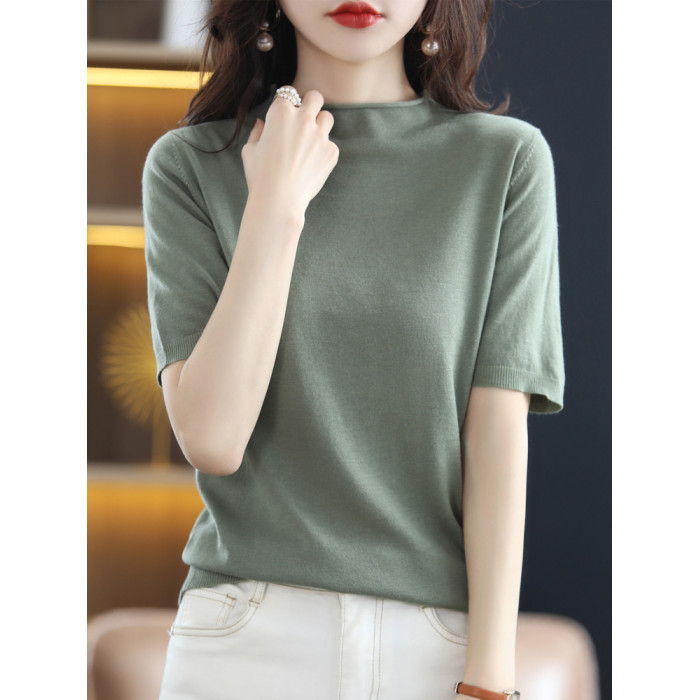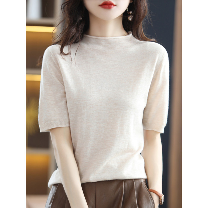 25夏季新款卷邊半高領短袖打底衫女寬松針織純色薄款羊毛中袖上衣