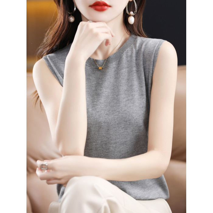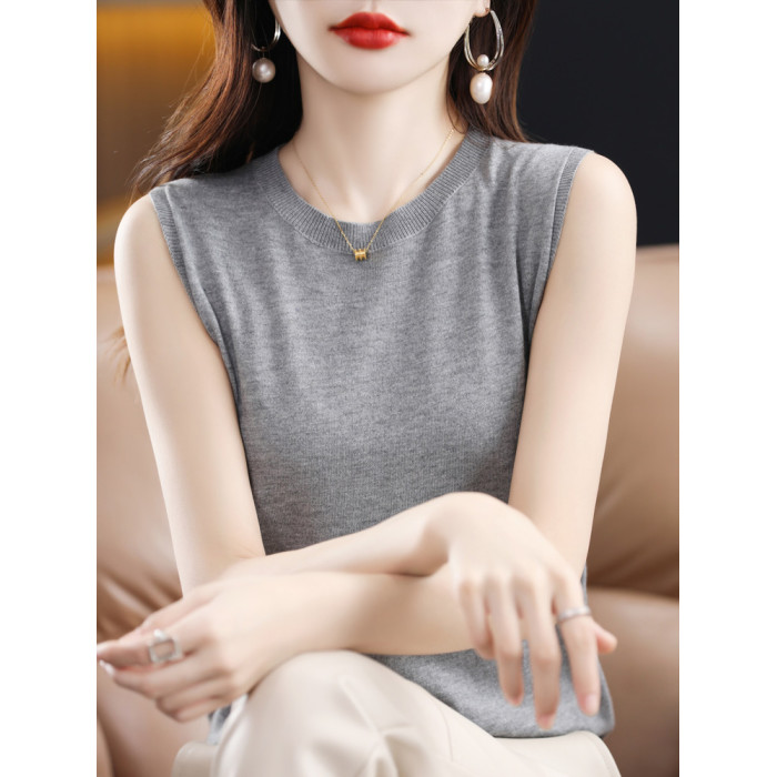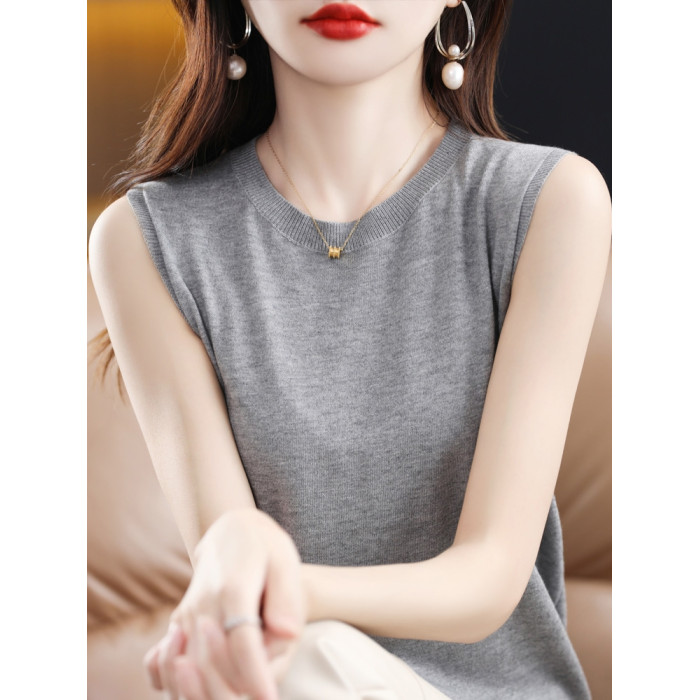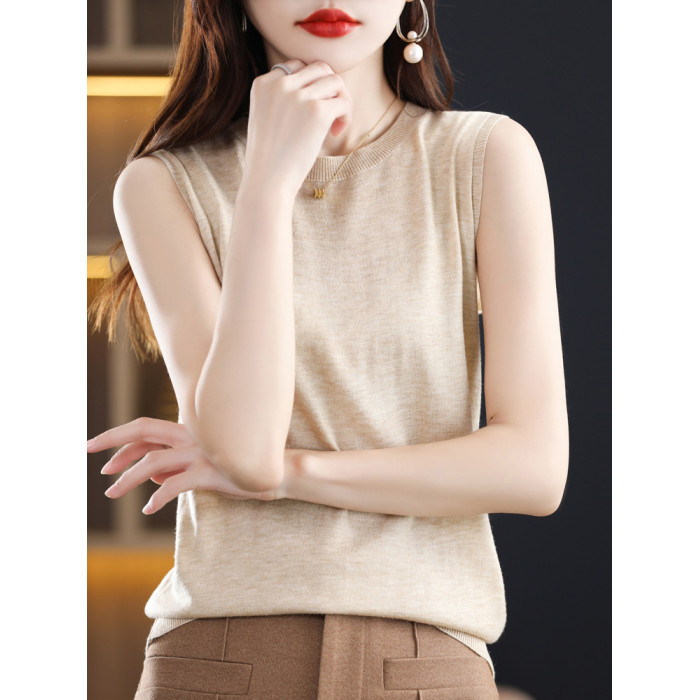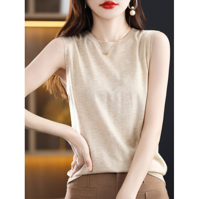 新款寬松套頭女圓領針織衫精紡羊毛衫內搭無袖上衣背心百搭打底衫