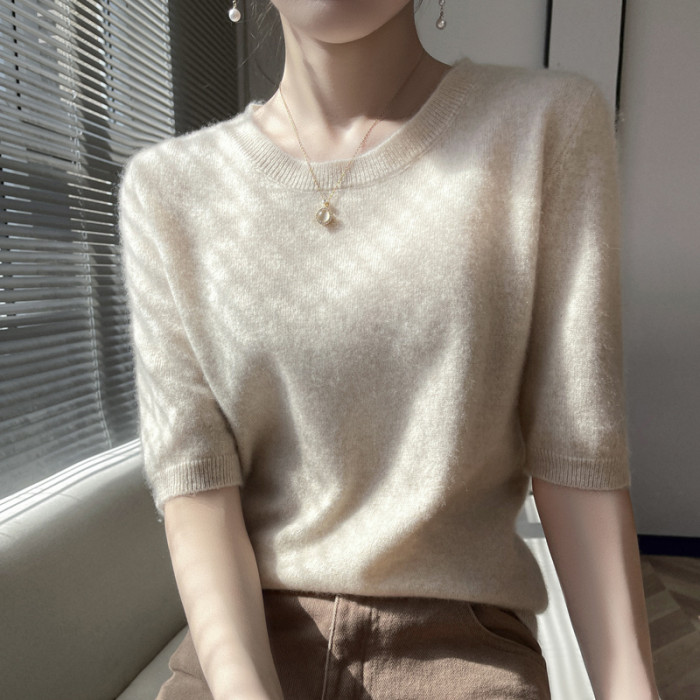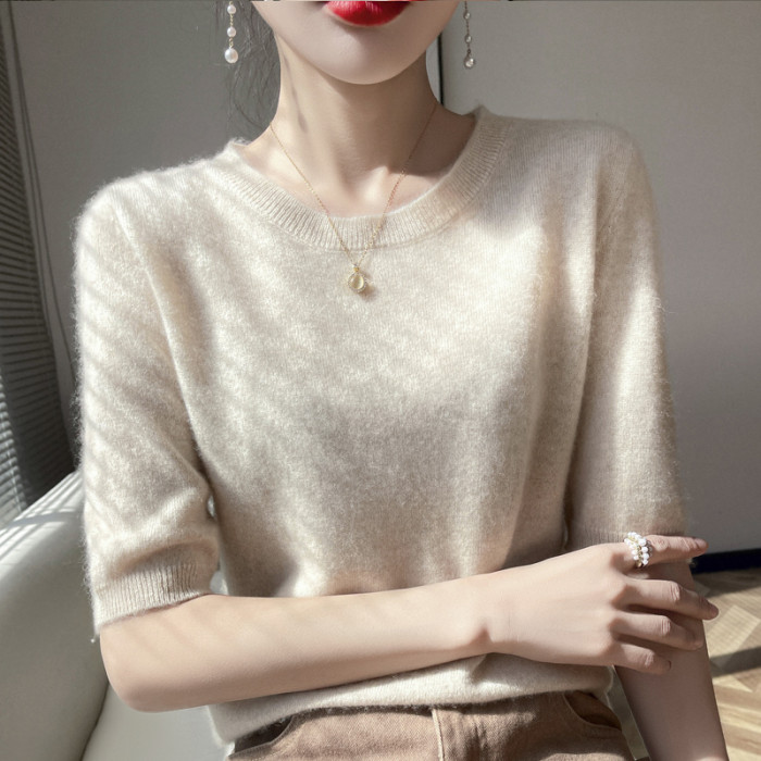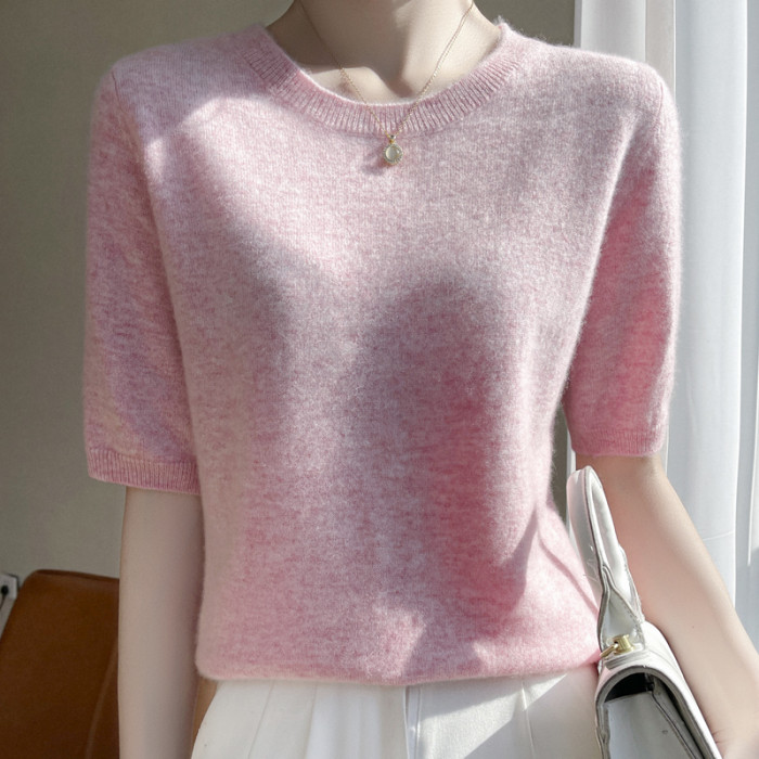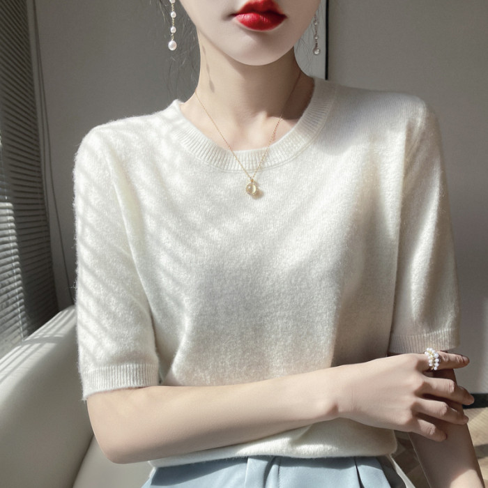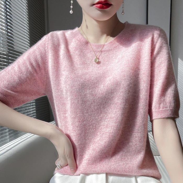 WAN NING羊絨短袖女毛衣圓領寬松套頭百搭針織半袖薄款羊毛打底衫