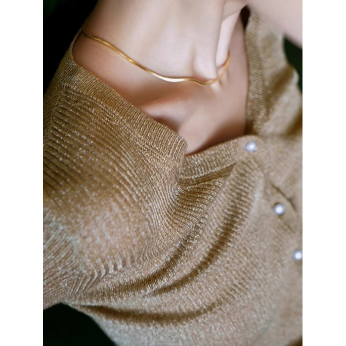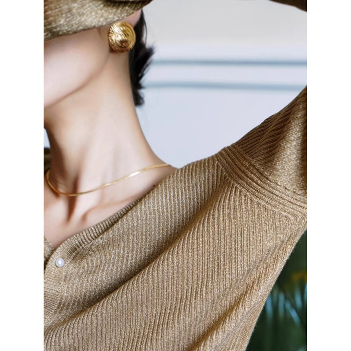 法式閃光紗亮絲V領針織衫秋季新款慵懶長袖修身珍珠釦打底衫上衣