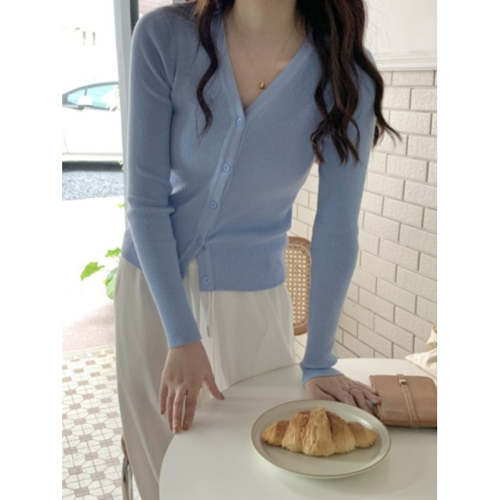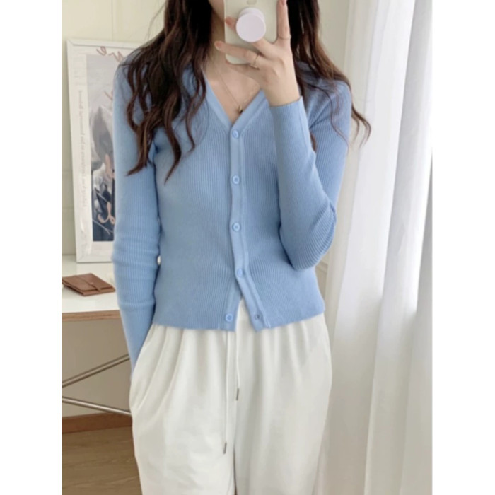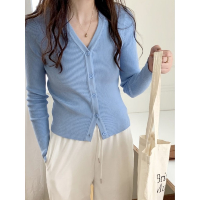 藍色毛衣打底衫女2025新款早春v領針織開衫高級感超好看上衣外套