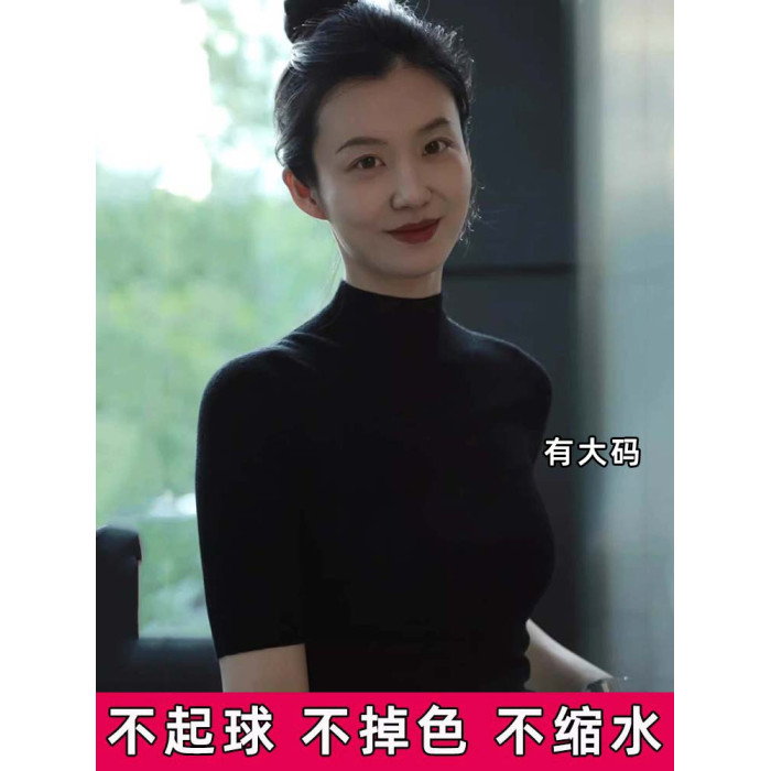 法式黑色薄款半高領打底衫大碼正肩短袖女春秋胖mm中袖內搭上衣