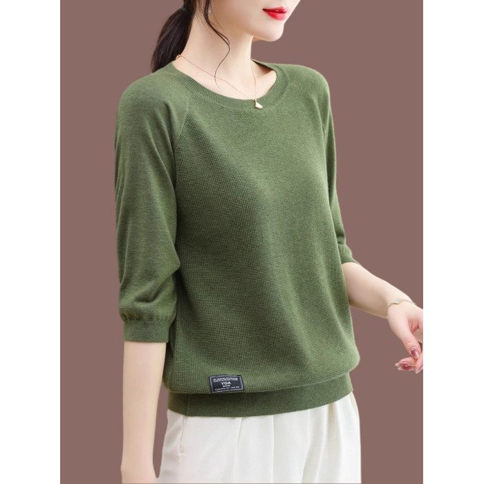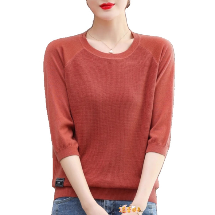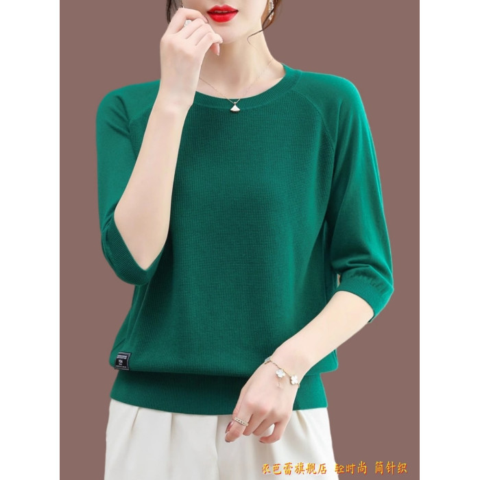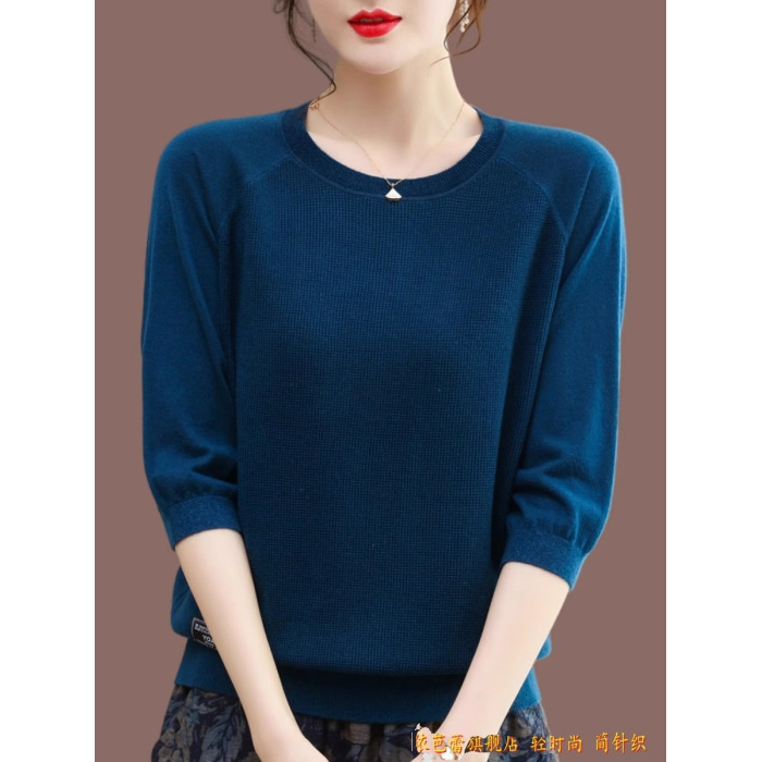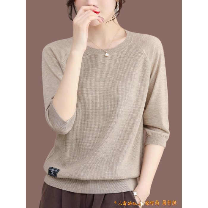 高級感百搭早春七分袖針織小衫女寬松上衣薄款春秋中袖羊毛打底衫