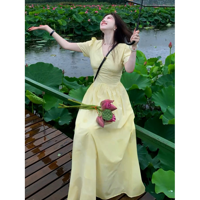 夏日絕美黃色v領短袖連衣裙子女夏季2025新款巨好看掐腰法式長裙