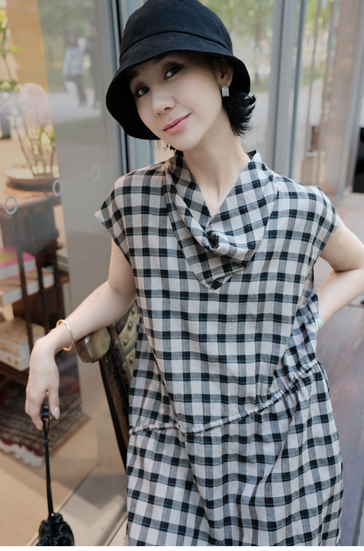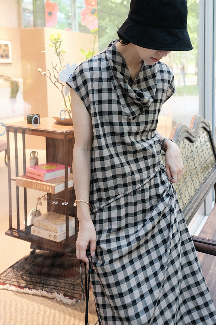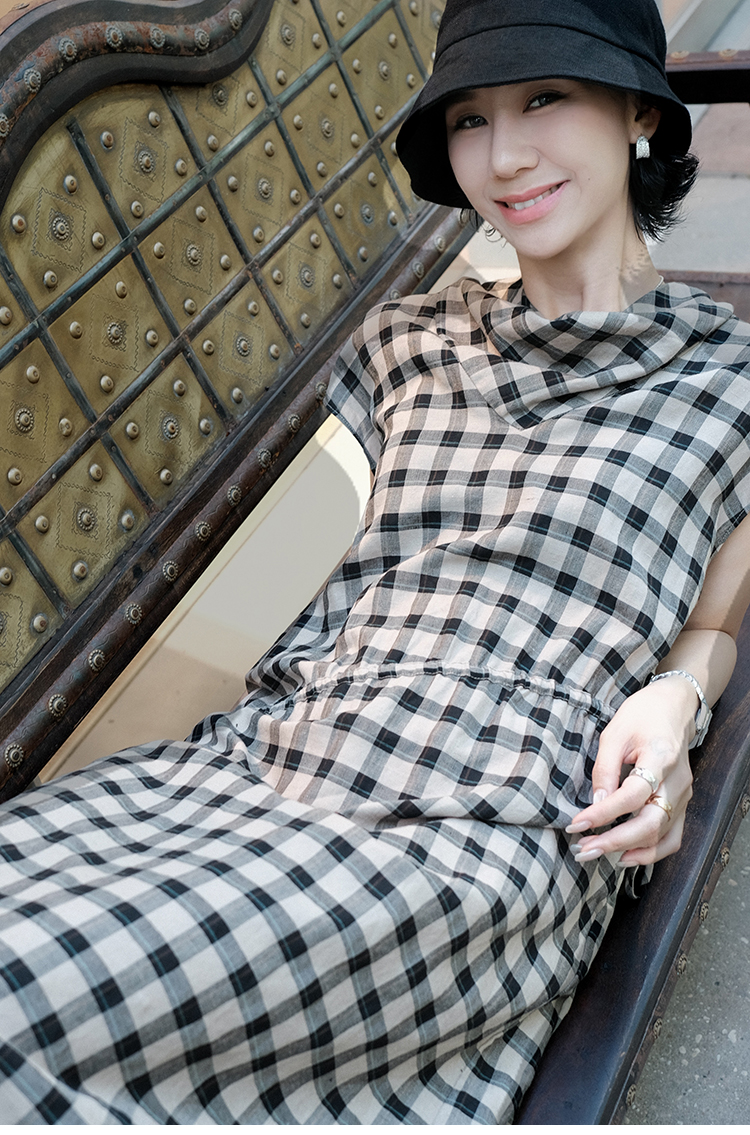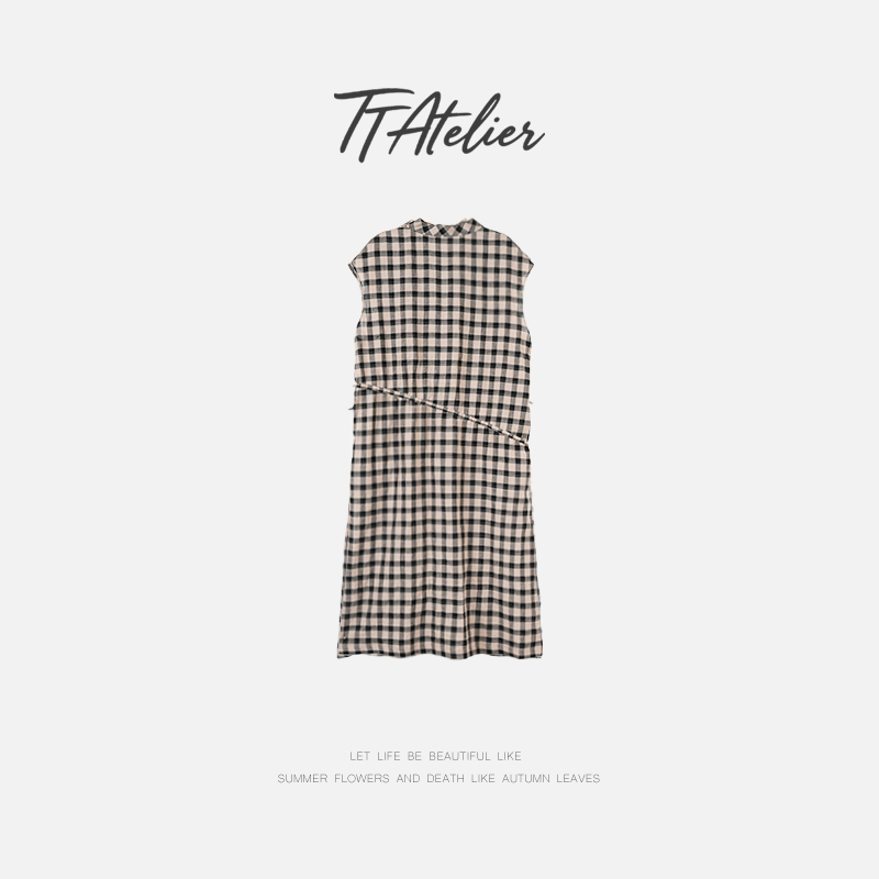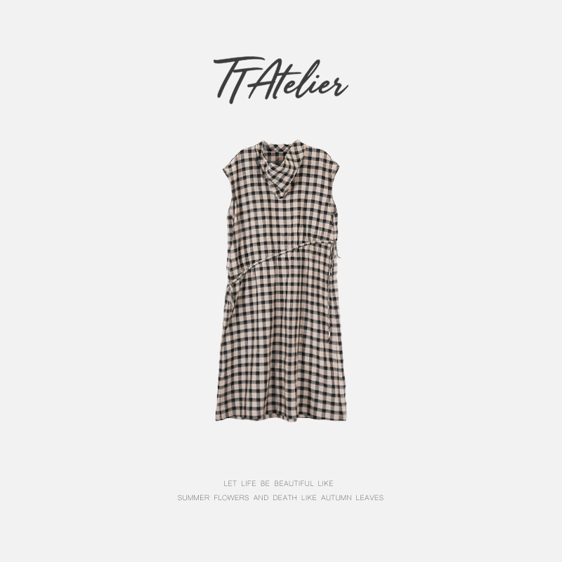 TT設計師【樓蘭】輕奢高級感休閒蕩領亞麻格子連衣裙女夏2025新款