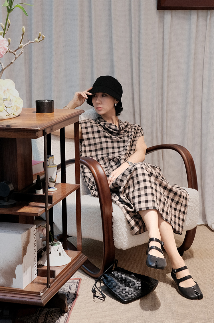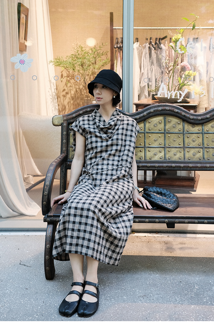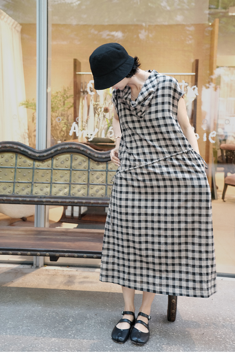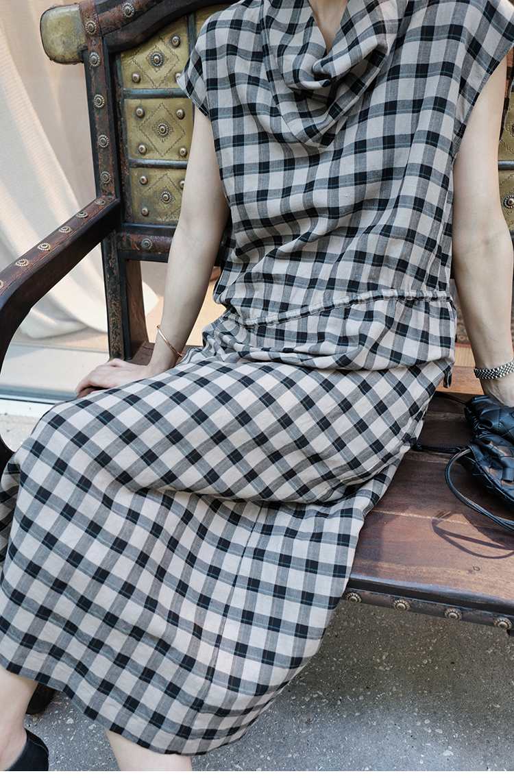 TT設計師【樓蘭】輕奢高級感休閒蕩領亞麻格子連衣裙女夏2025新款