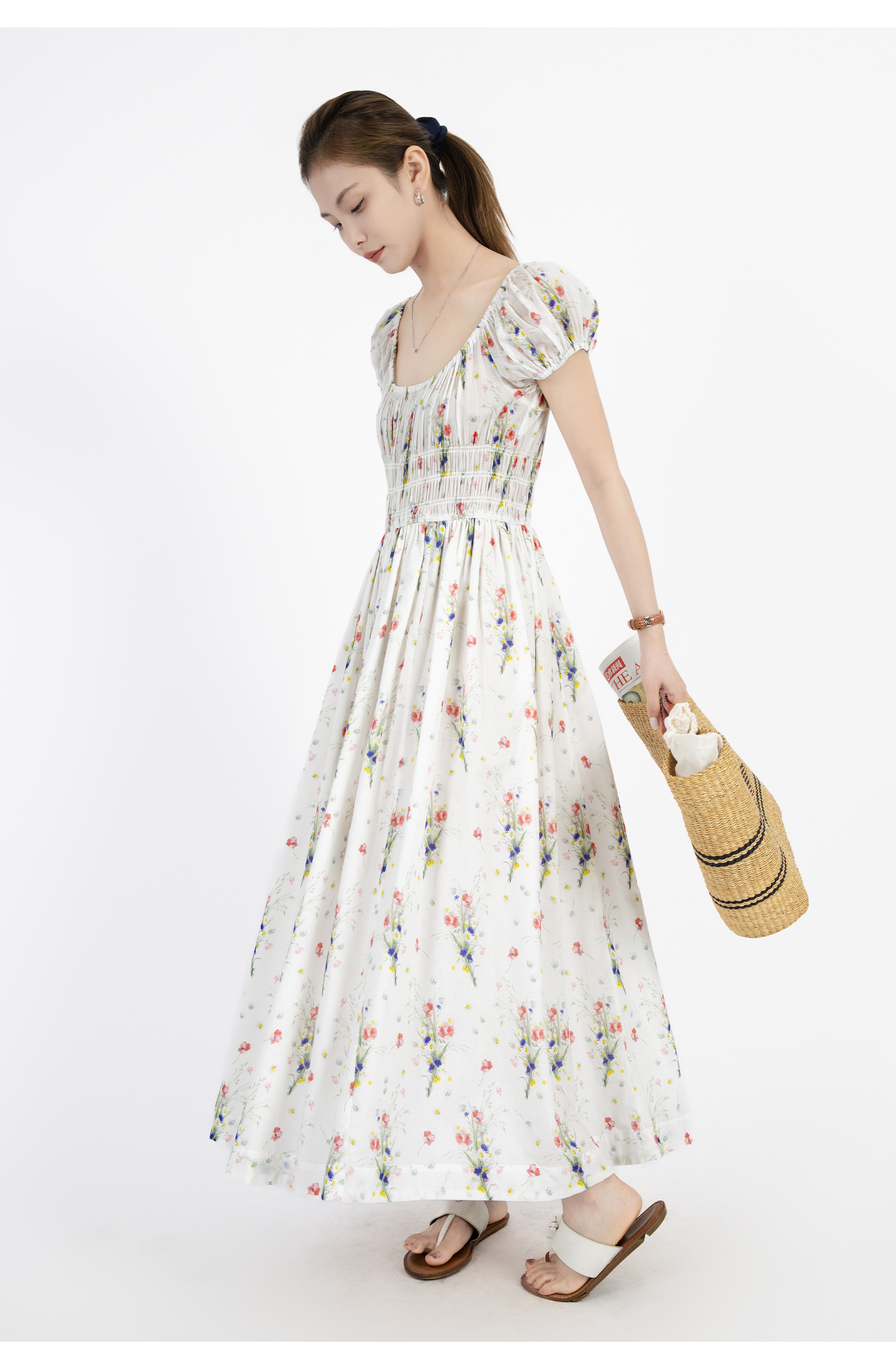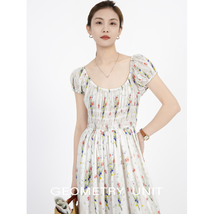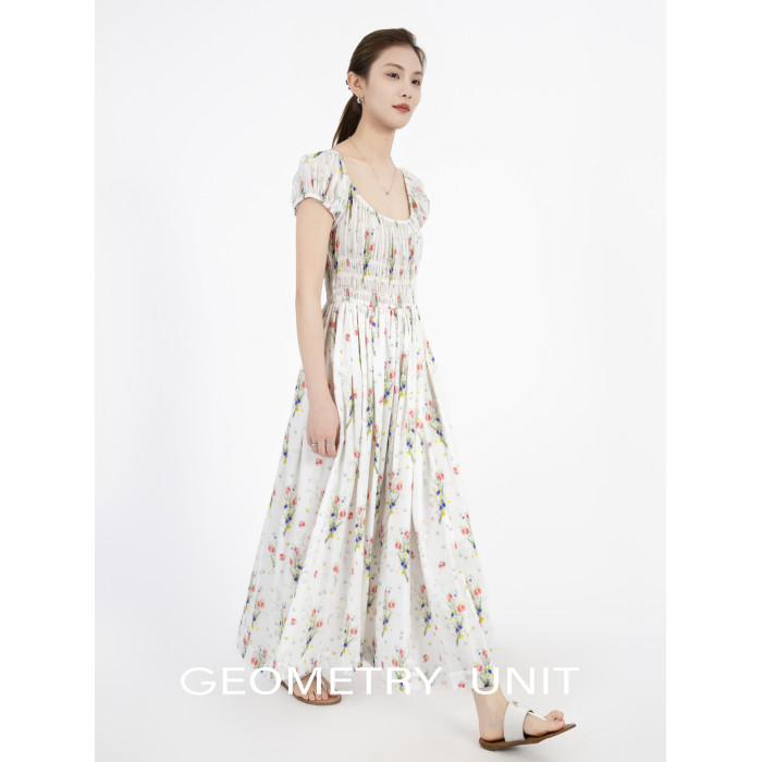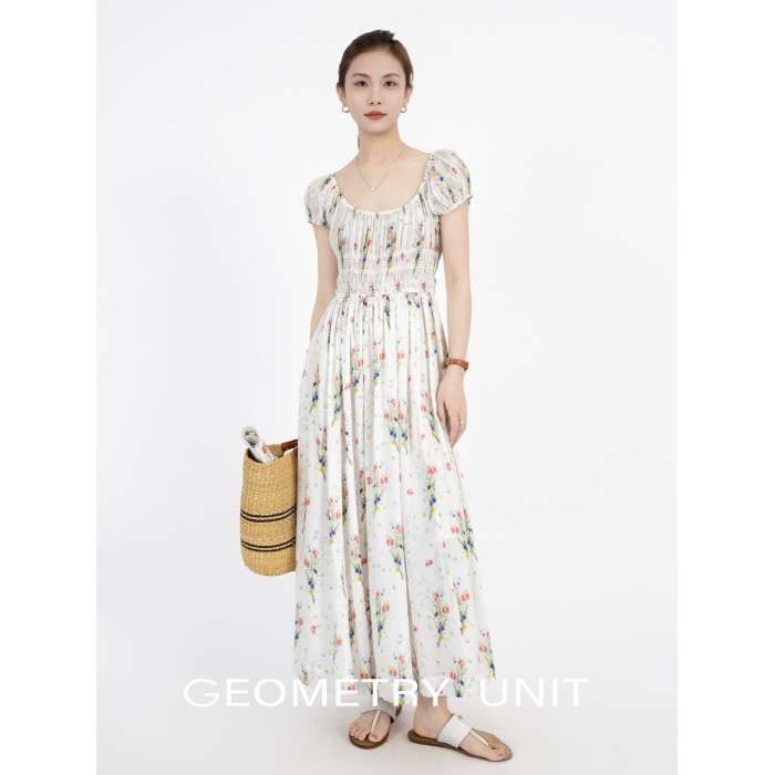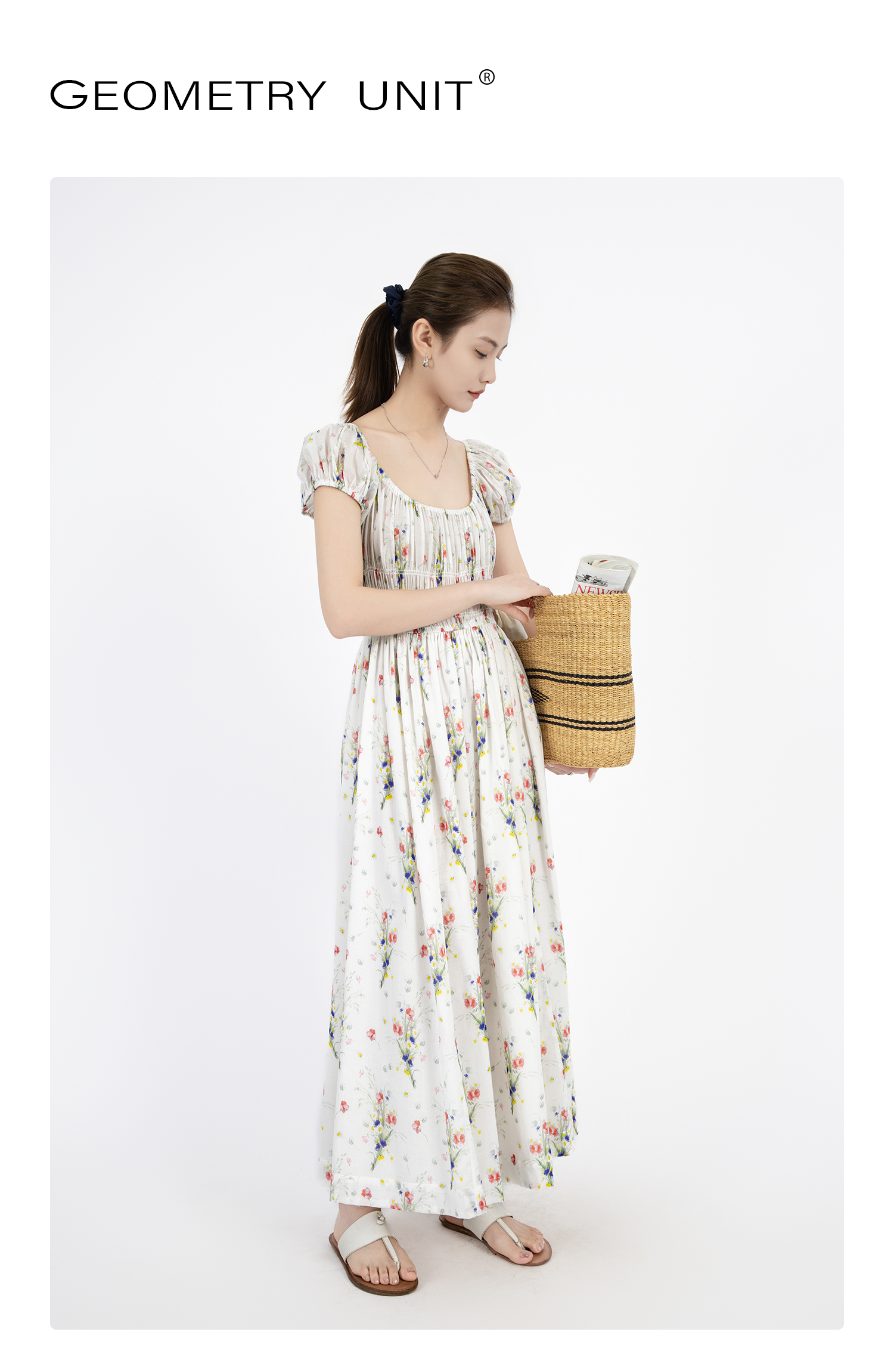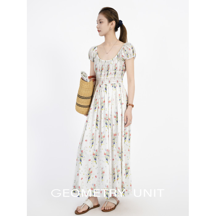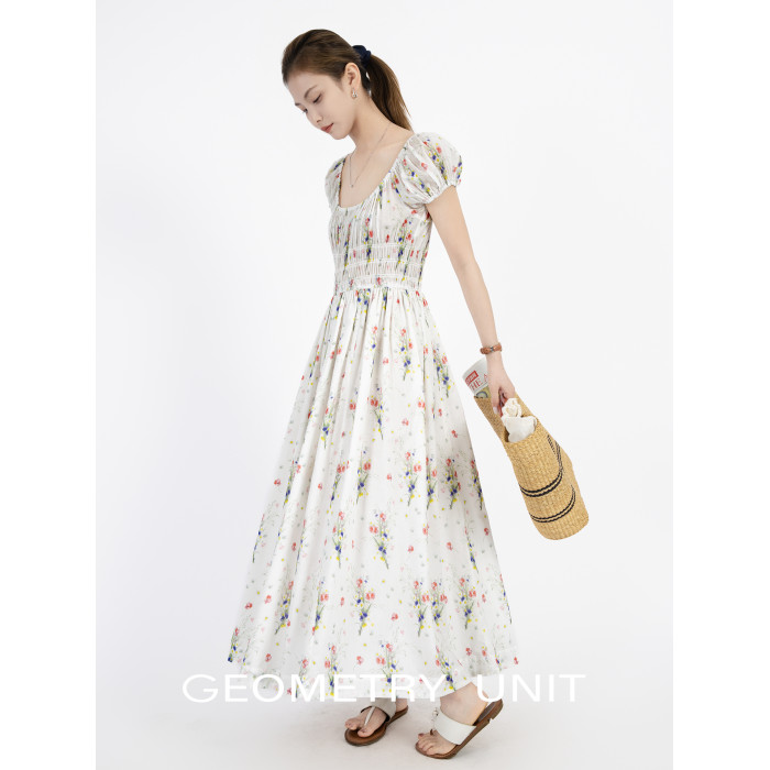 幾何單元復古度假風收腰大擺裙子法式浪漫仙女花束印花連衣裙