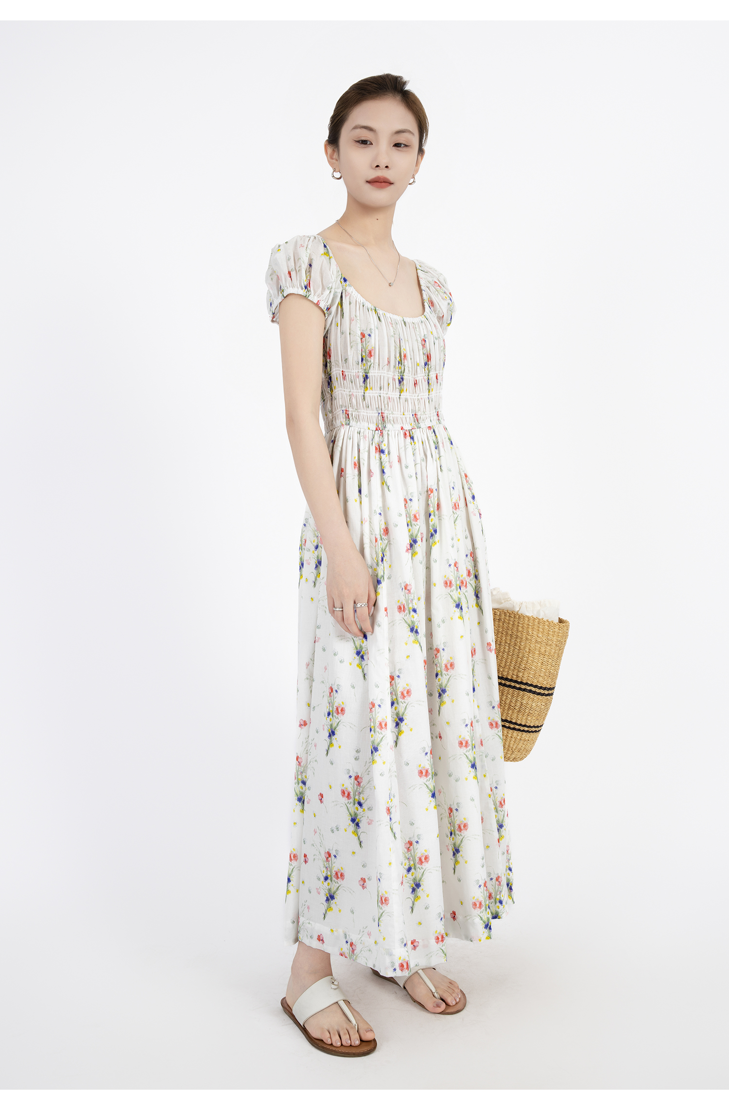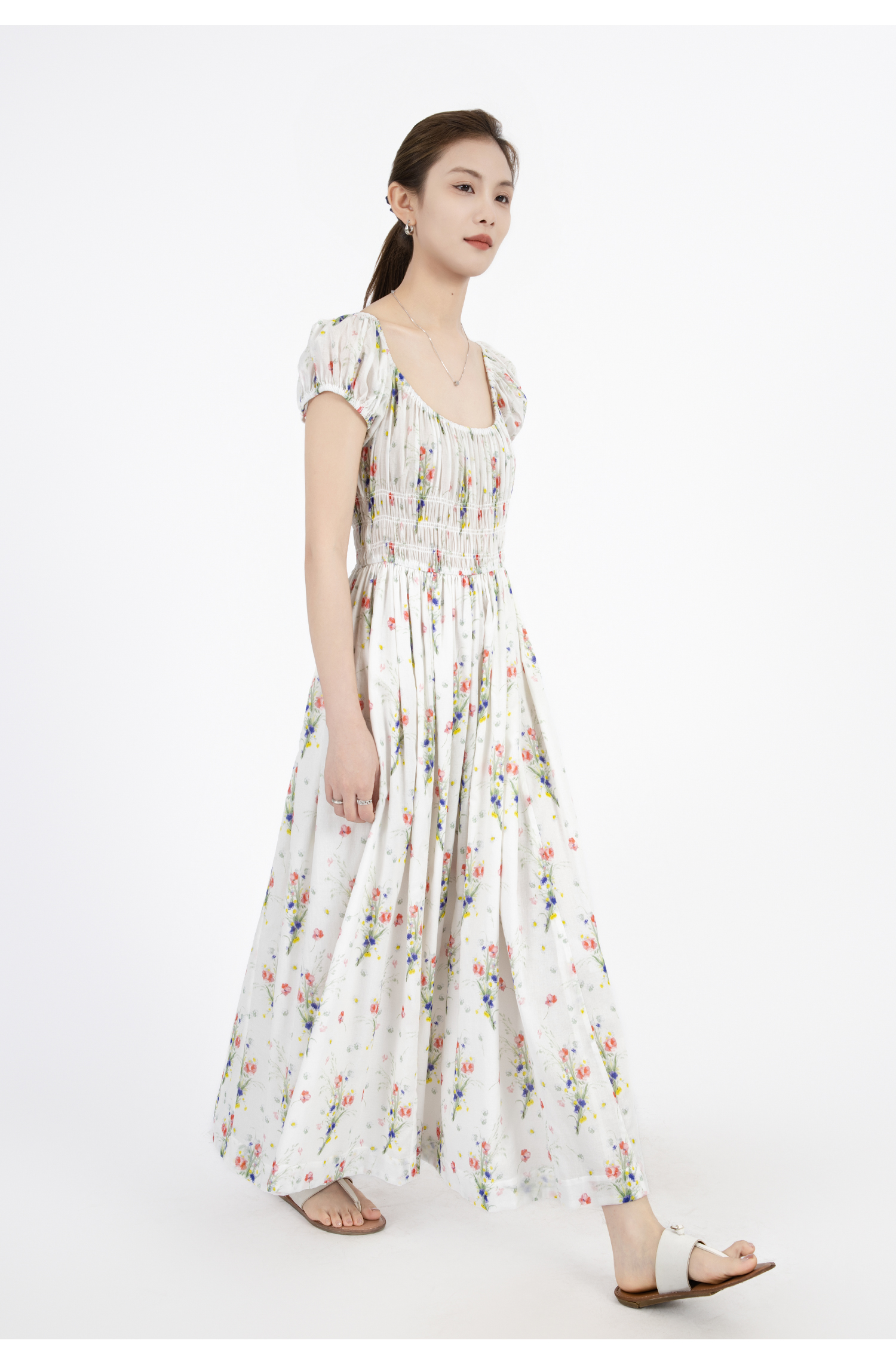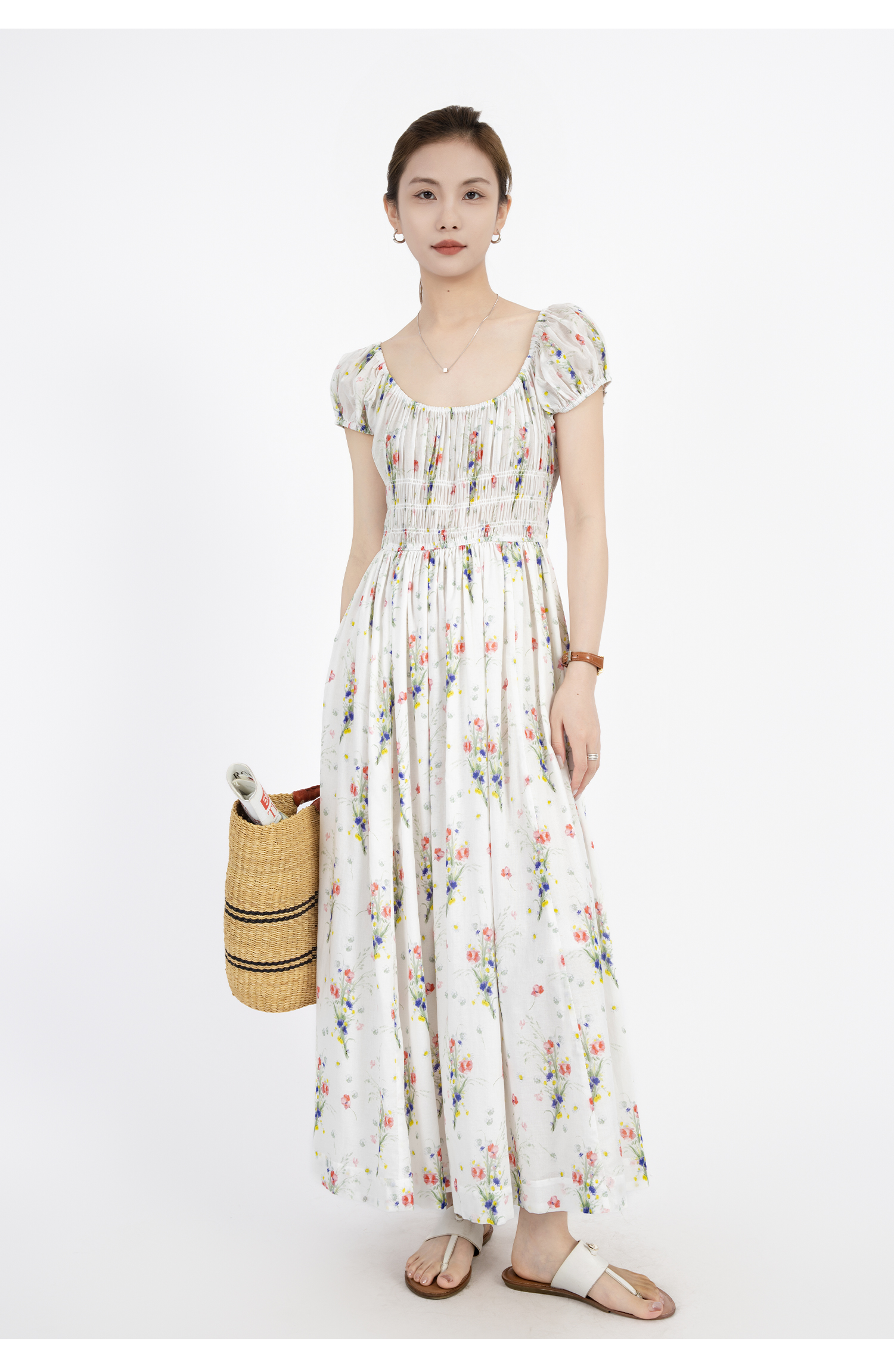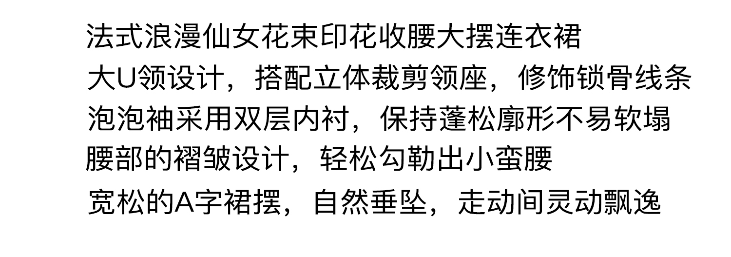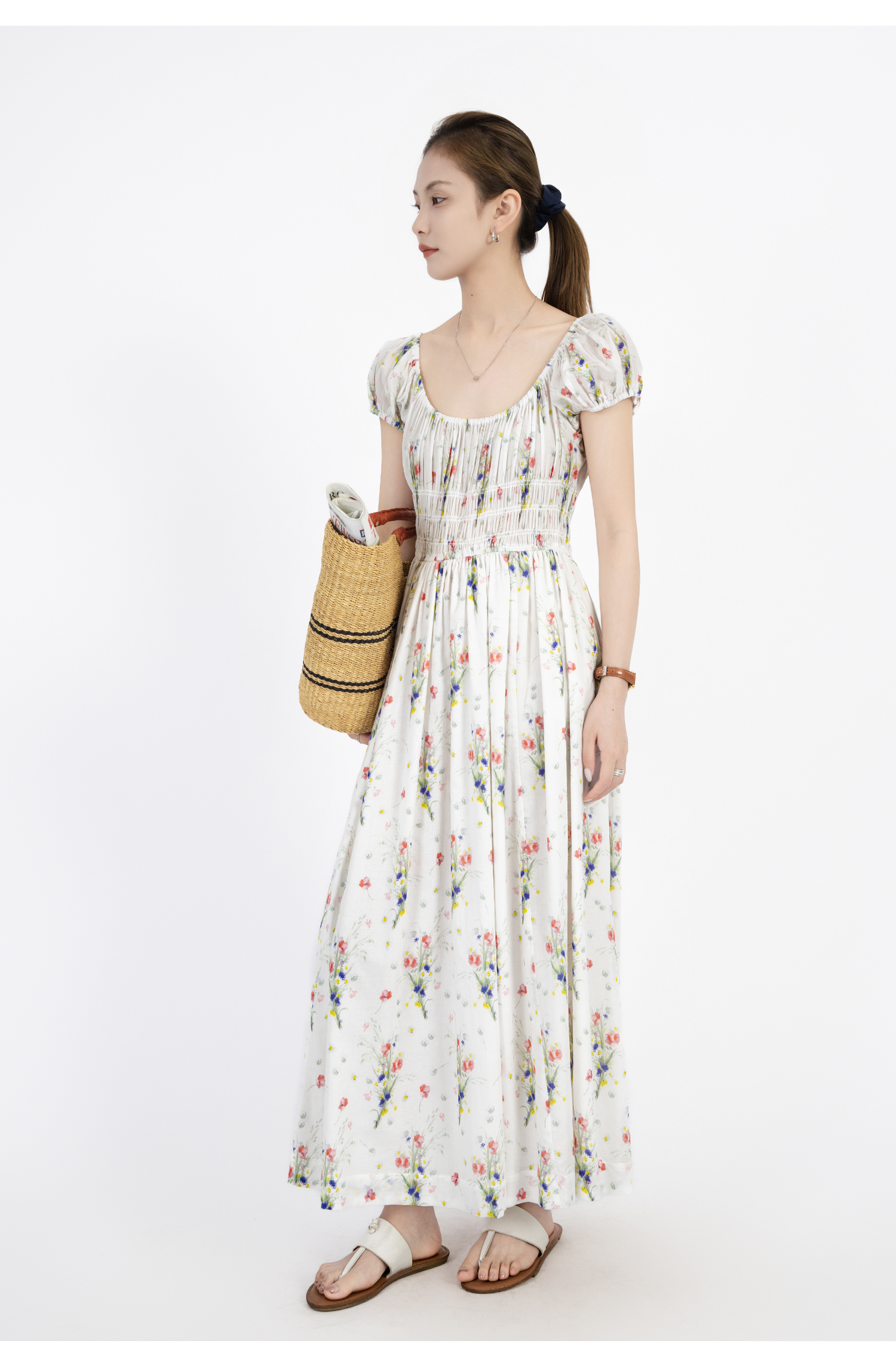幾何單元復古度假風收腰大擺裙子法式浪漫仙女花束印花連衣裙