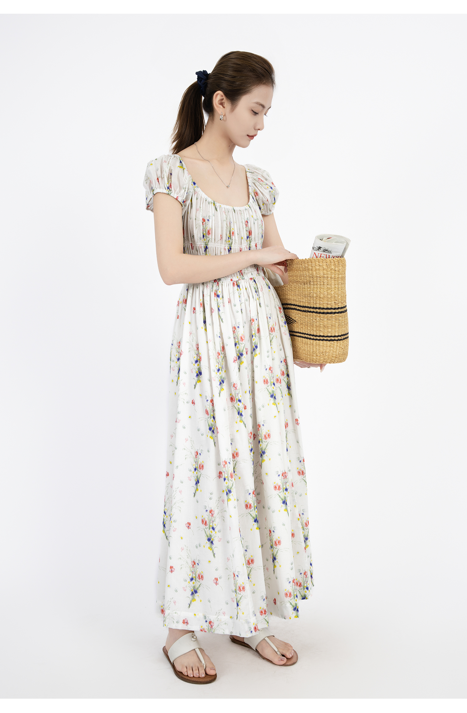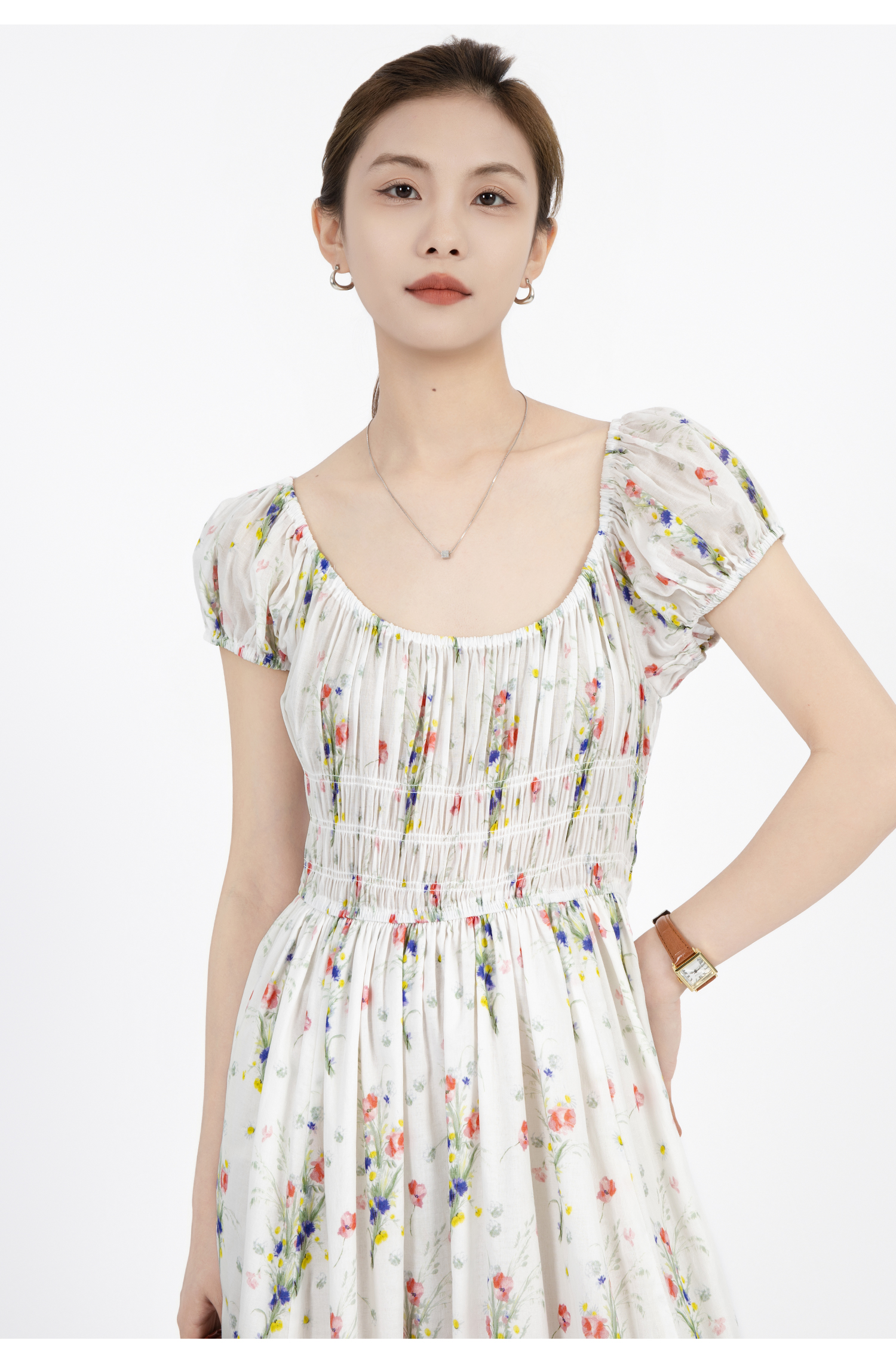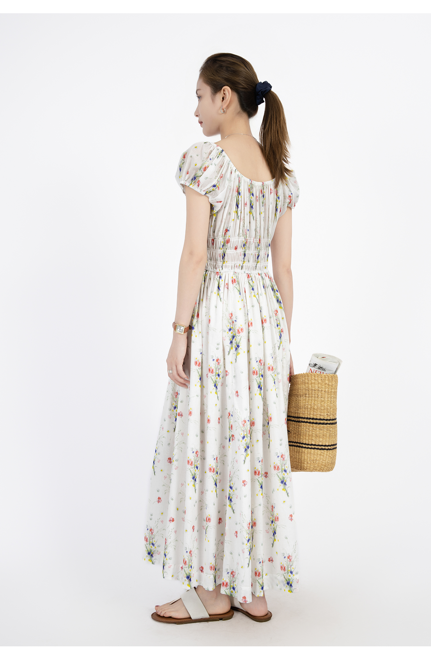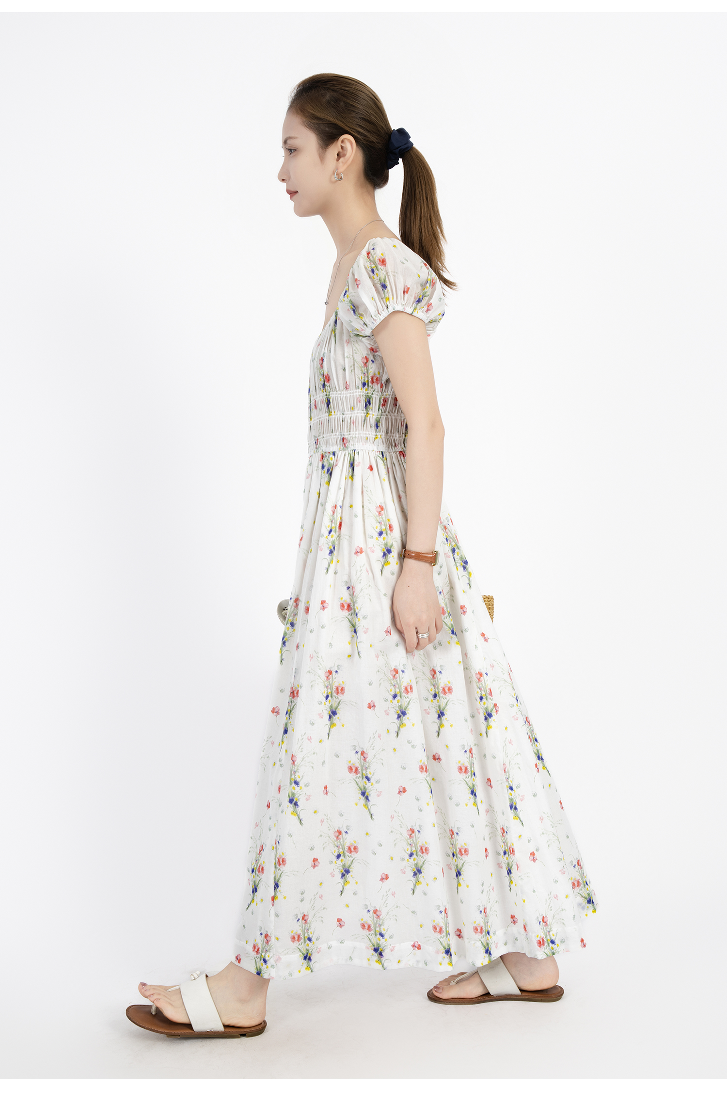 幾何單元復古度假風收腰大擺裙子法式浪漫仙女花束印花連衣裙