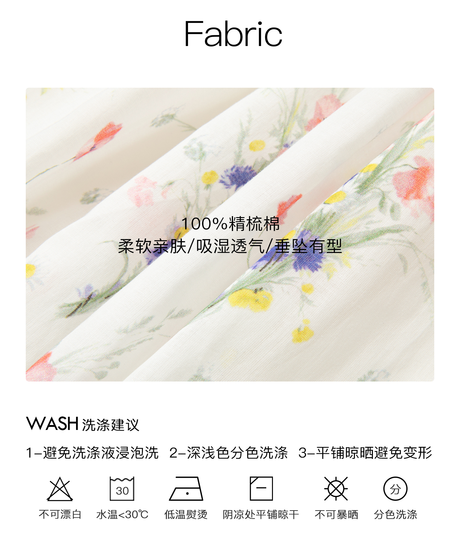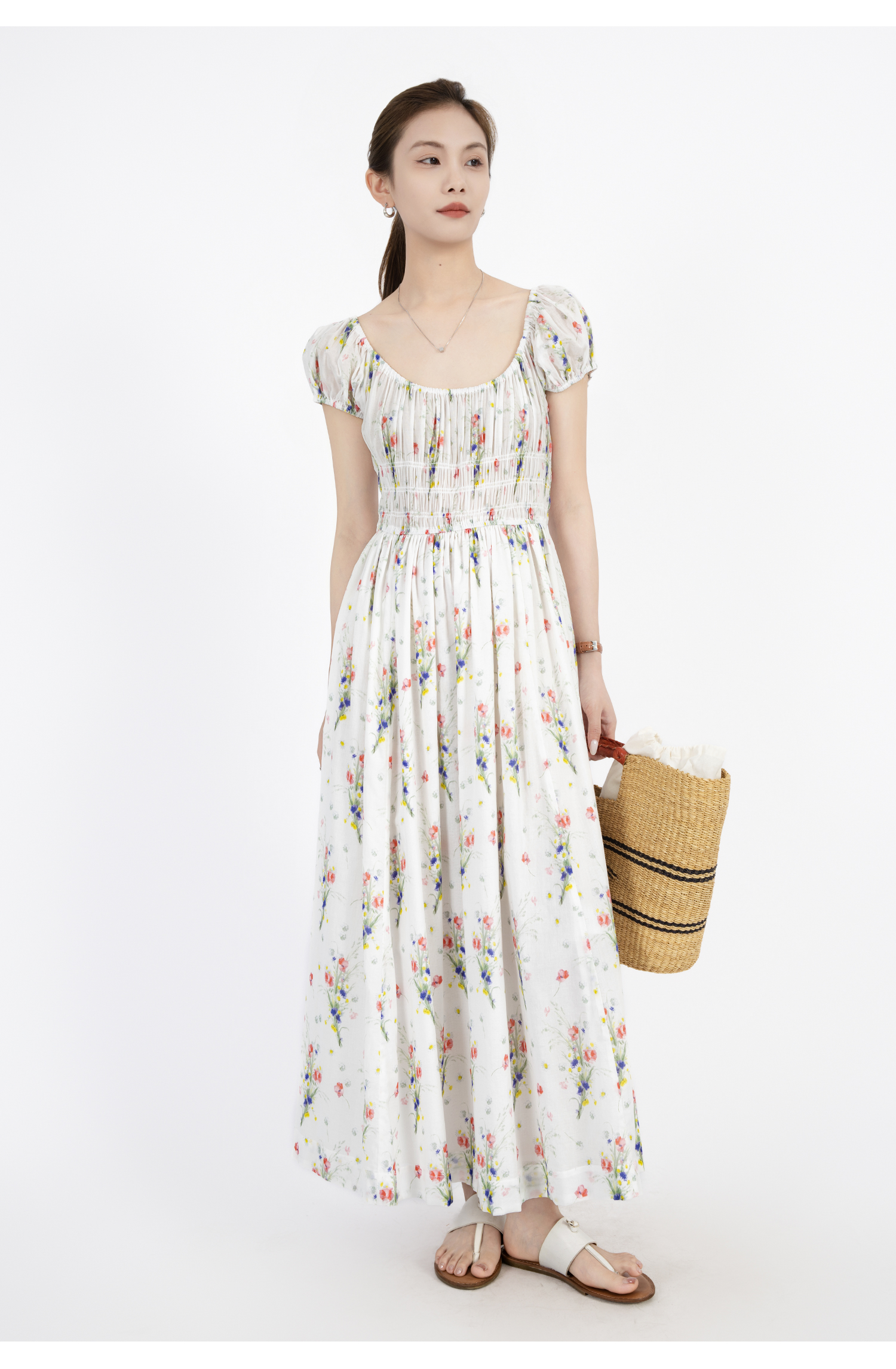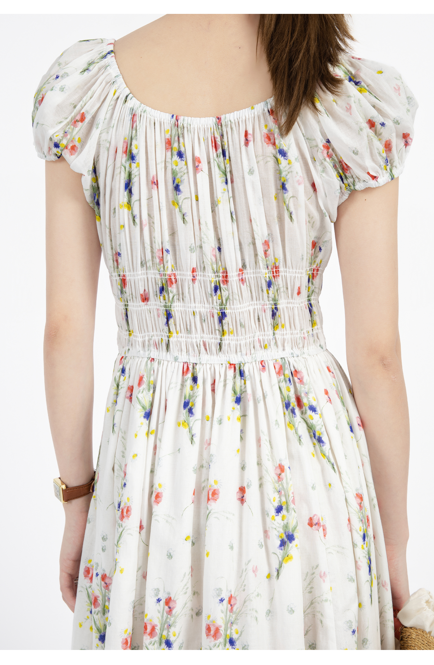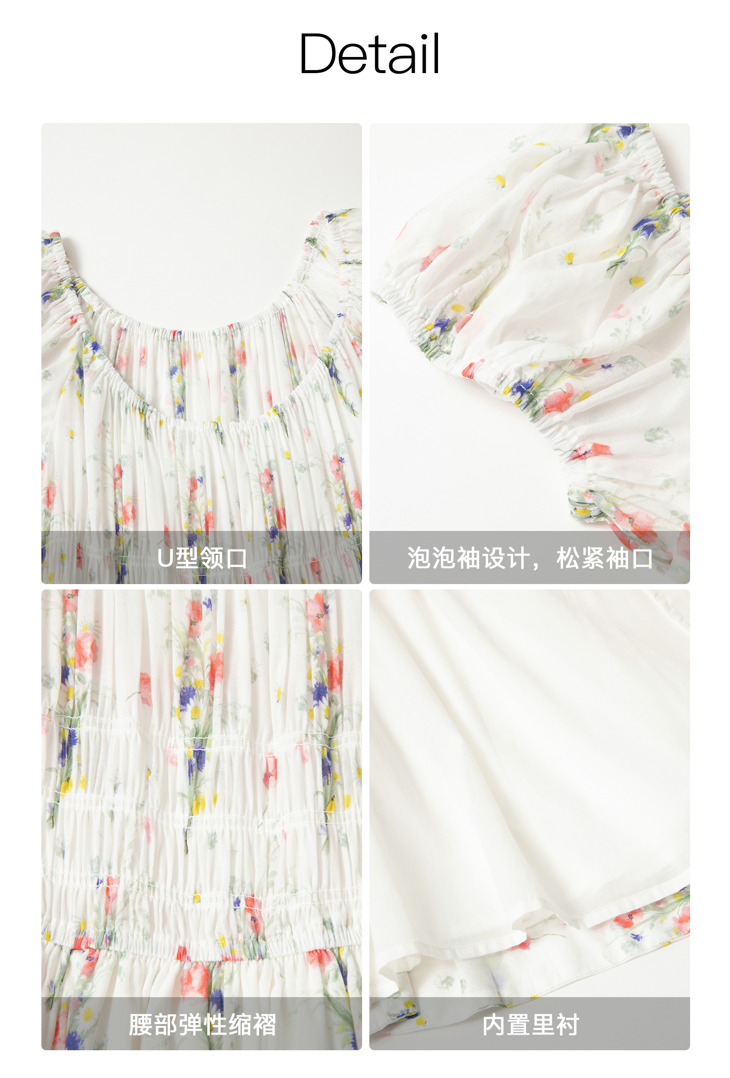 幾何單元復古度假風收腰大擺裙子法式浪漫仙女花束印花連衣裙