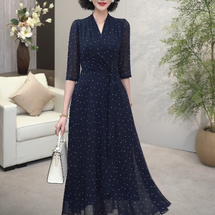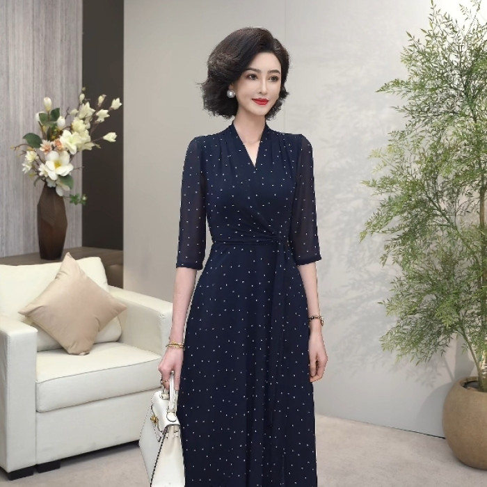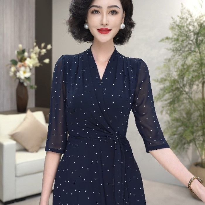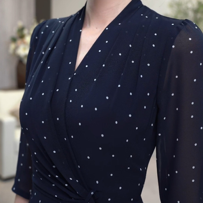 2025藏藍色包裹V領靈動水玉小波點萊賽爾天絲喬其紗連衣裙WF3262
