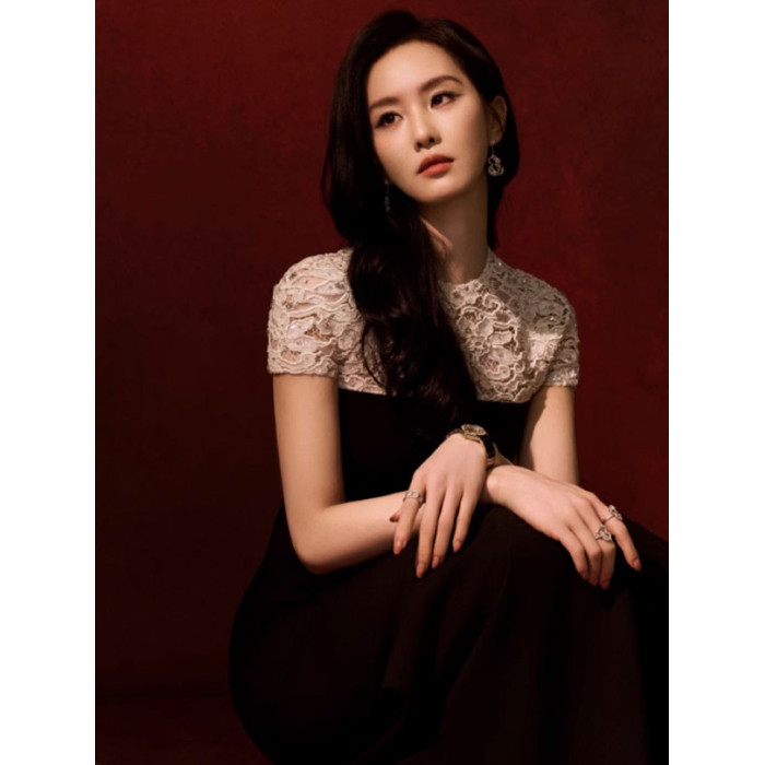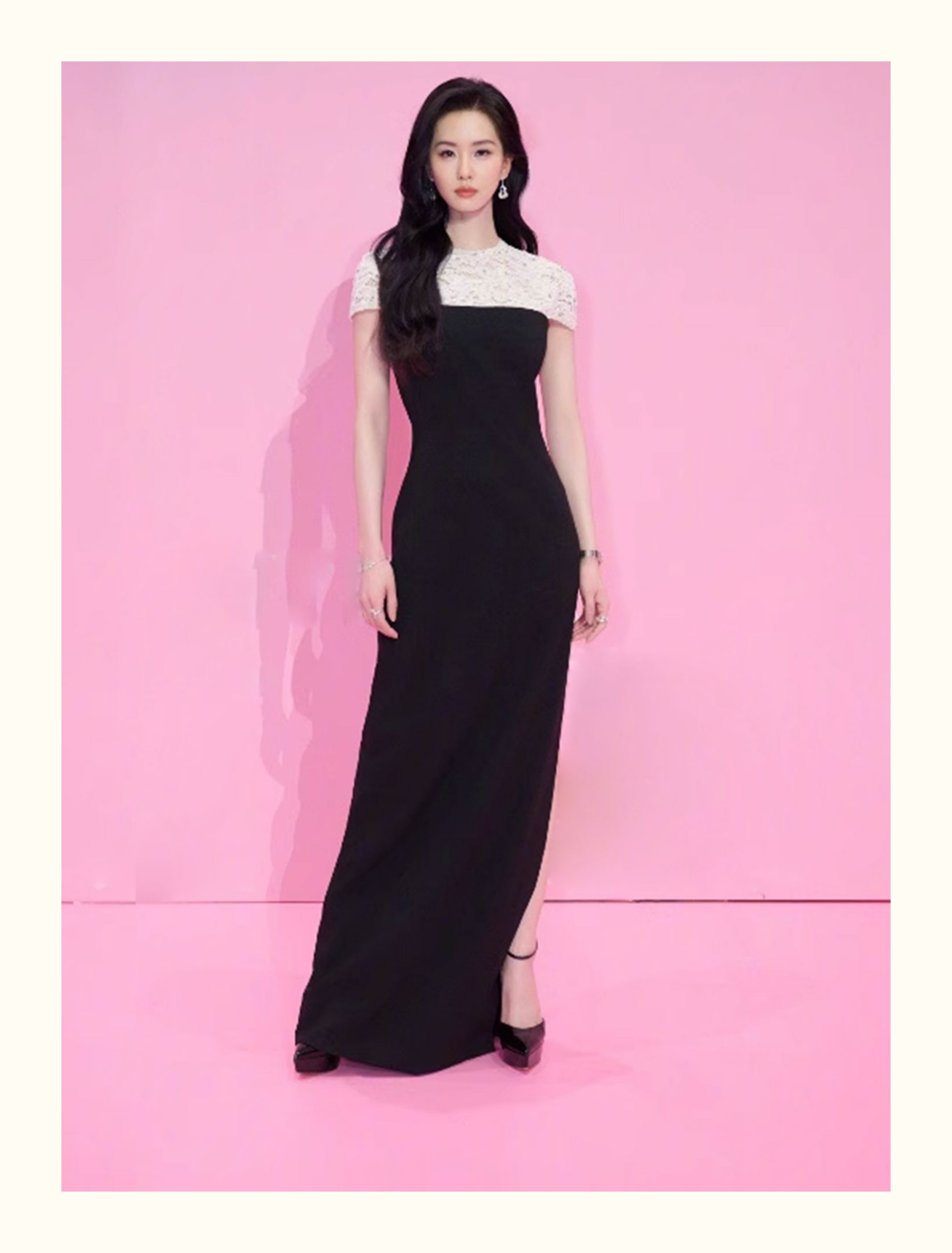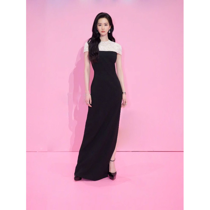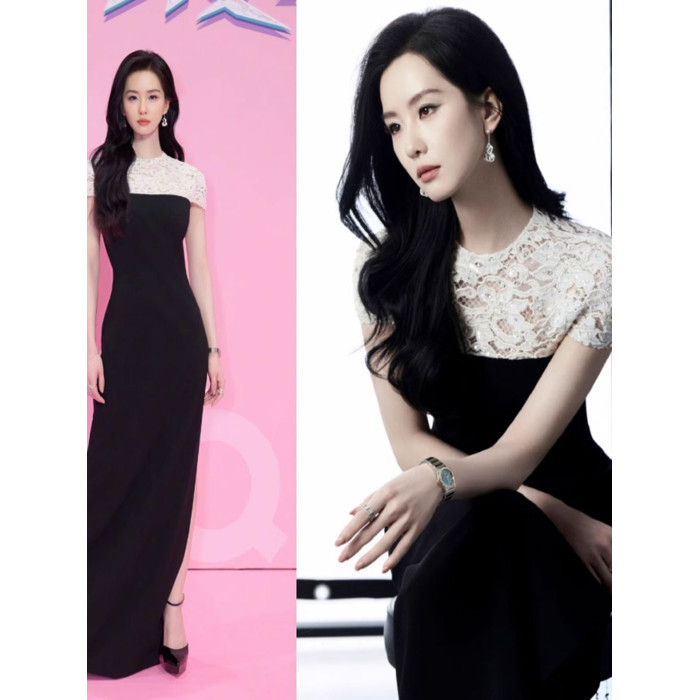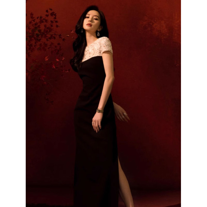 劉詩詩同款連衣裙2025新款高級感氣質黑白拼接蕾絲鑲鑽重工晚禮服