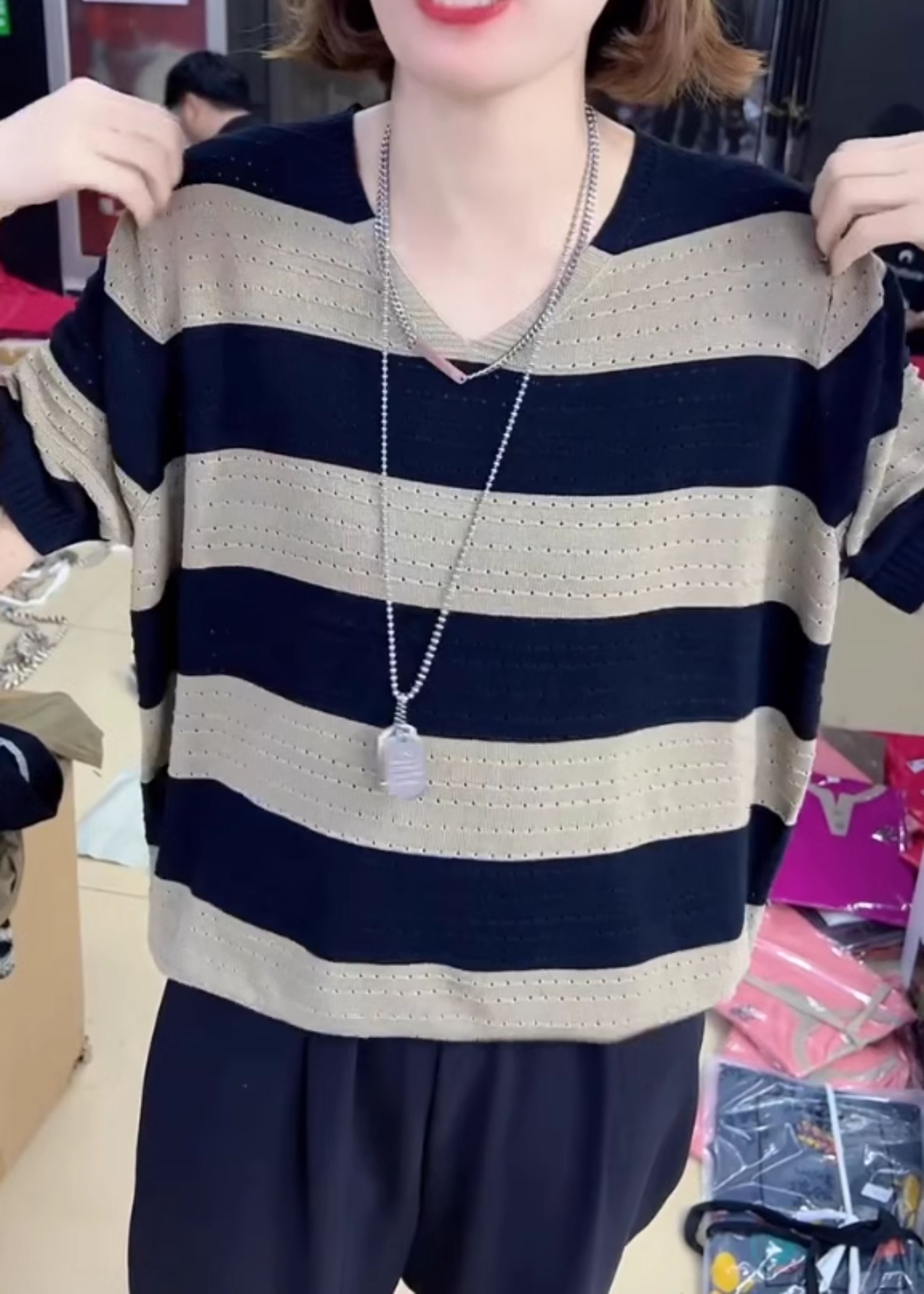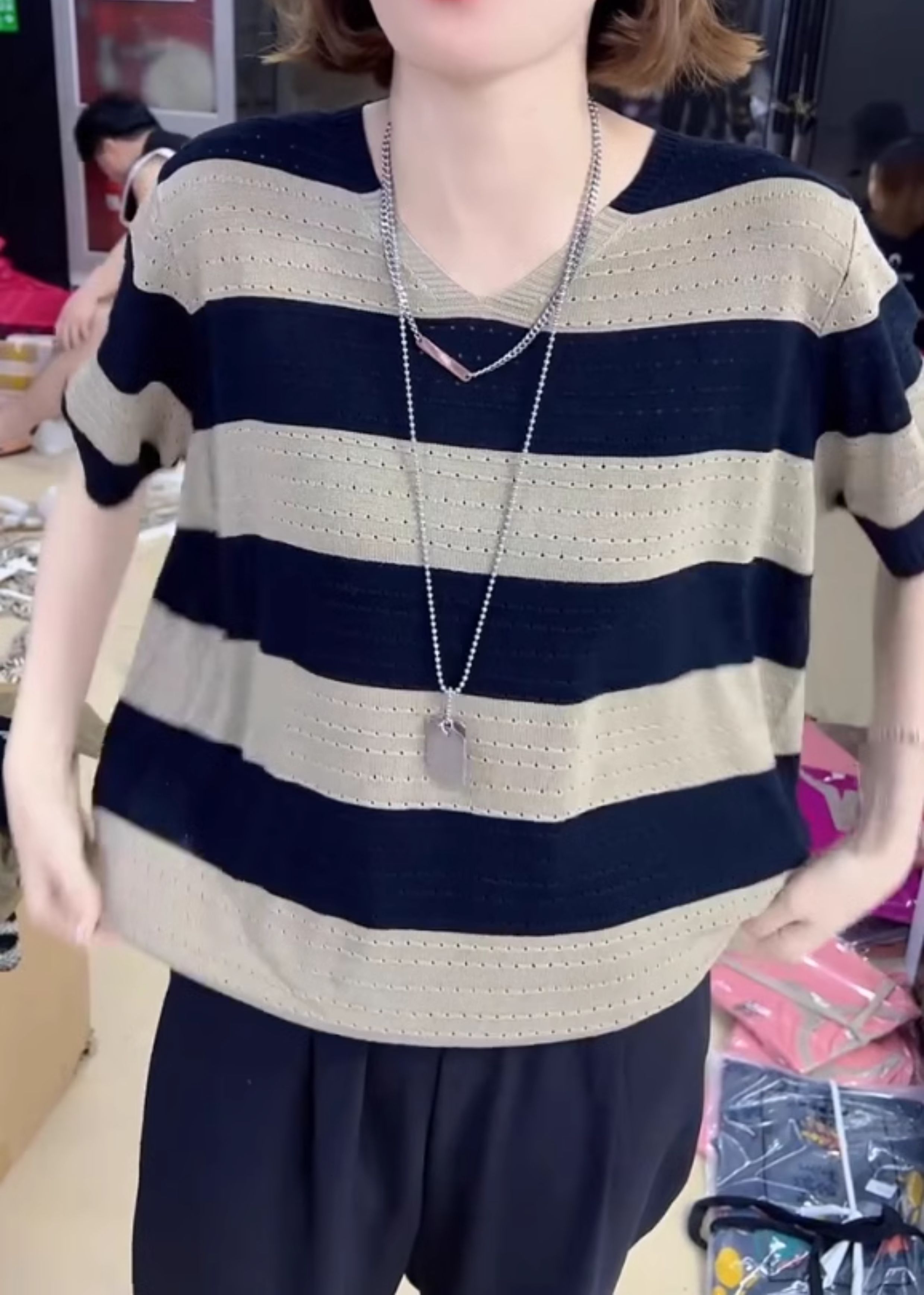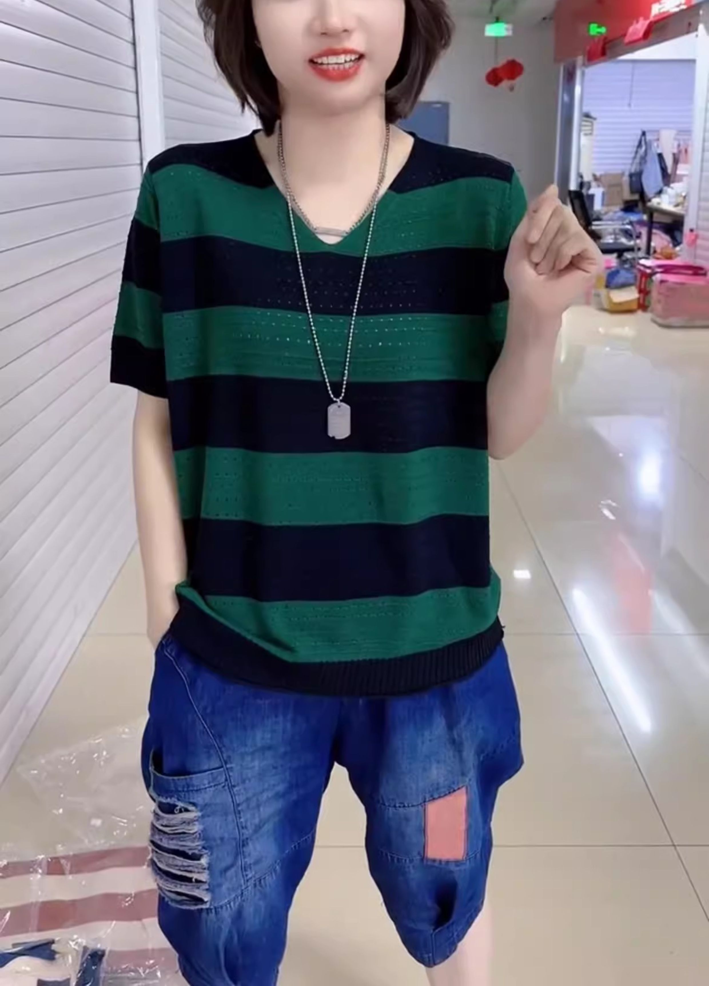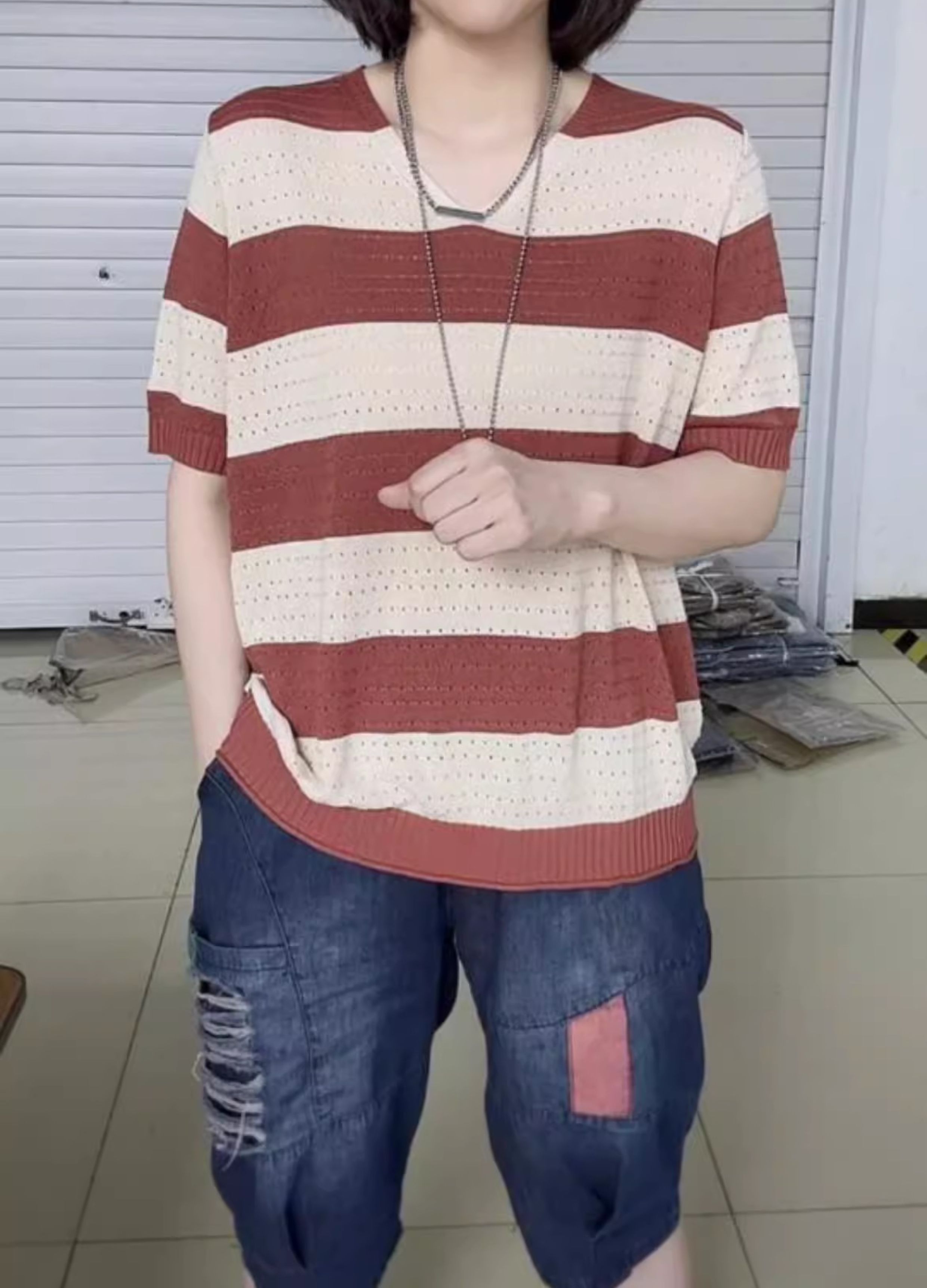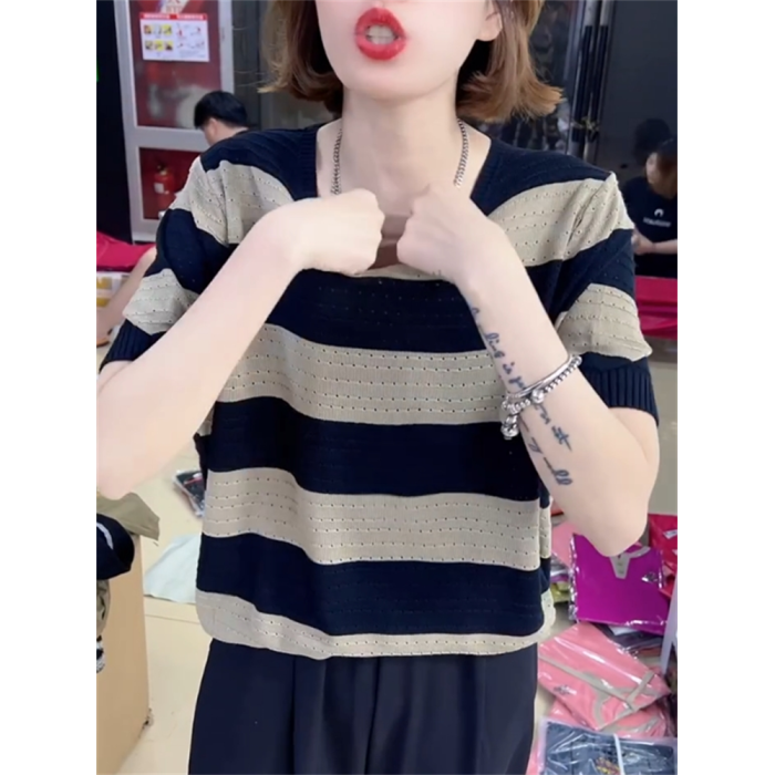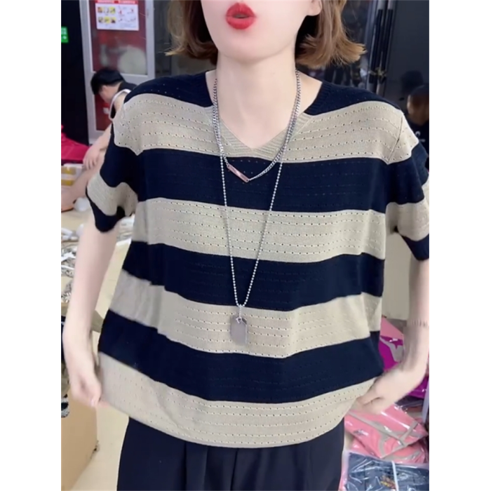 2024年寬松休閒風V領設計針織衫鏤空透氣夏季條紋短袖打底衫女裝