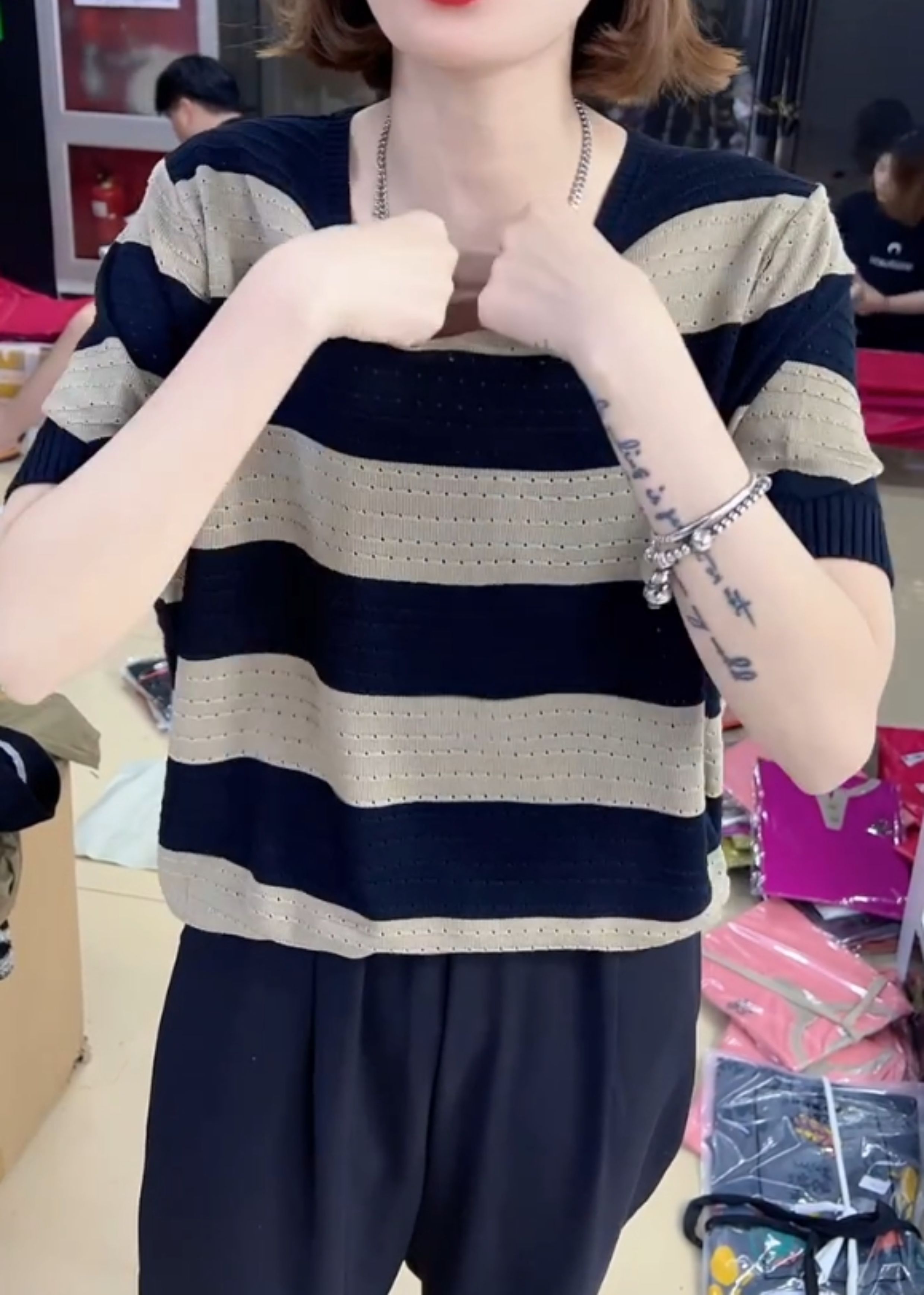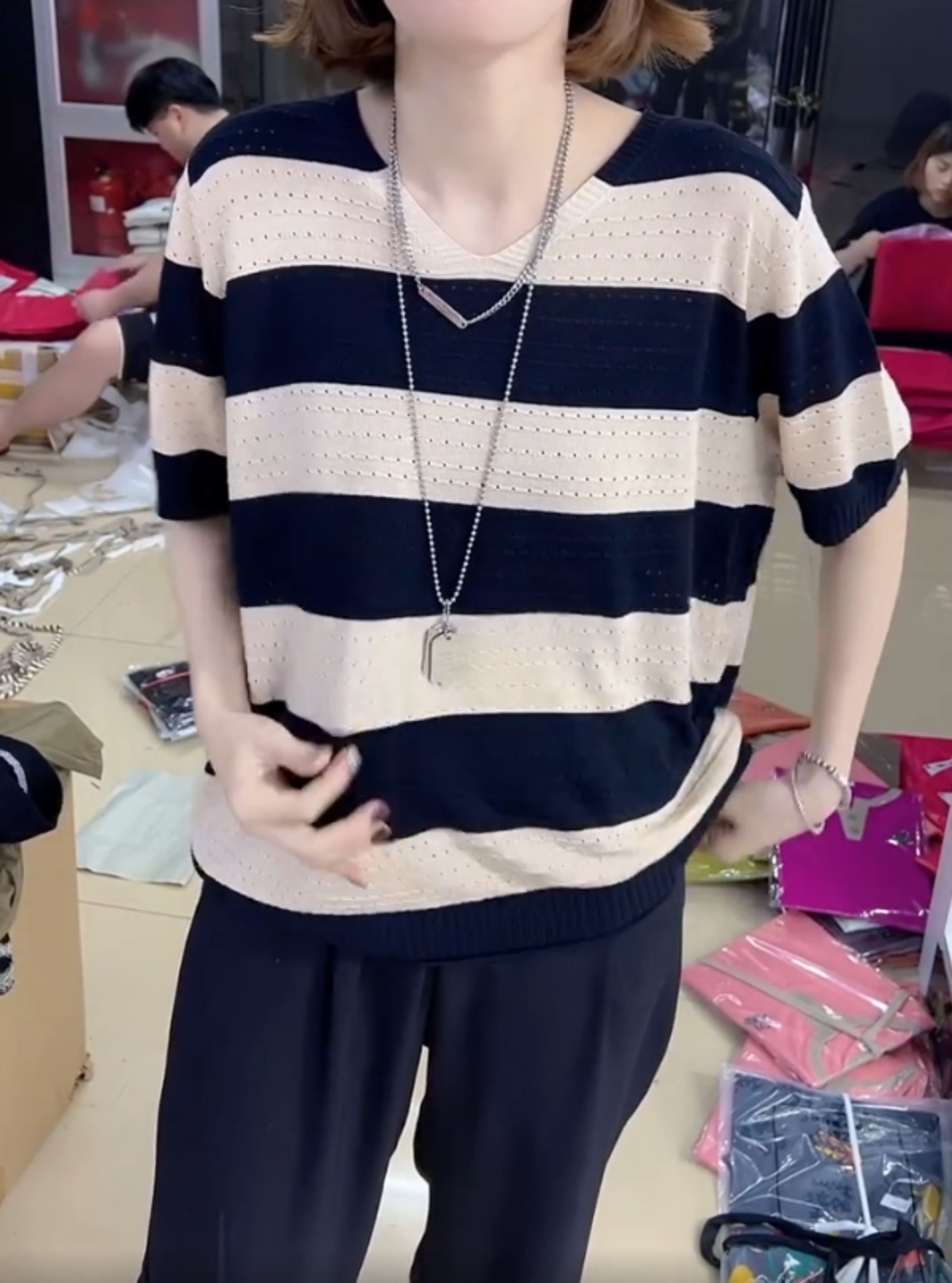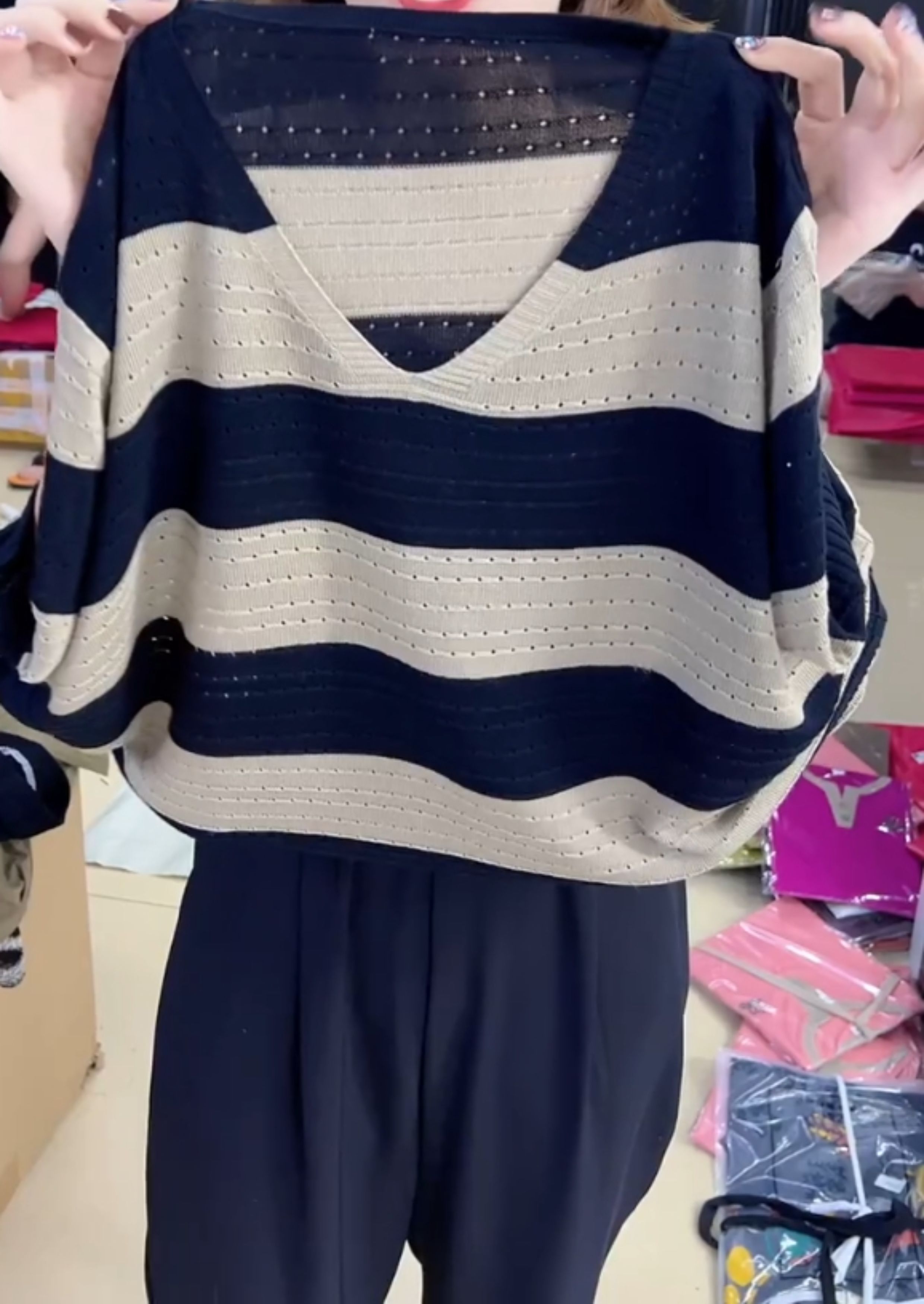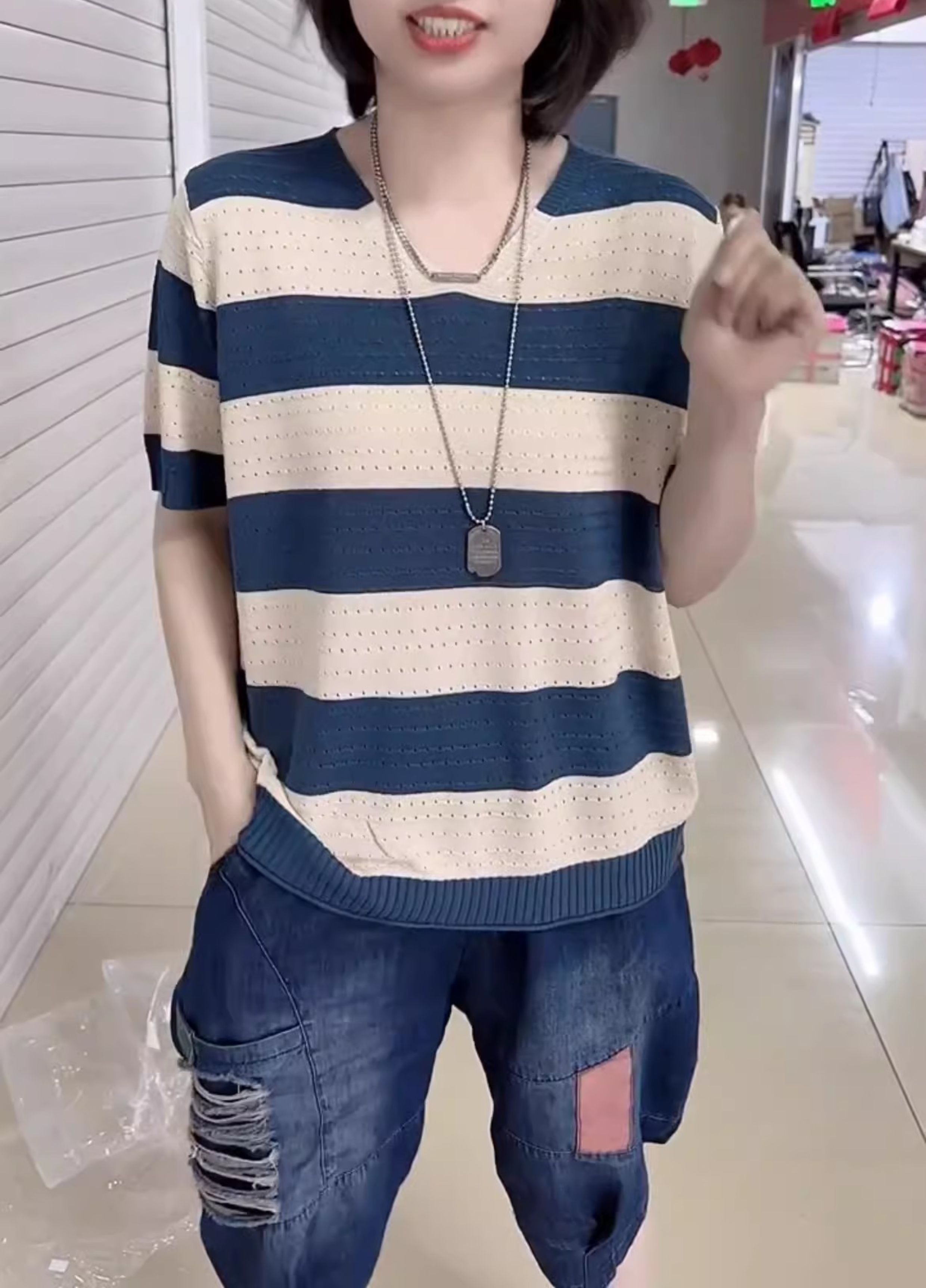 2024年寬松休閒風V領設計針織衫鏤空透氣夏季條紋短袖打底衫女裝