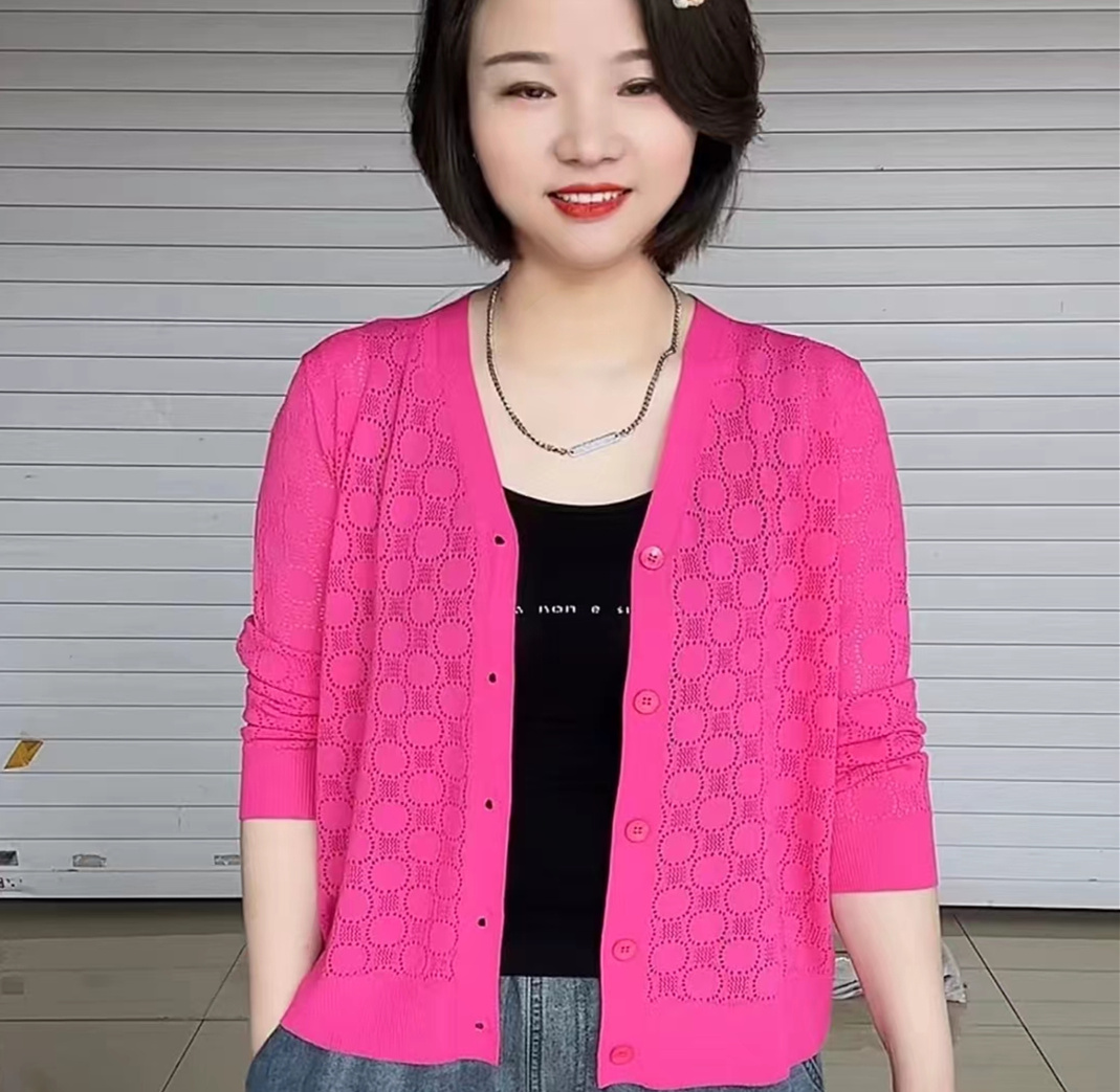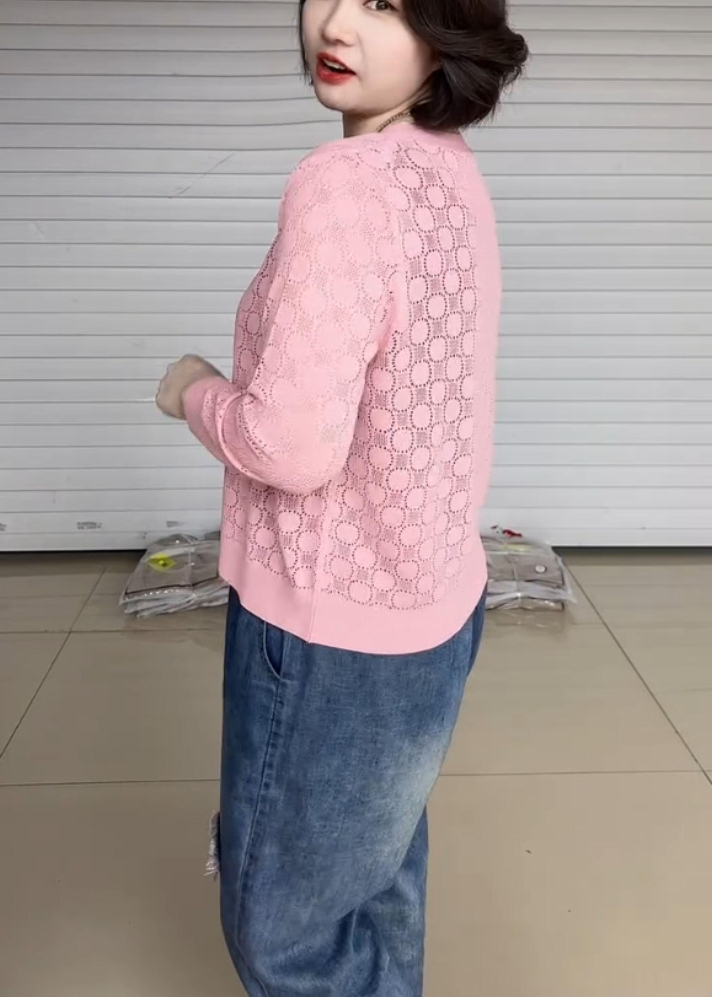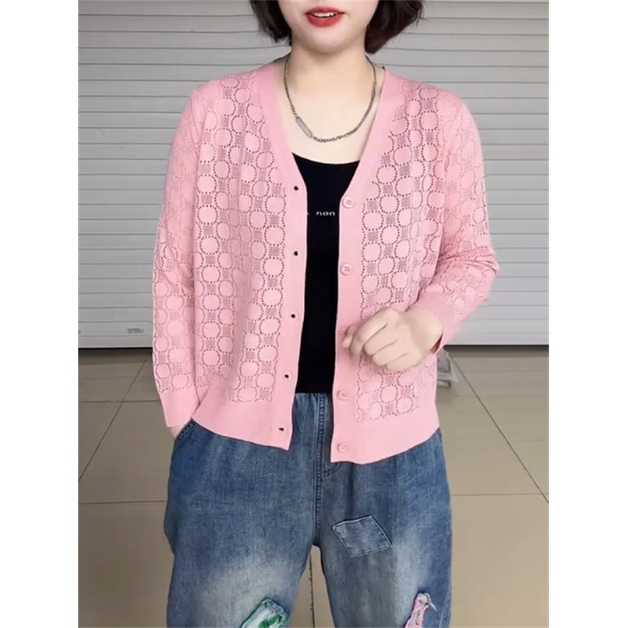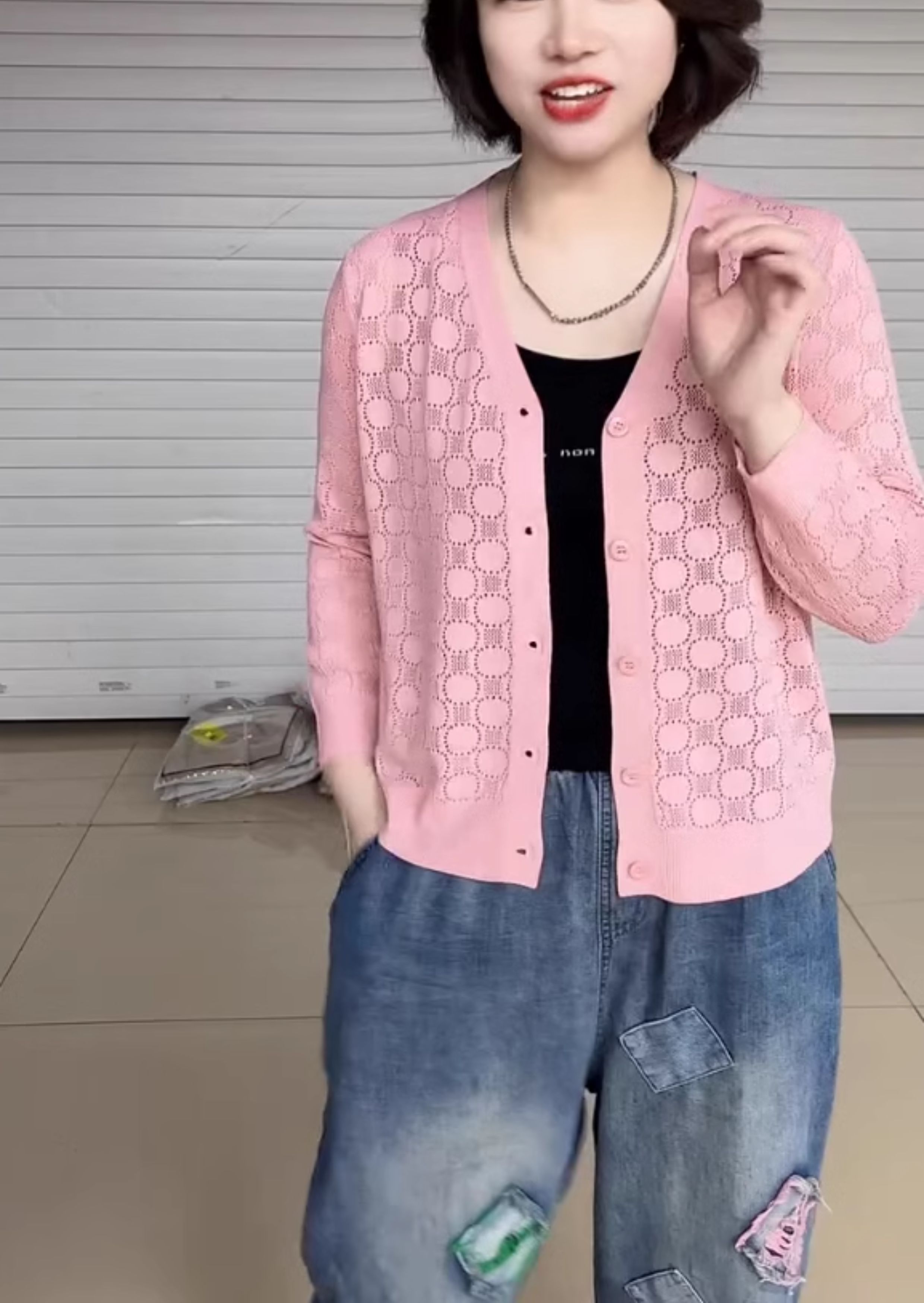 V領鏤空薄款夏季親膚透氣針織開衫小個子百搭粉色甜美防曬打底衫