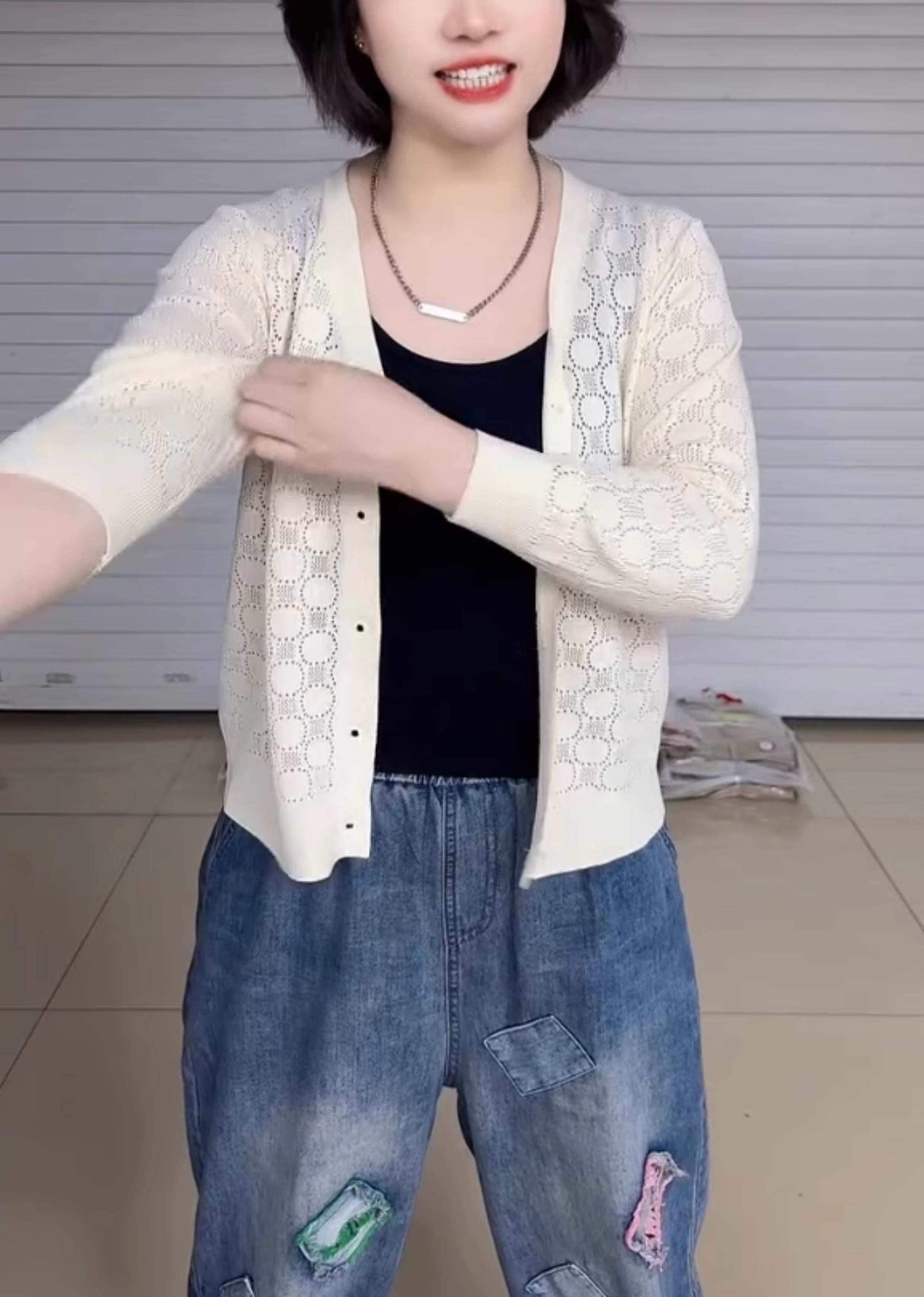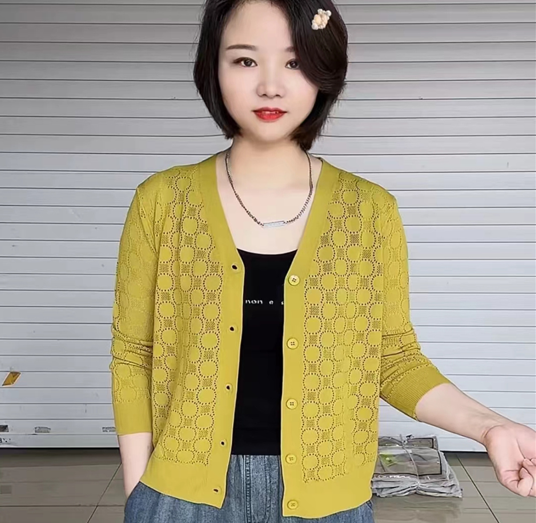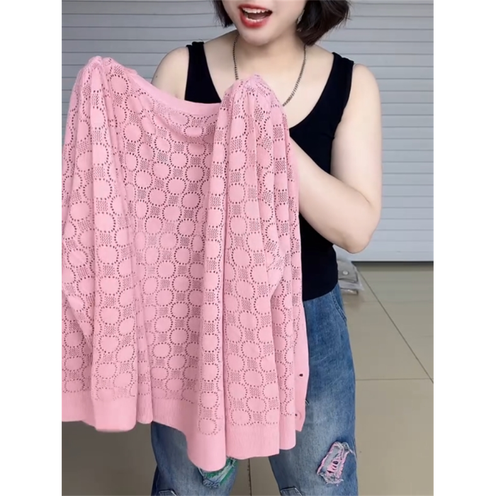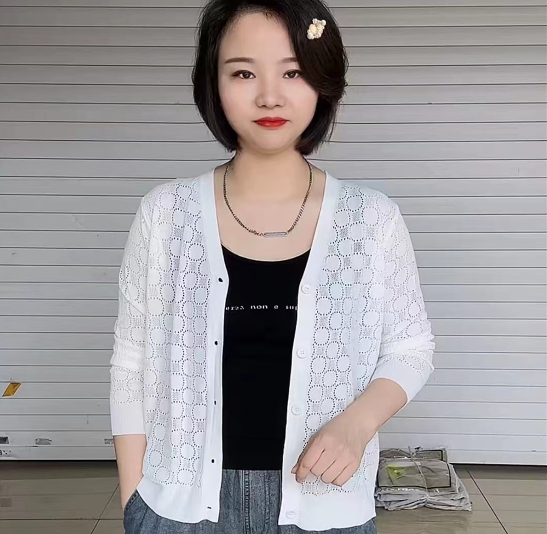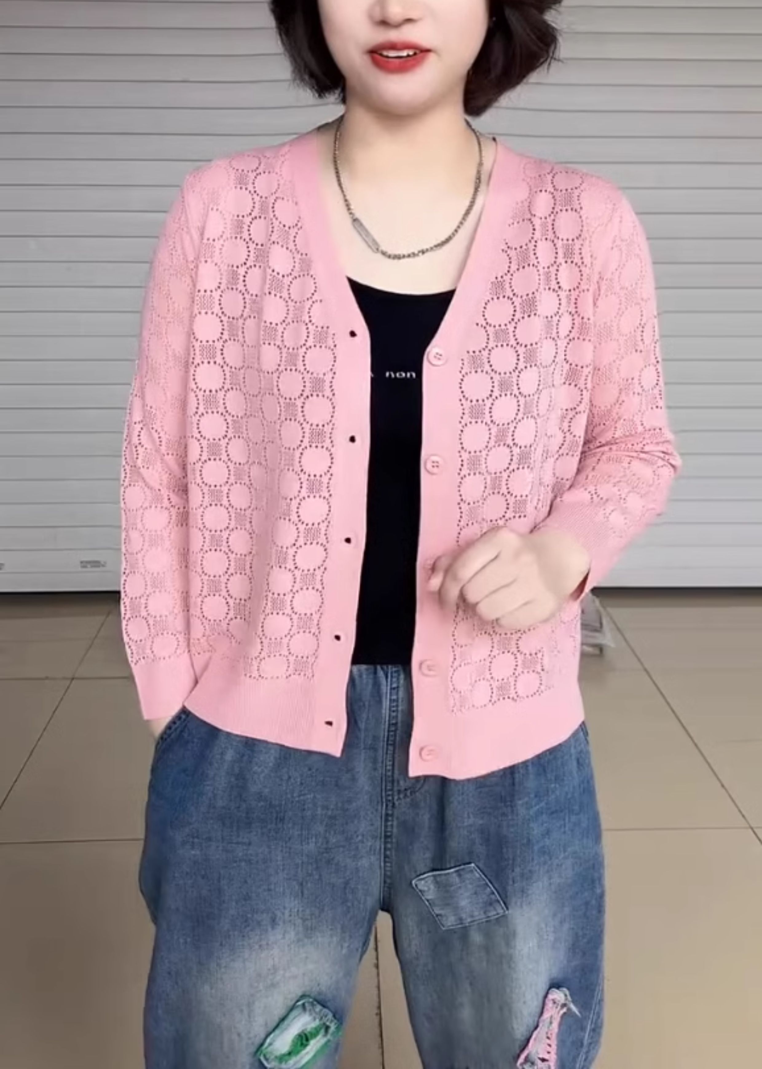 V領鏤空薄款夏季親膚透氣針織開衫小個子百搭粉色甜美防曬打底衫