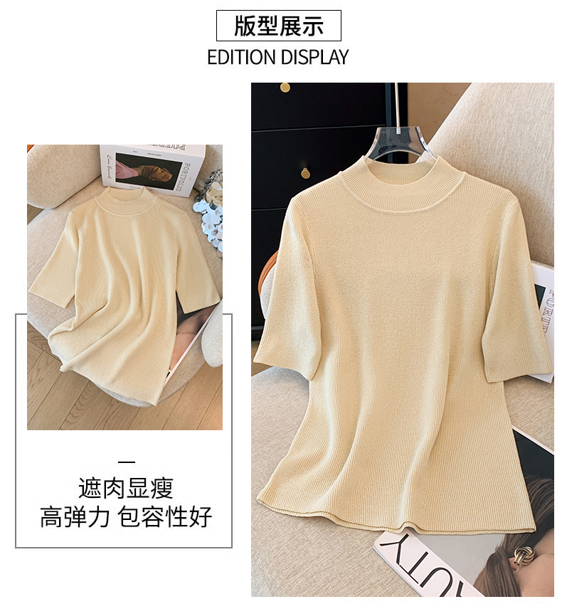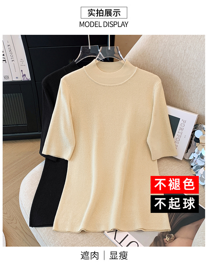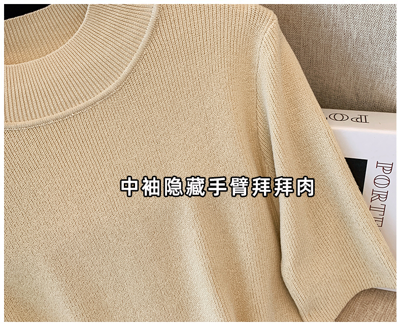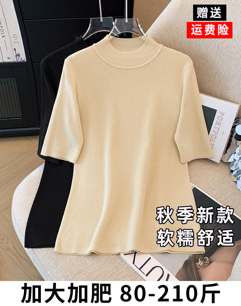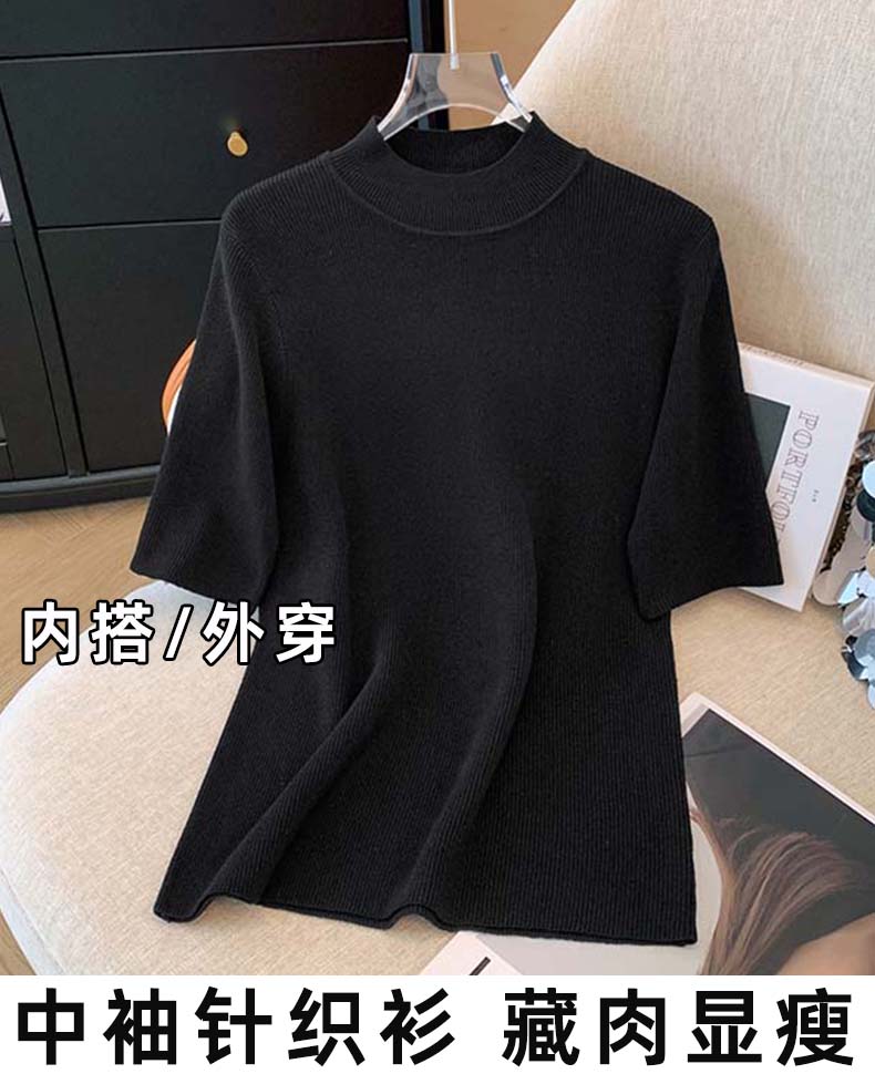 胖mm顯瘦正肩半高領中袖針織衫女大碼春秋五分袖內搭打底衫上衣