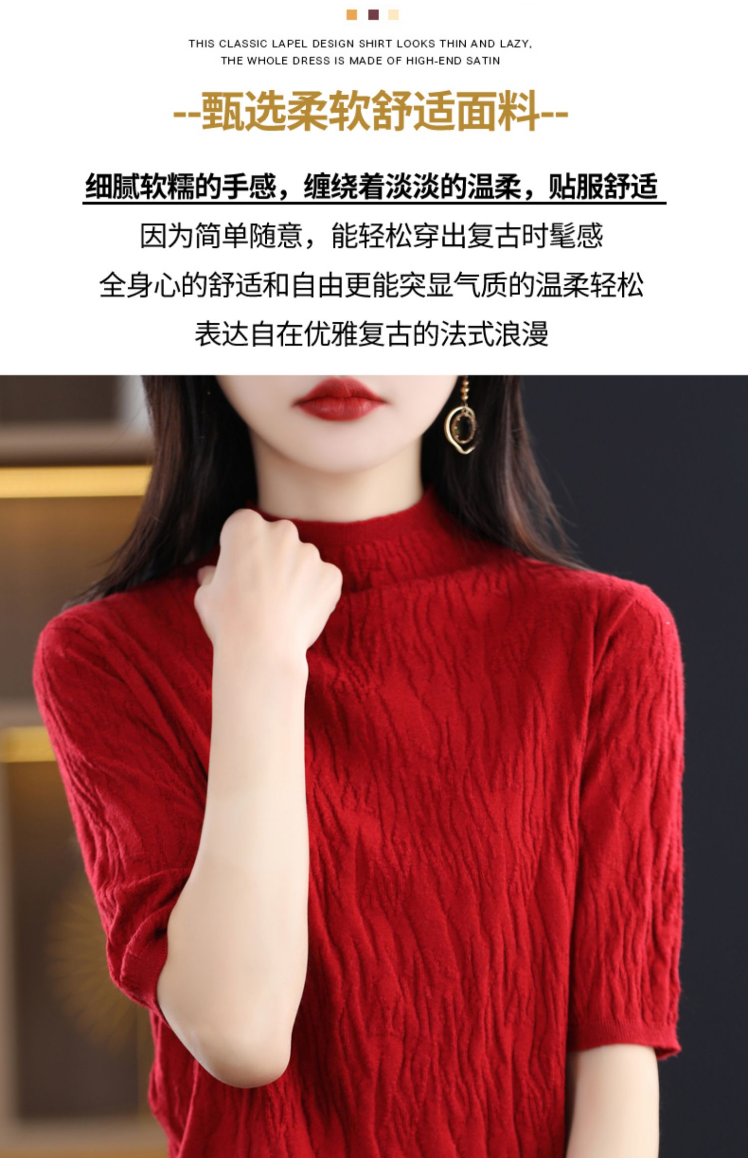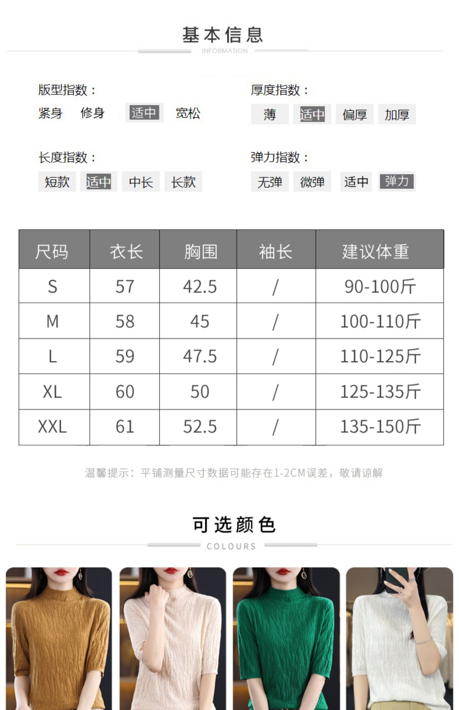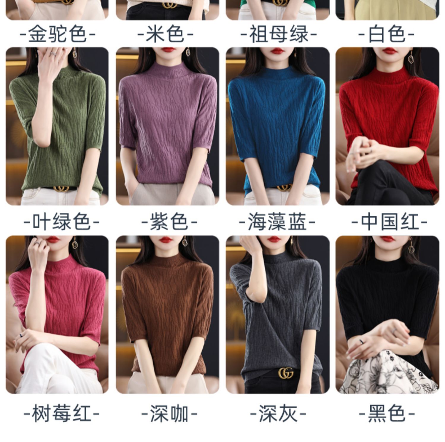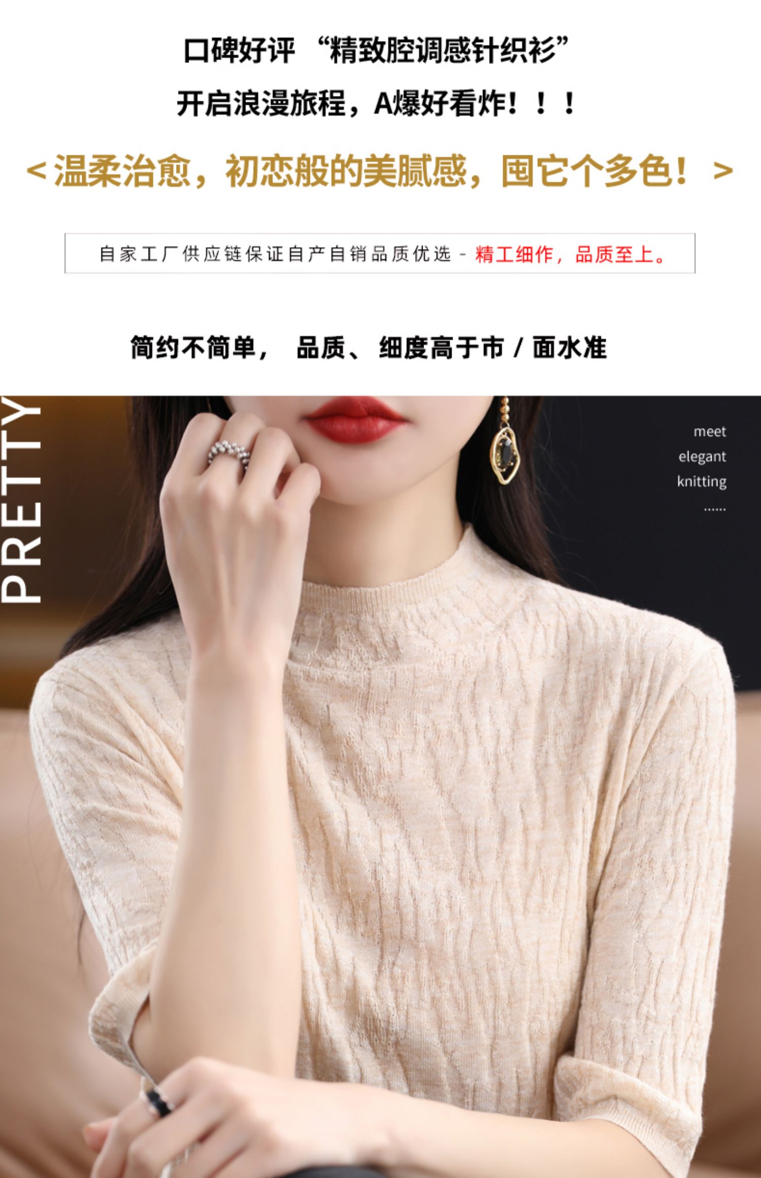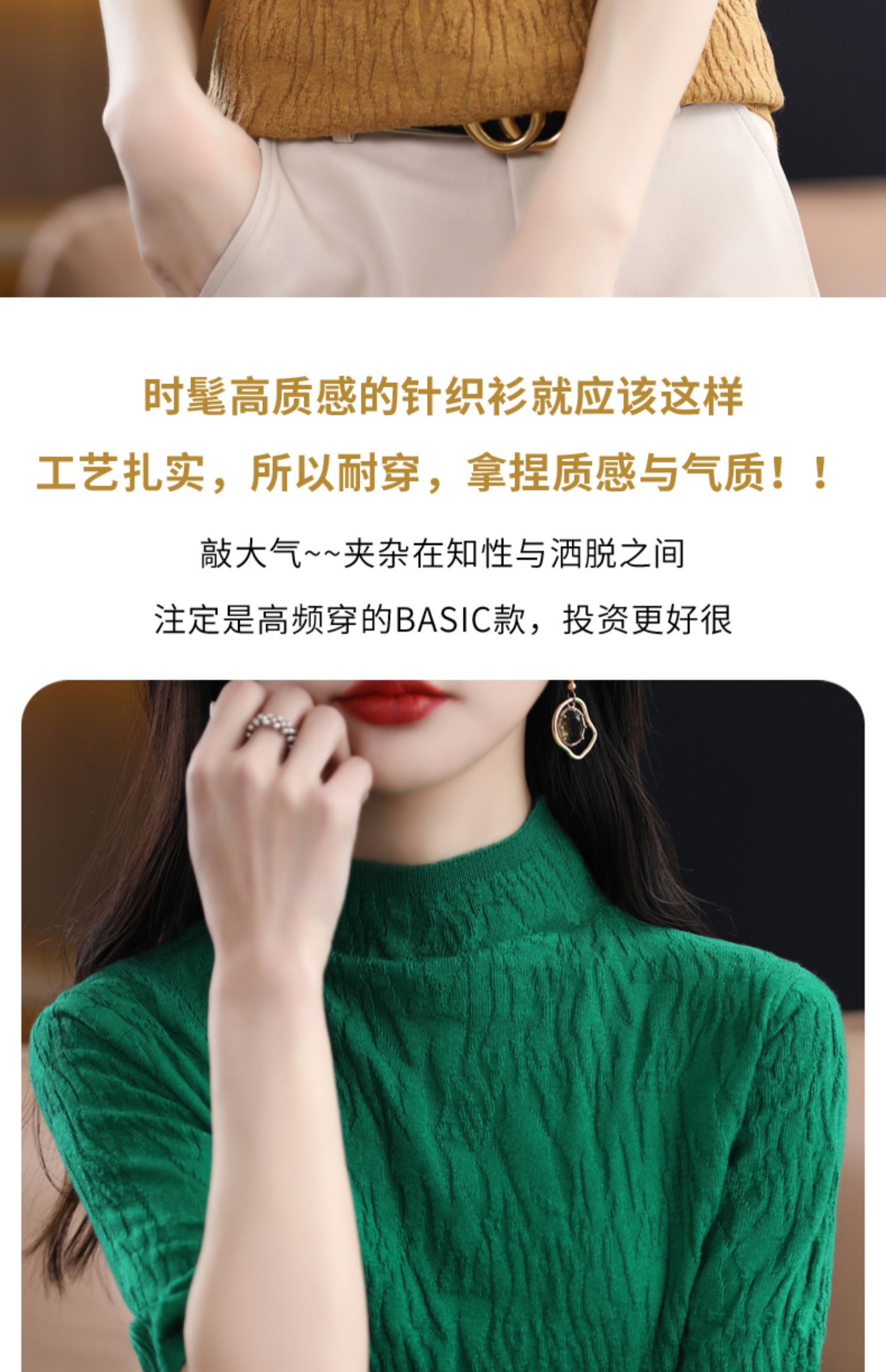 法式半高領五分袖針織打底衫女薄款秋冬時尚純色毛衣中袖大碼上衣