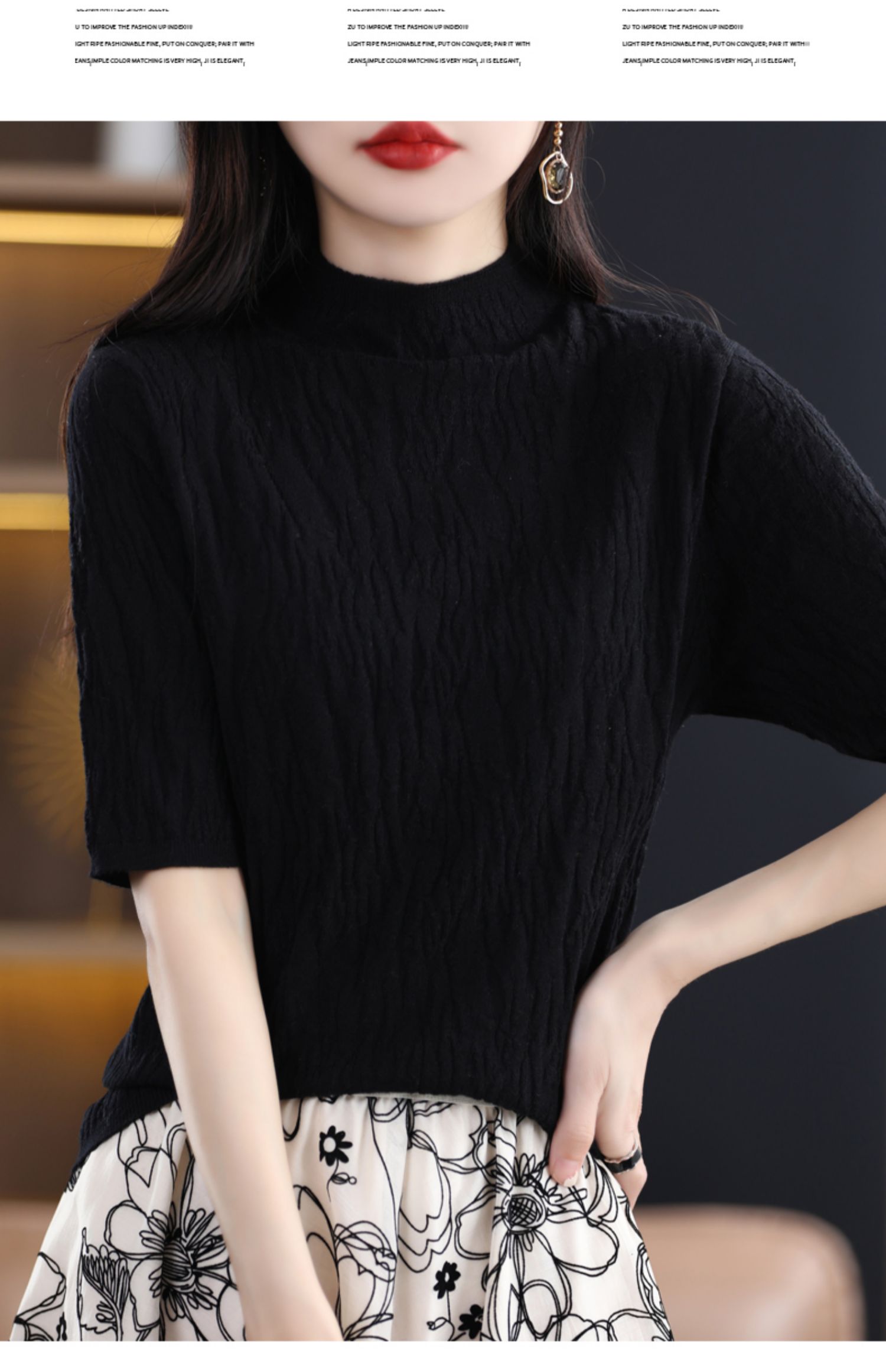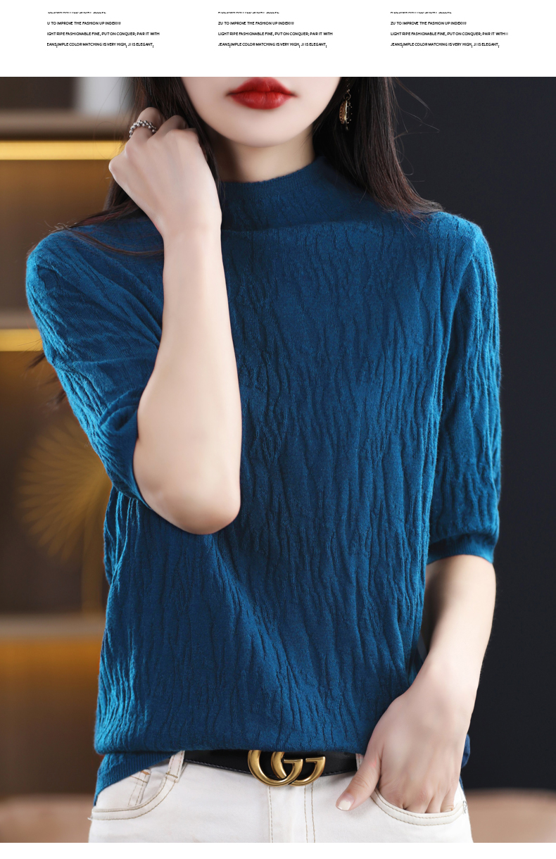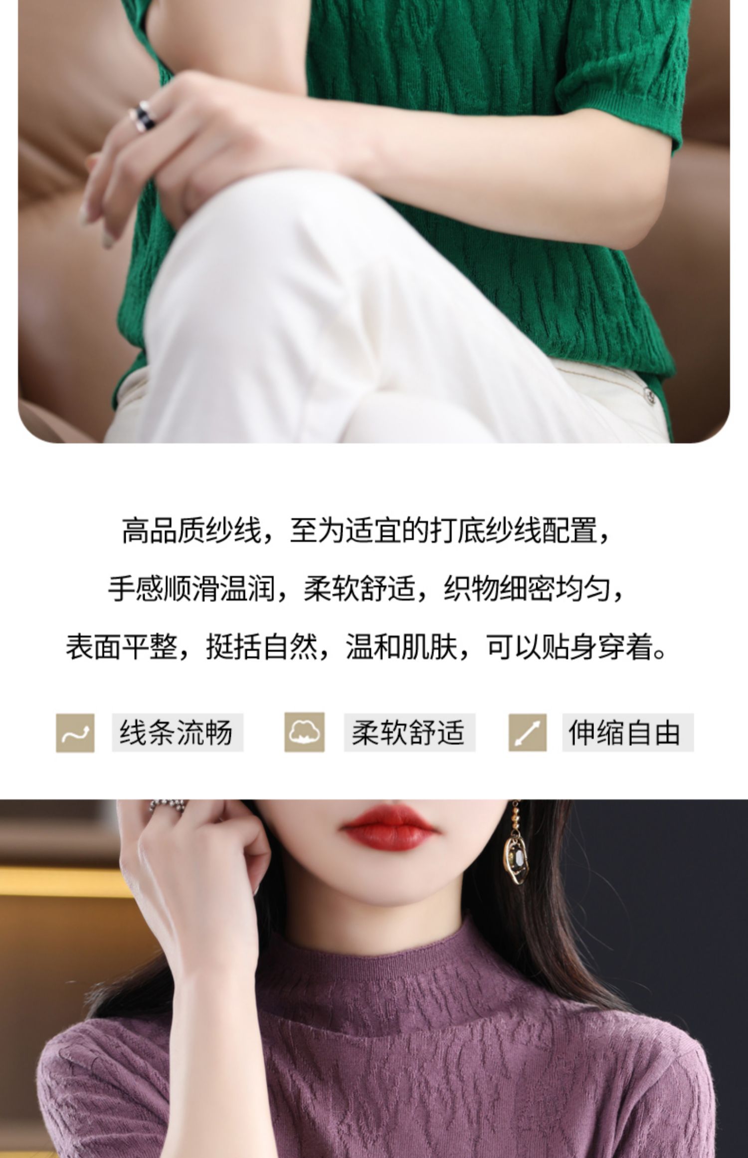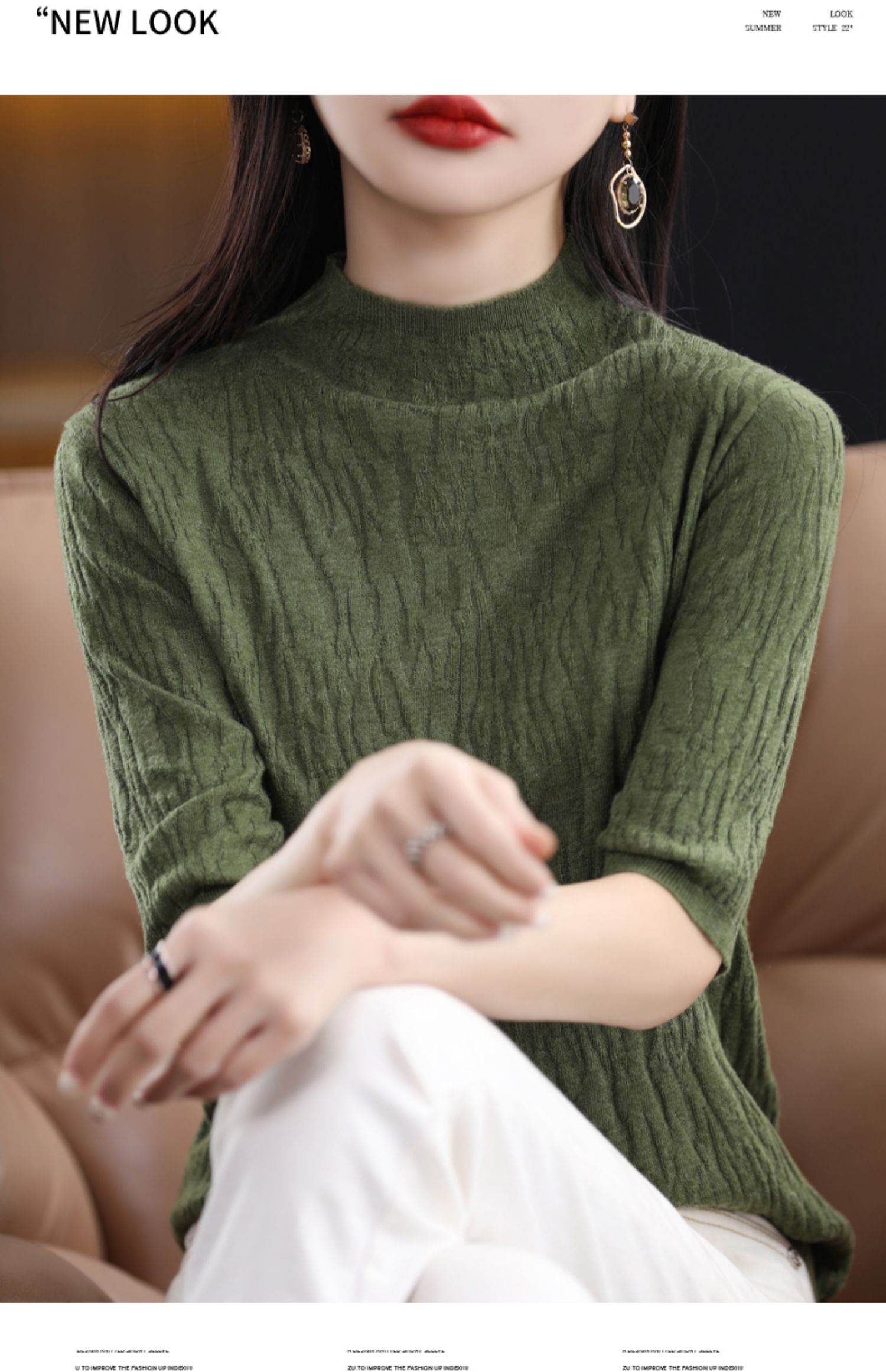 法式半高領五分袖針織打底衫女薄款秋冬時尚純色毛衣中袖大碼上衣
