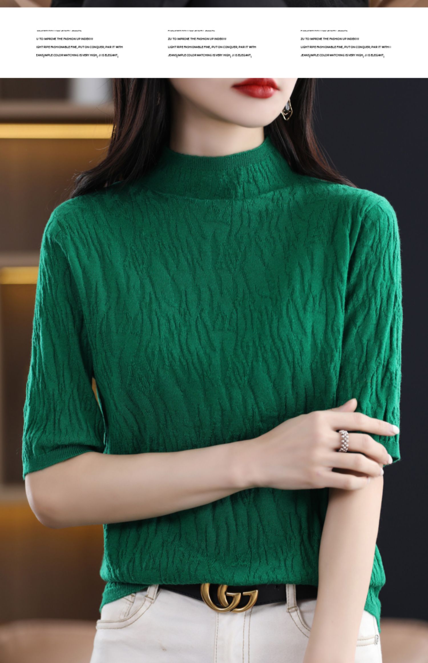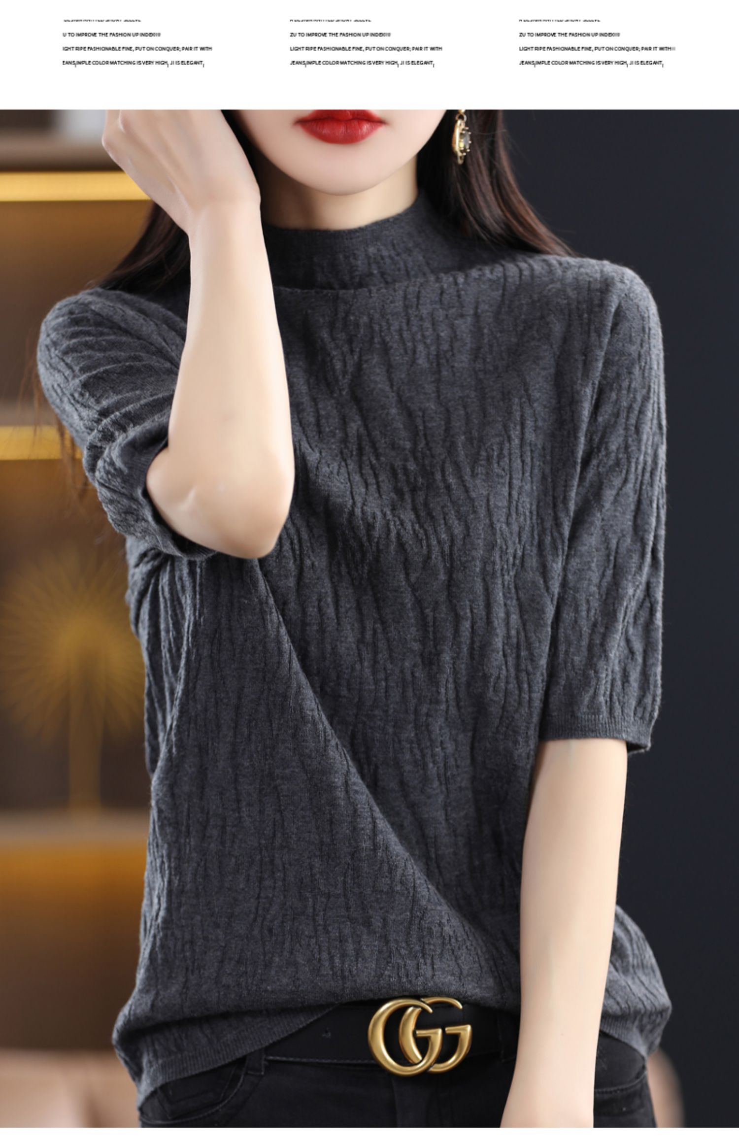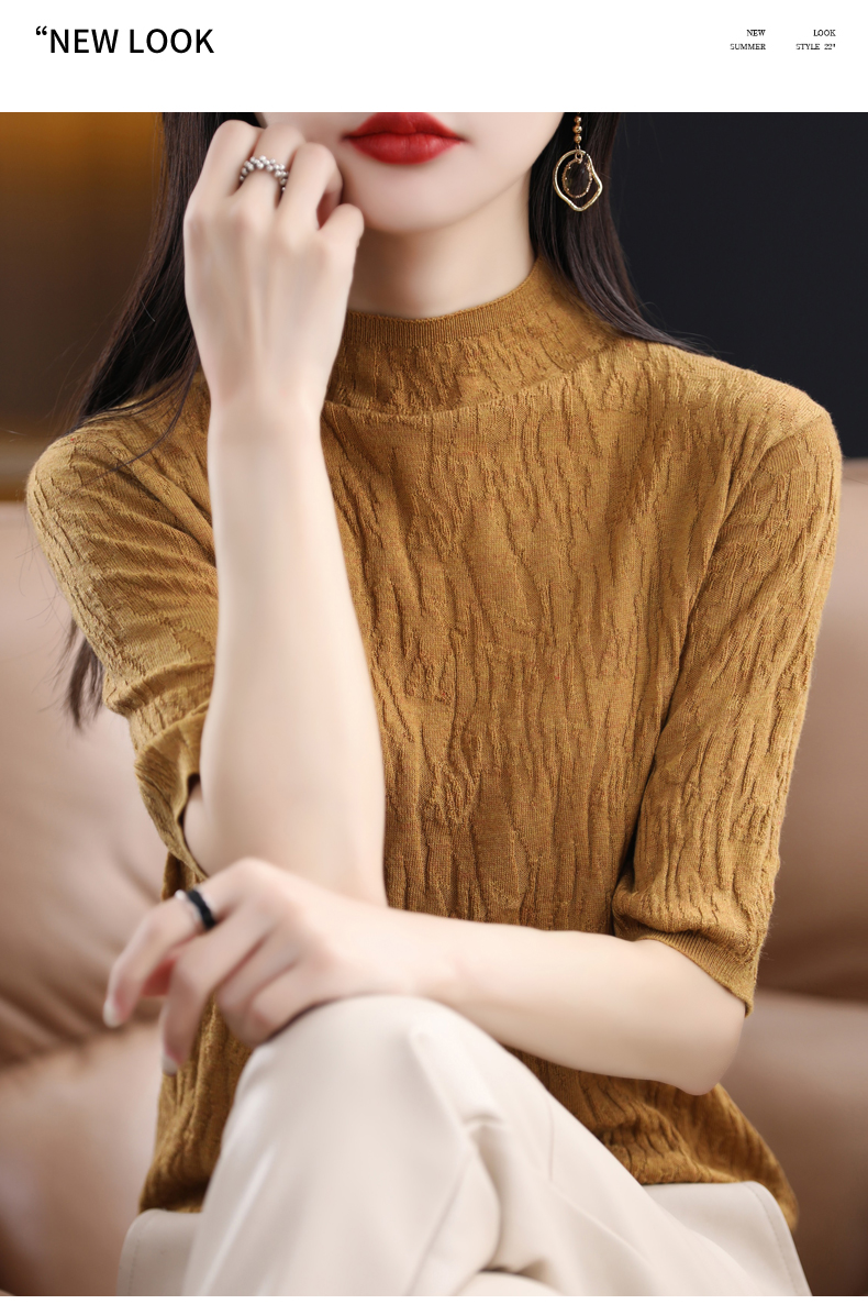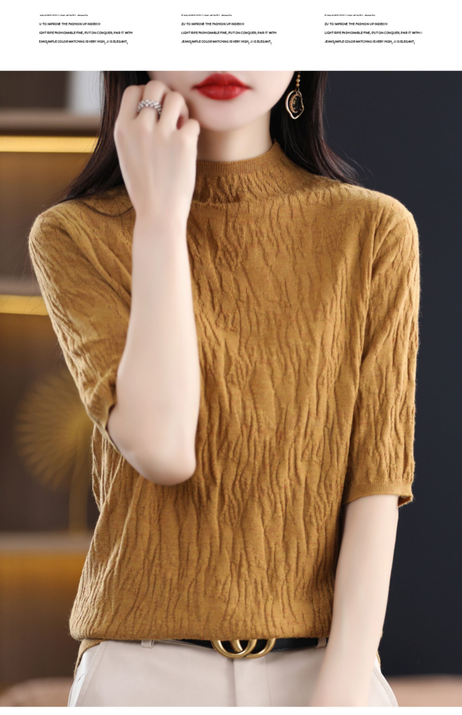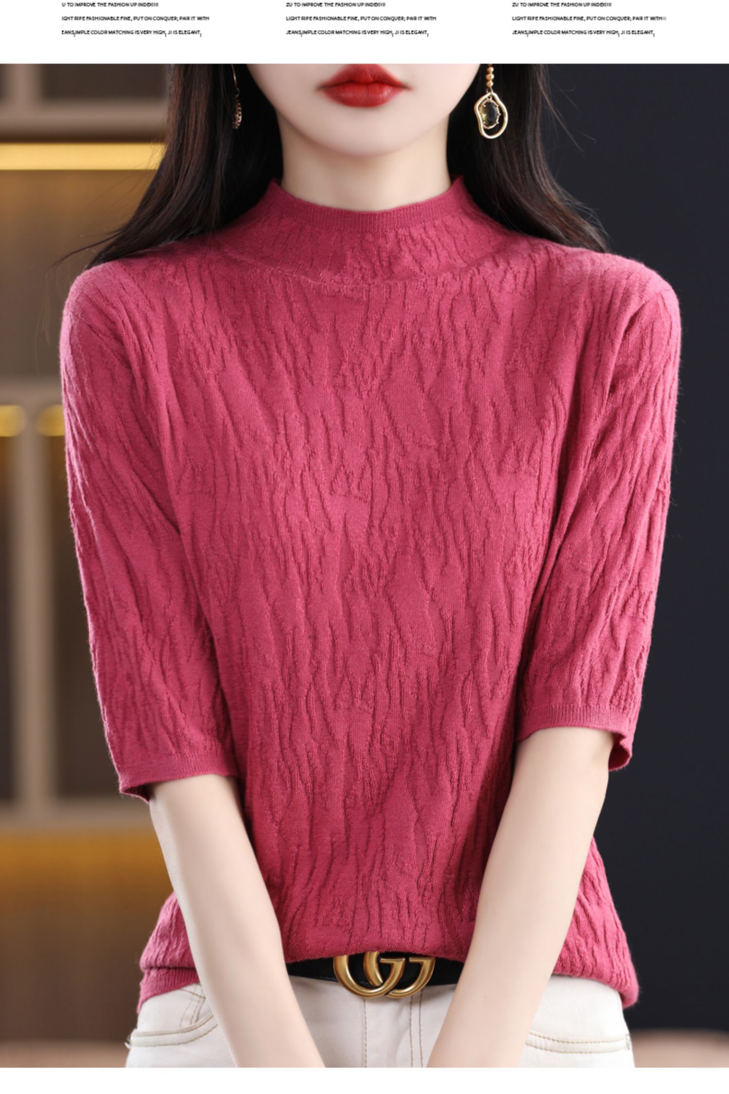 法式半高領五分袖針織打底衫女薄款秋冬時尚純色毛衣中袖大碼上衣