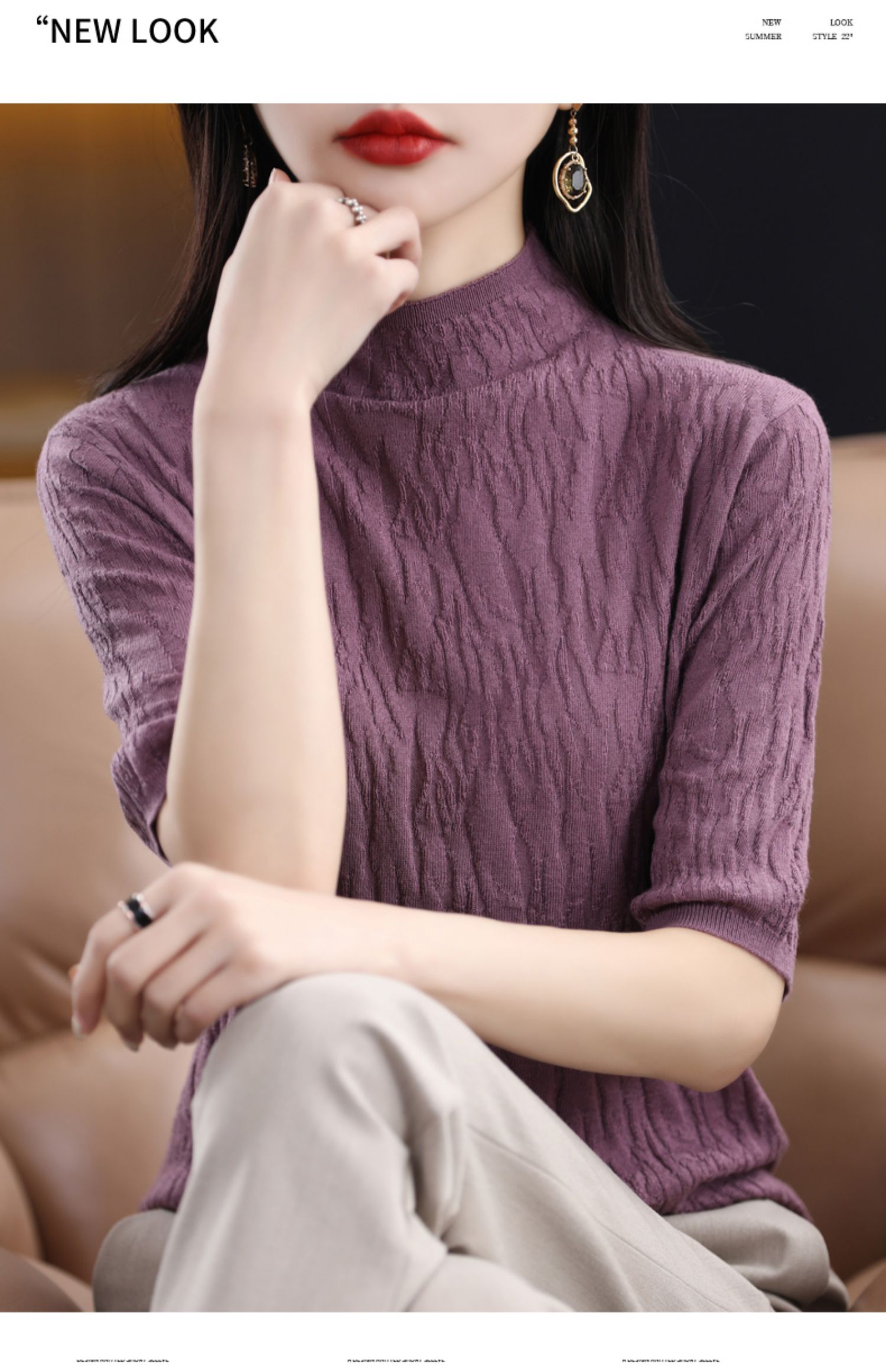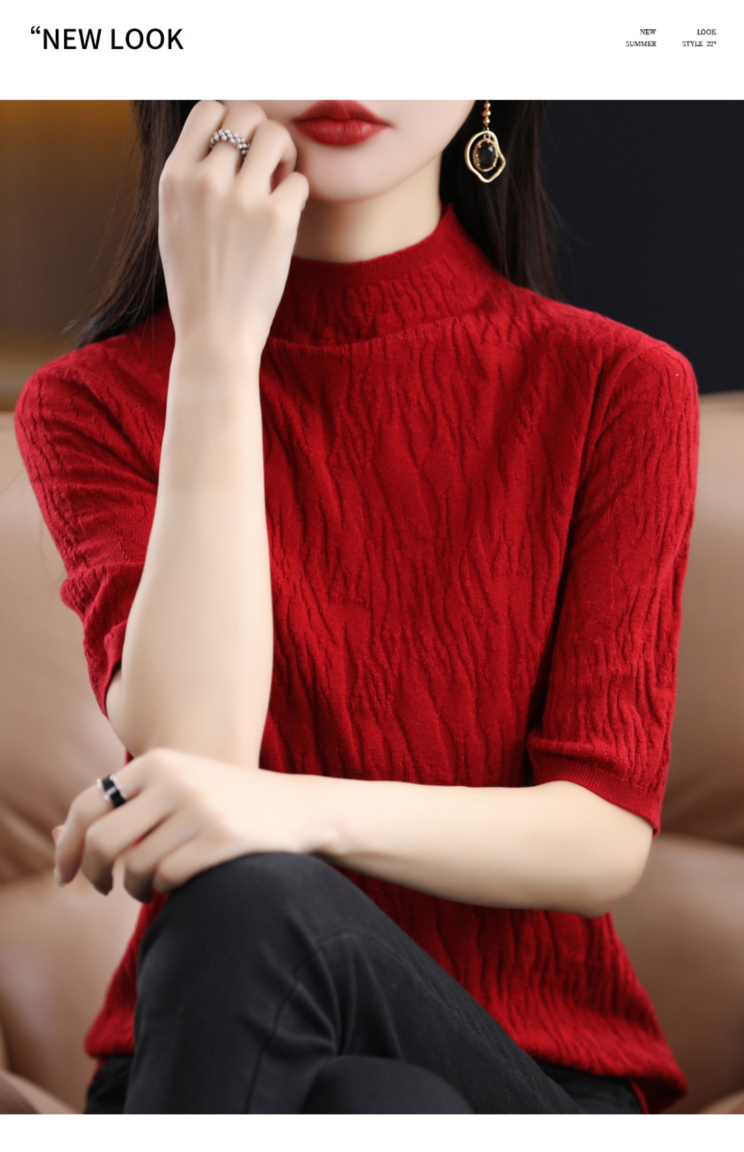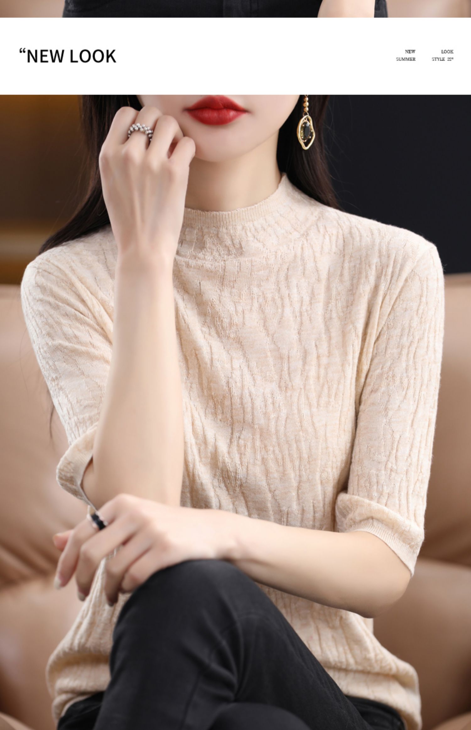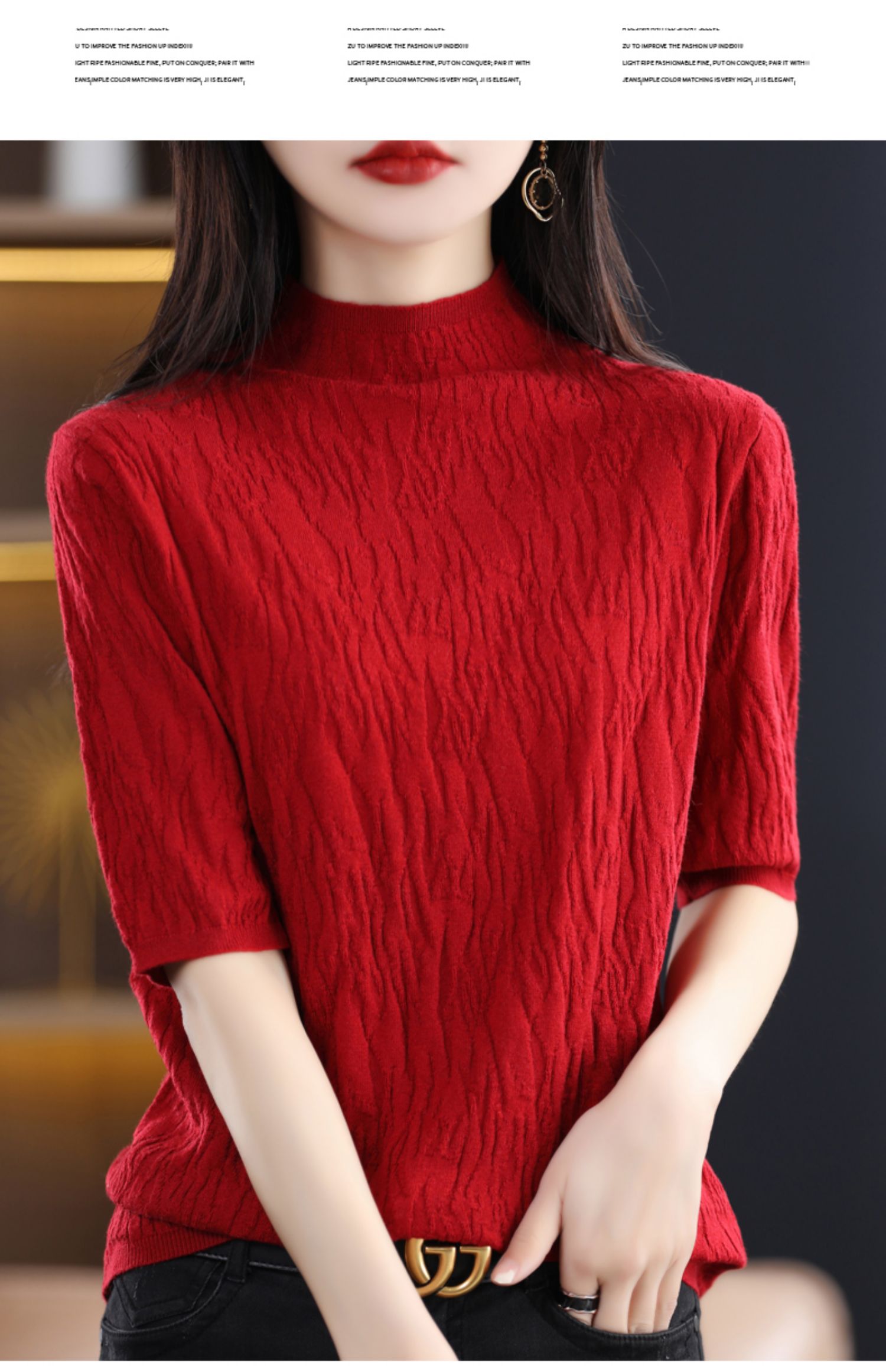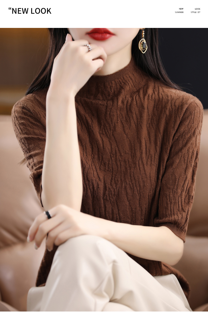 法式半高領五分袖針織打底衫女薄款秋冬時尚純色毛衣中袖大碼上衣