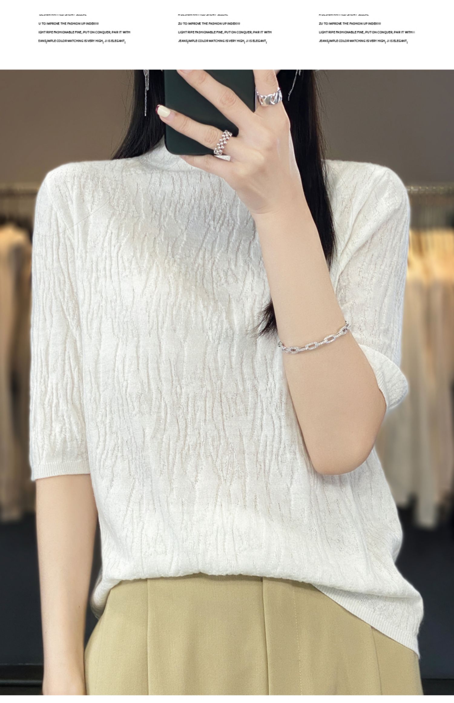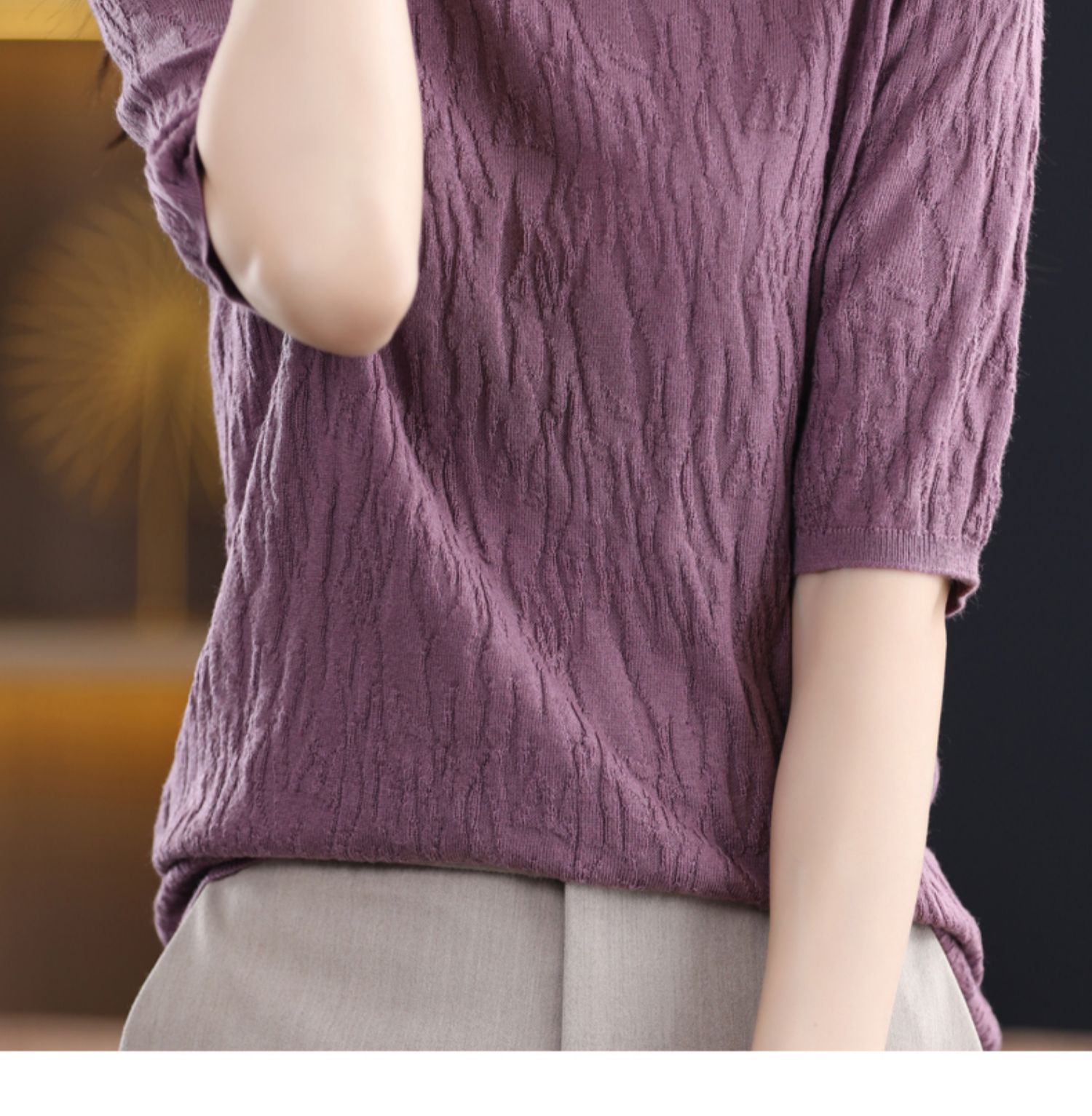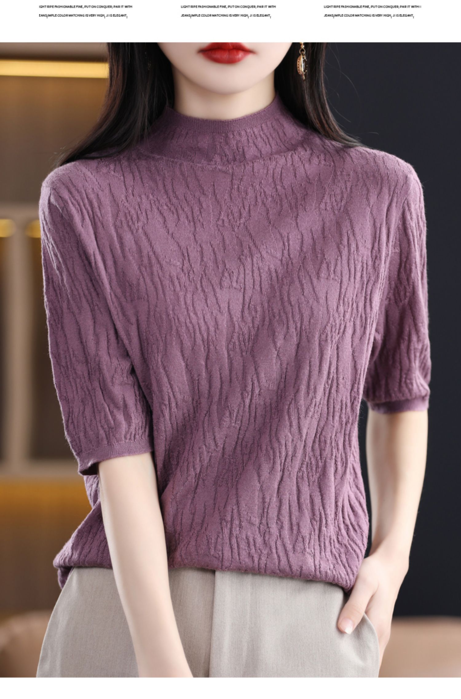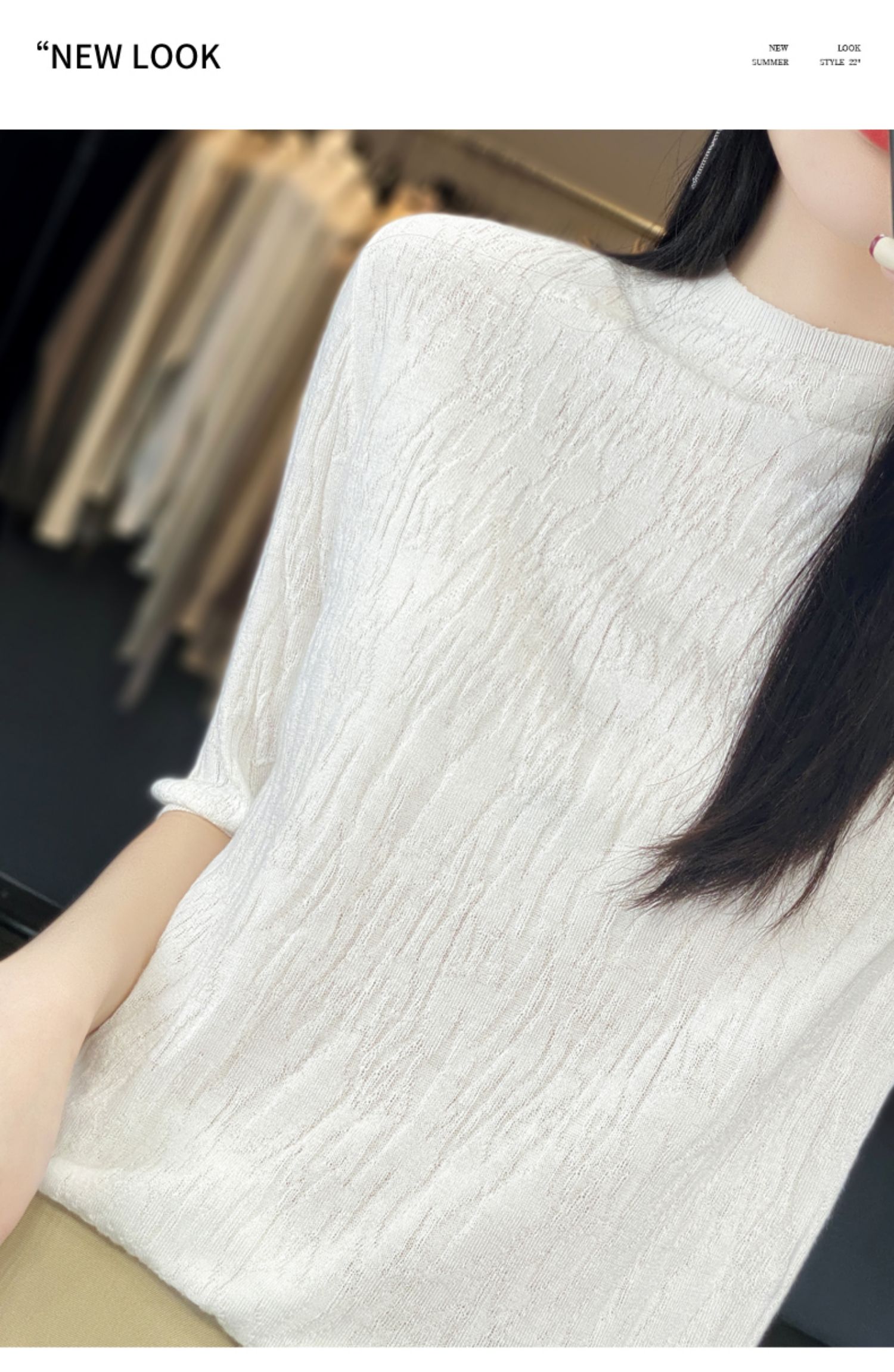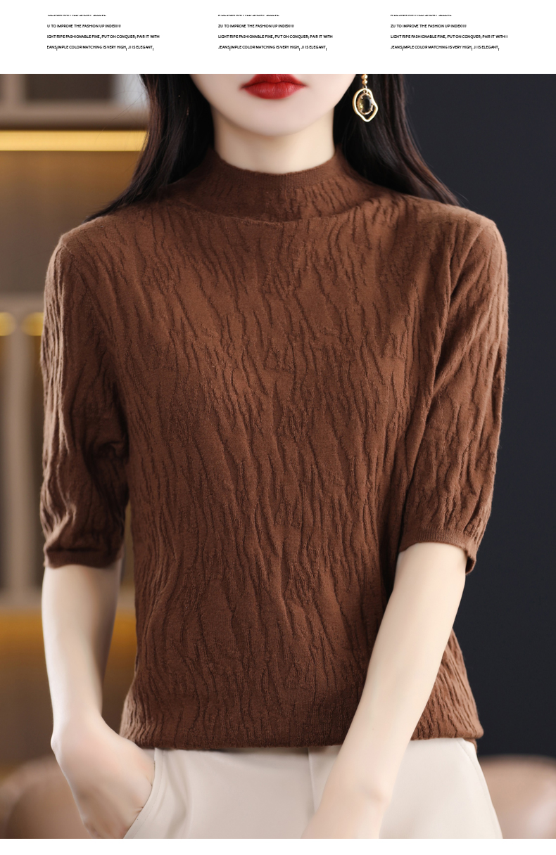 法式半高領五分袖針織打底衫女薄款秋冬時尚純色毛衣中袖大碼上衣