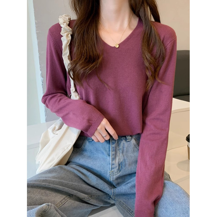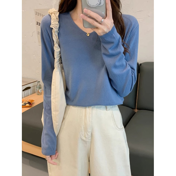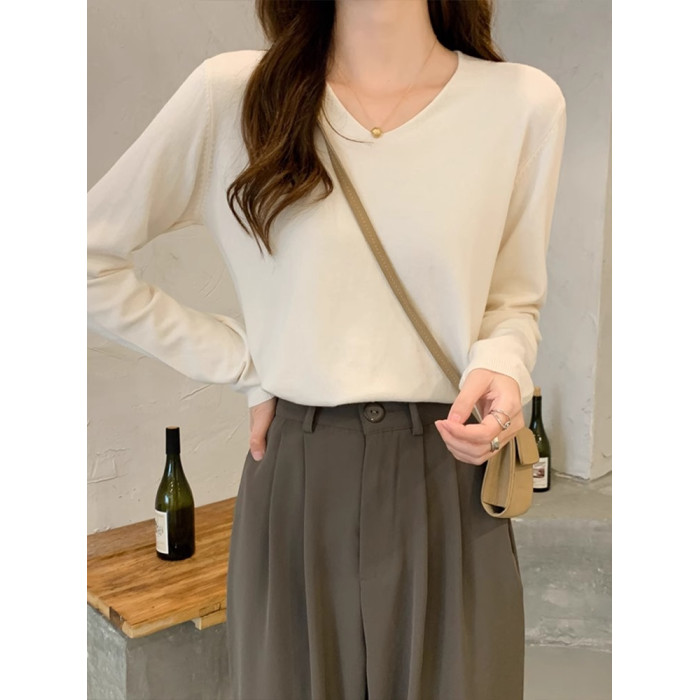 真維斯杏色v領針織衫毛衣女春秋2024新款韓系百搭長袖打底衫上衣