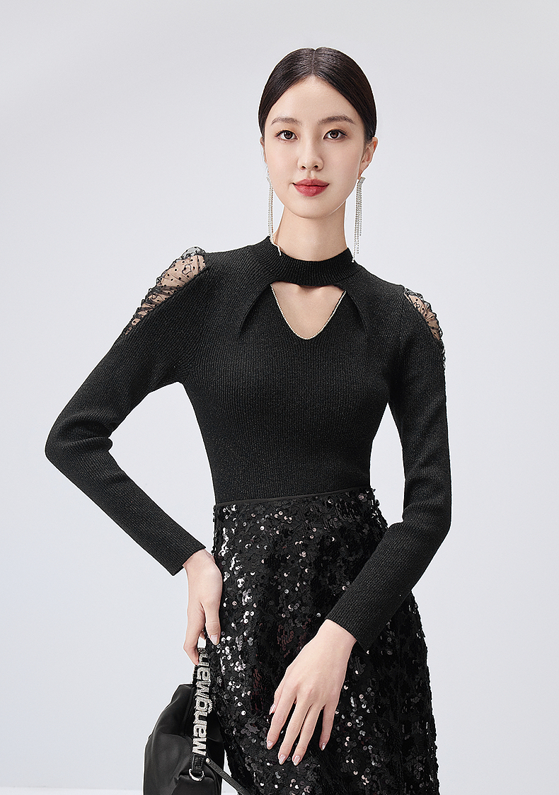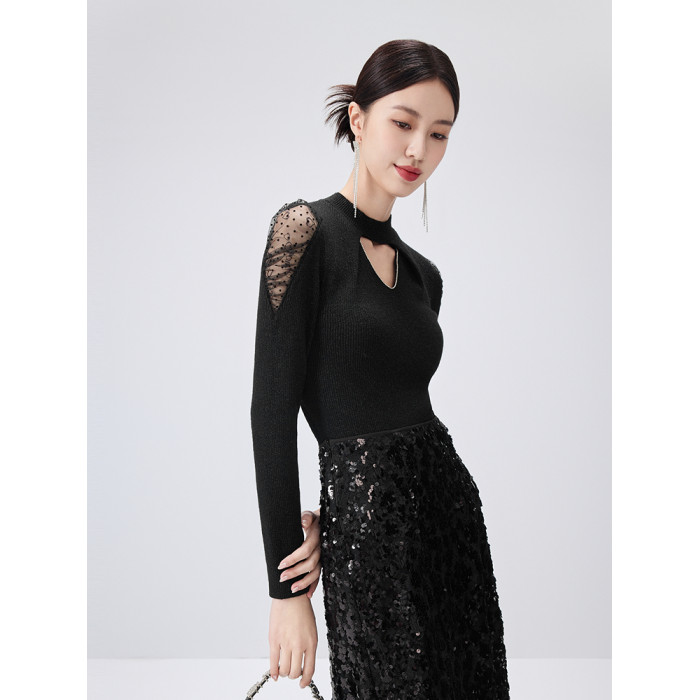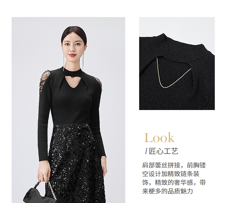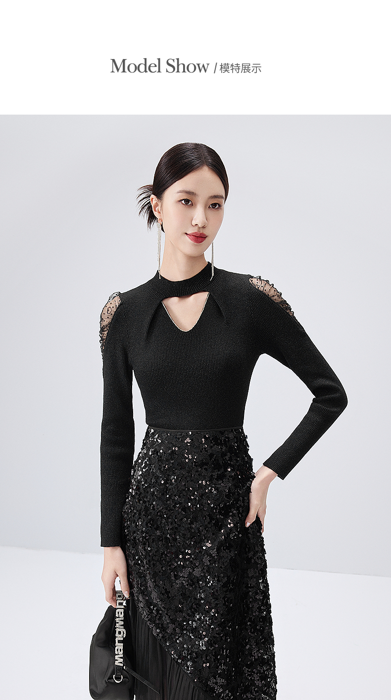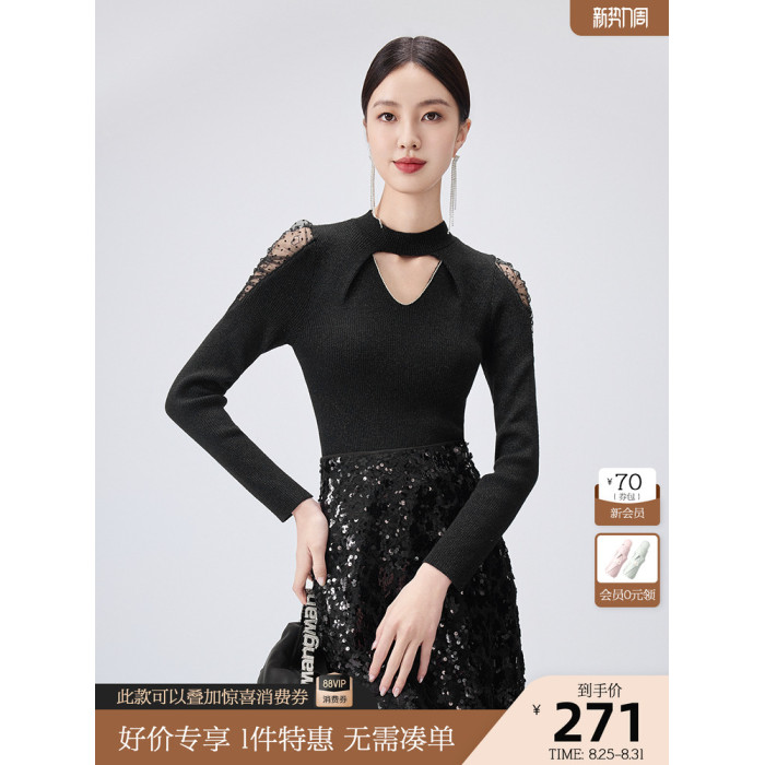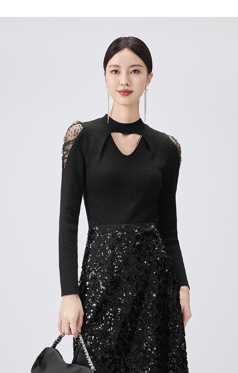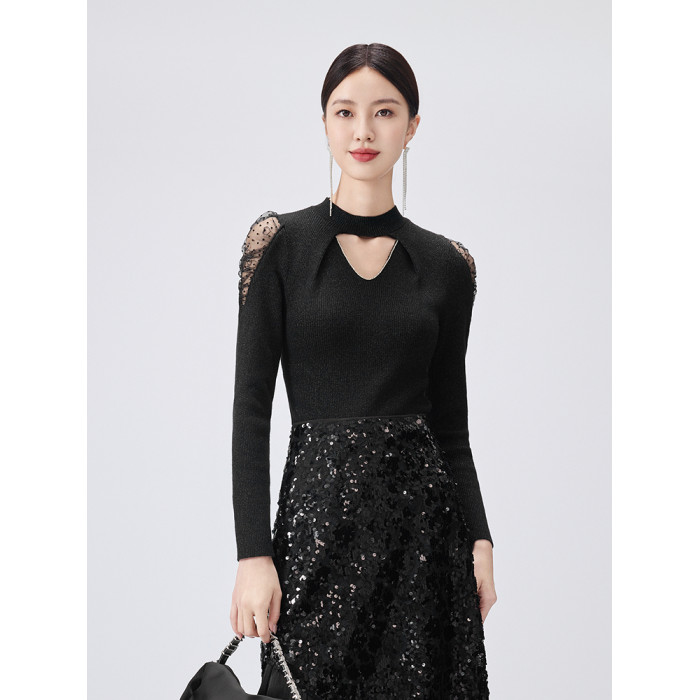 芭蒂娜蕾絲拼接針織衫女羊毛鏤空打底衫