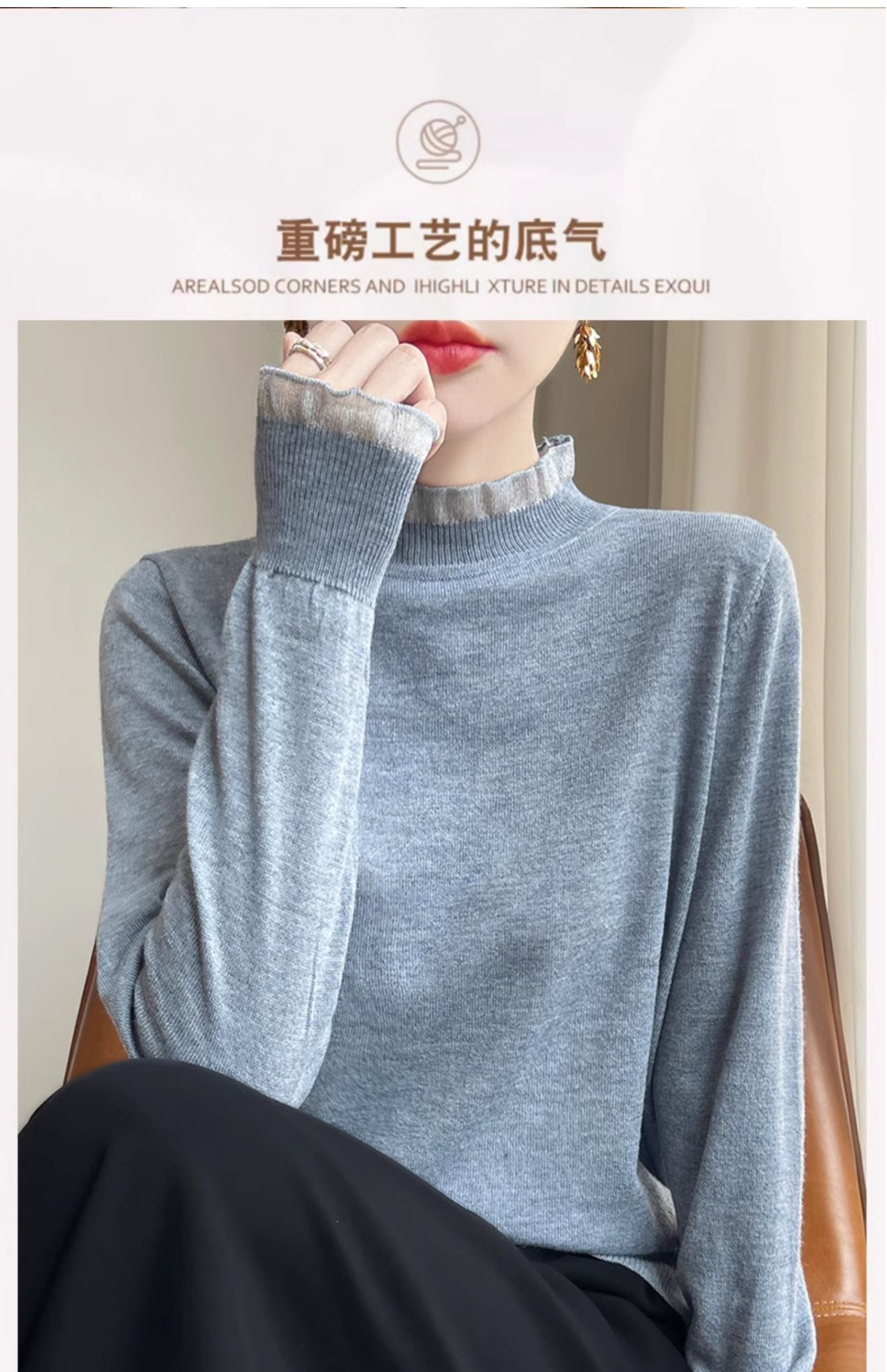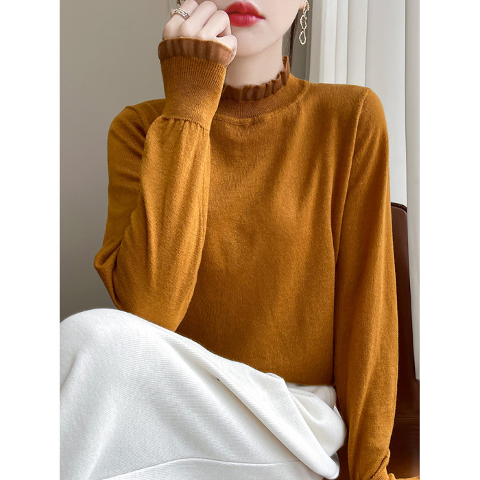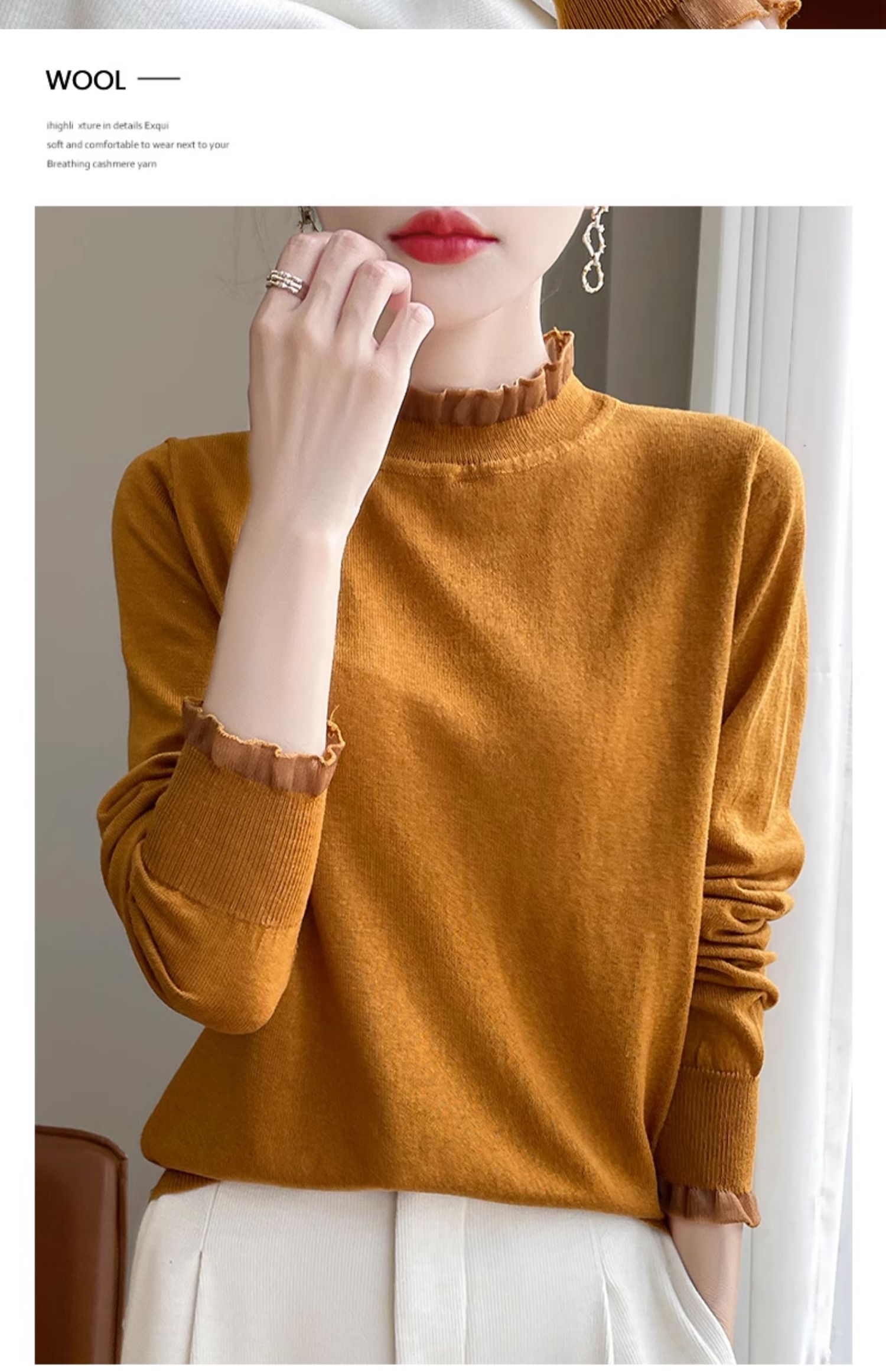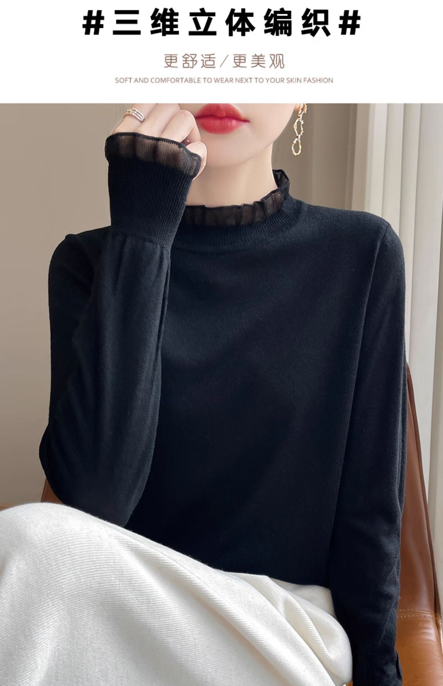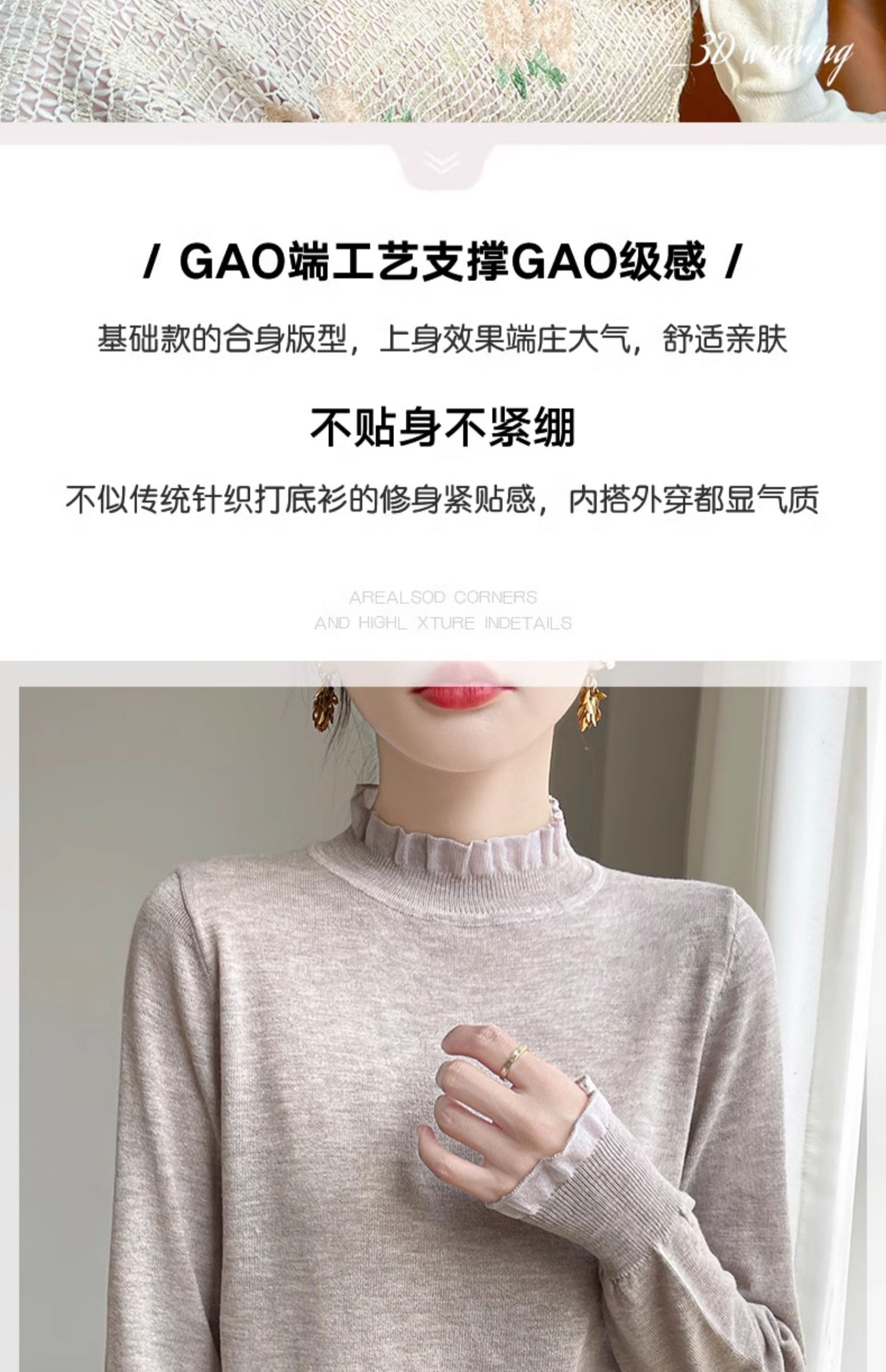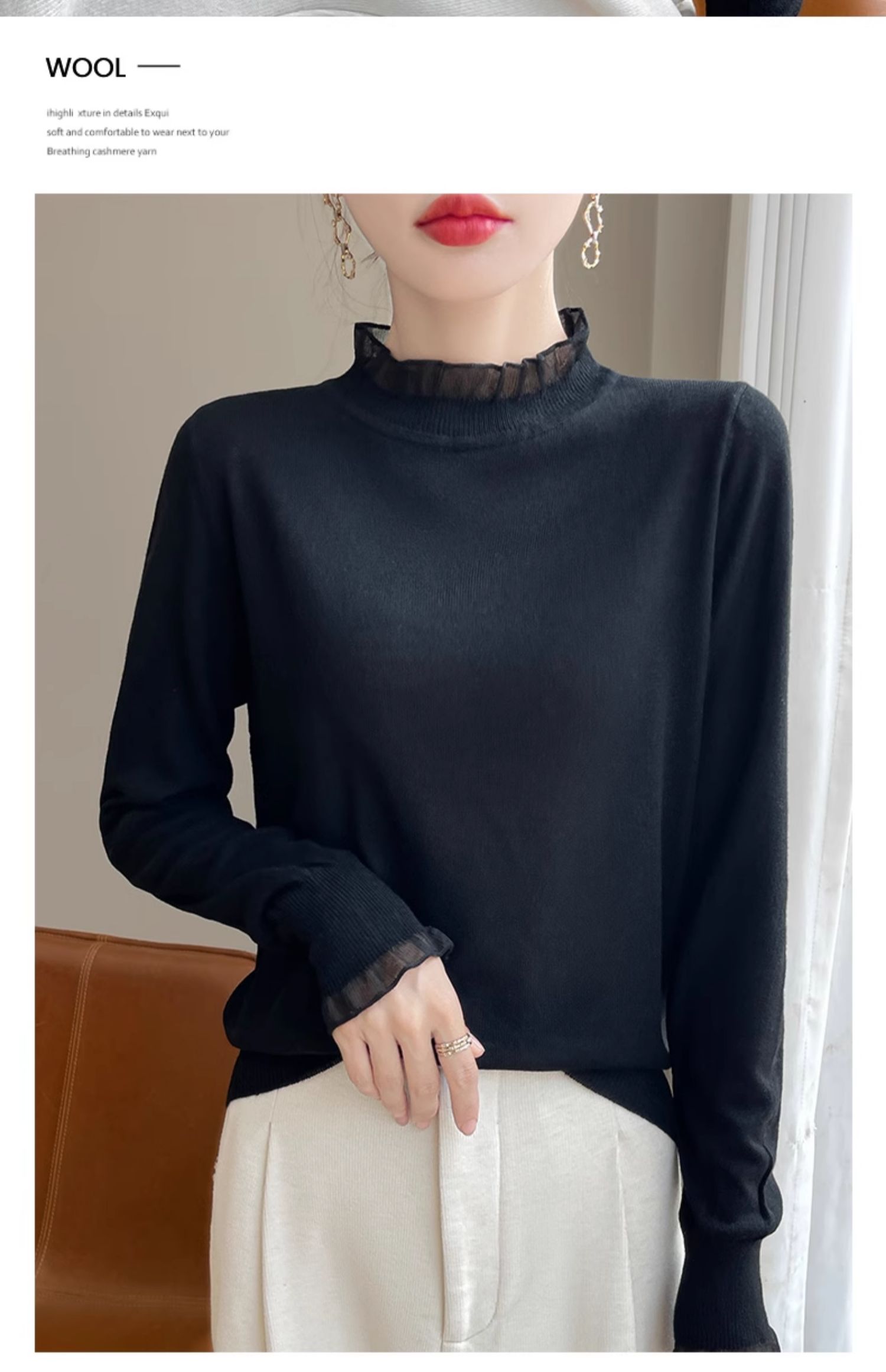 時髦洋氣蕾絲木耳領花邊毛衣女秋冬內搭寬松顯瘦半高領針織打底衫