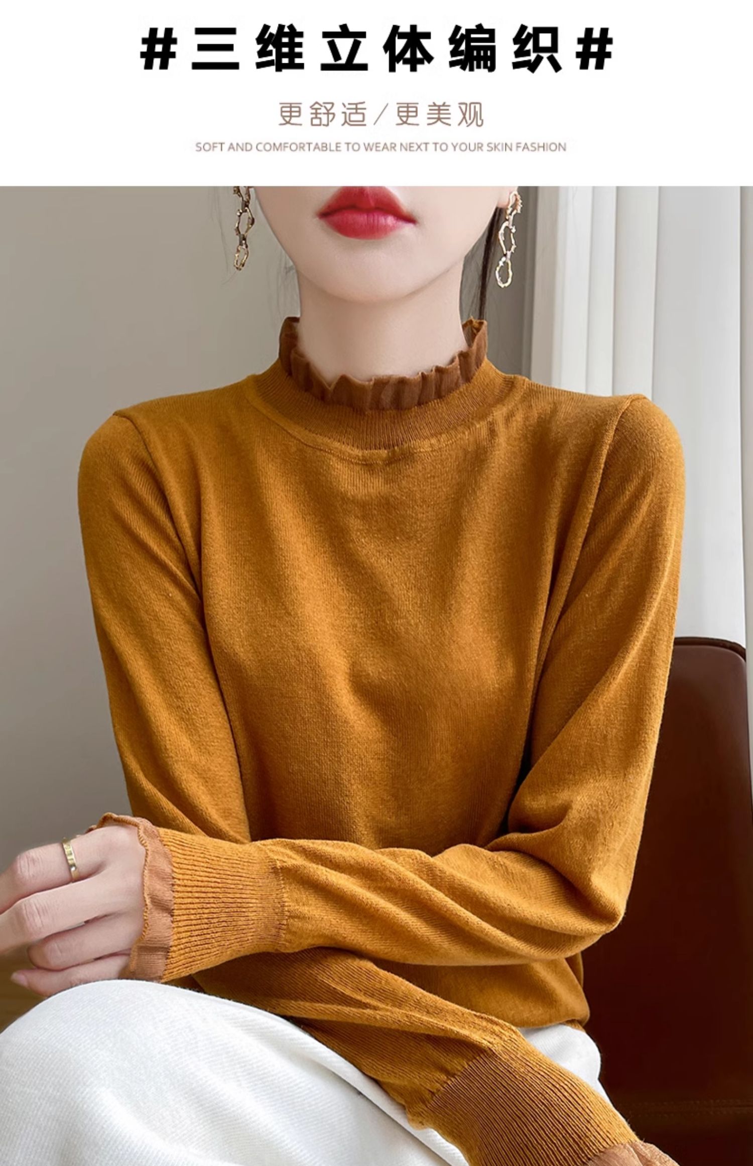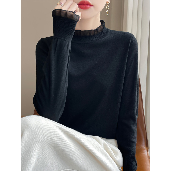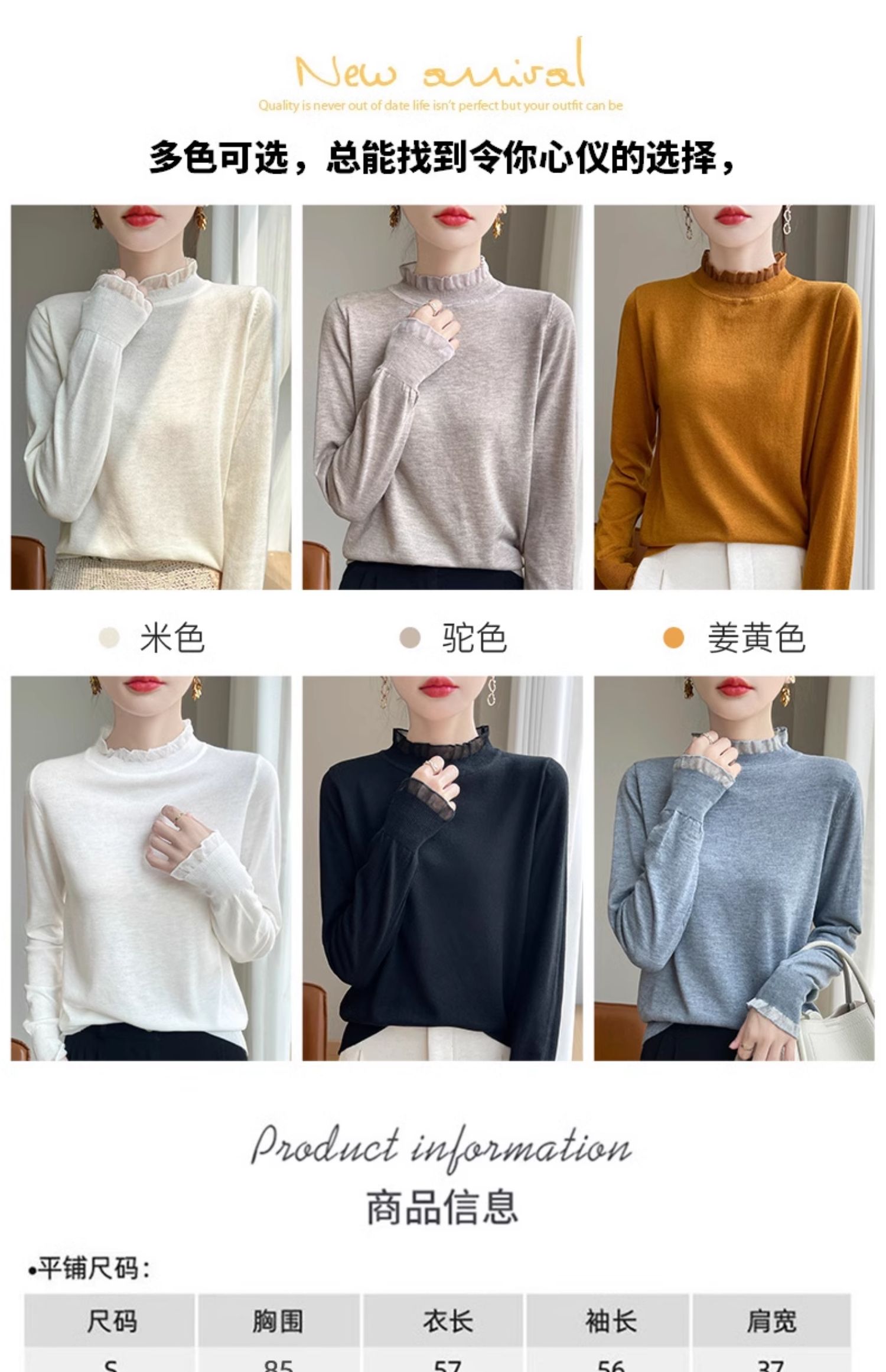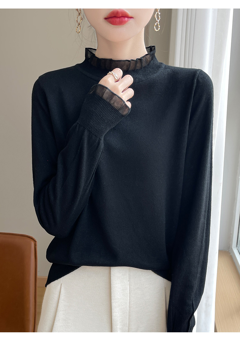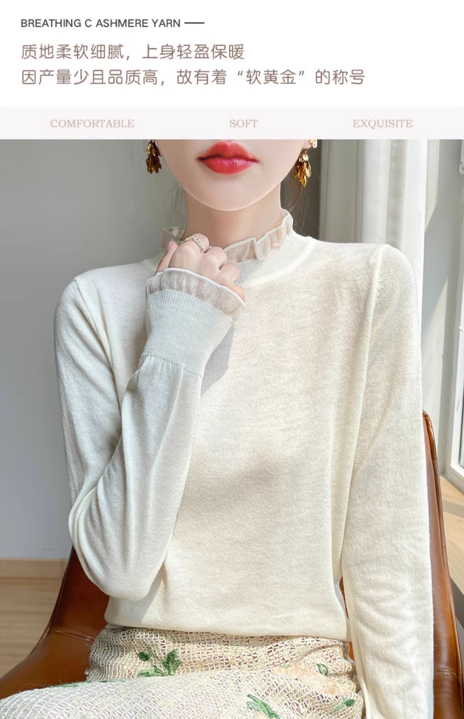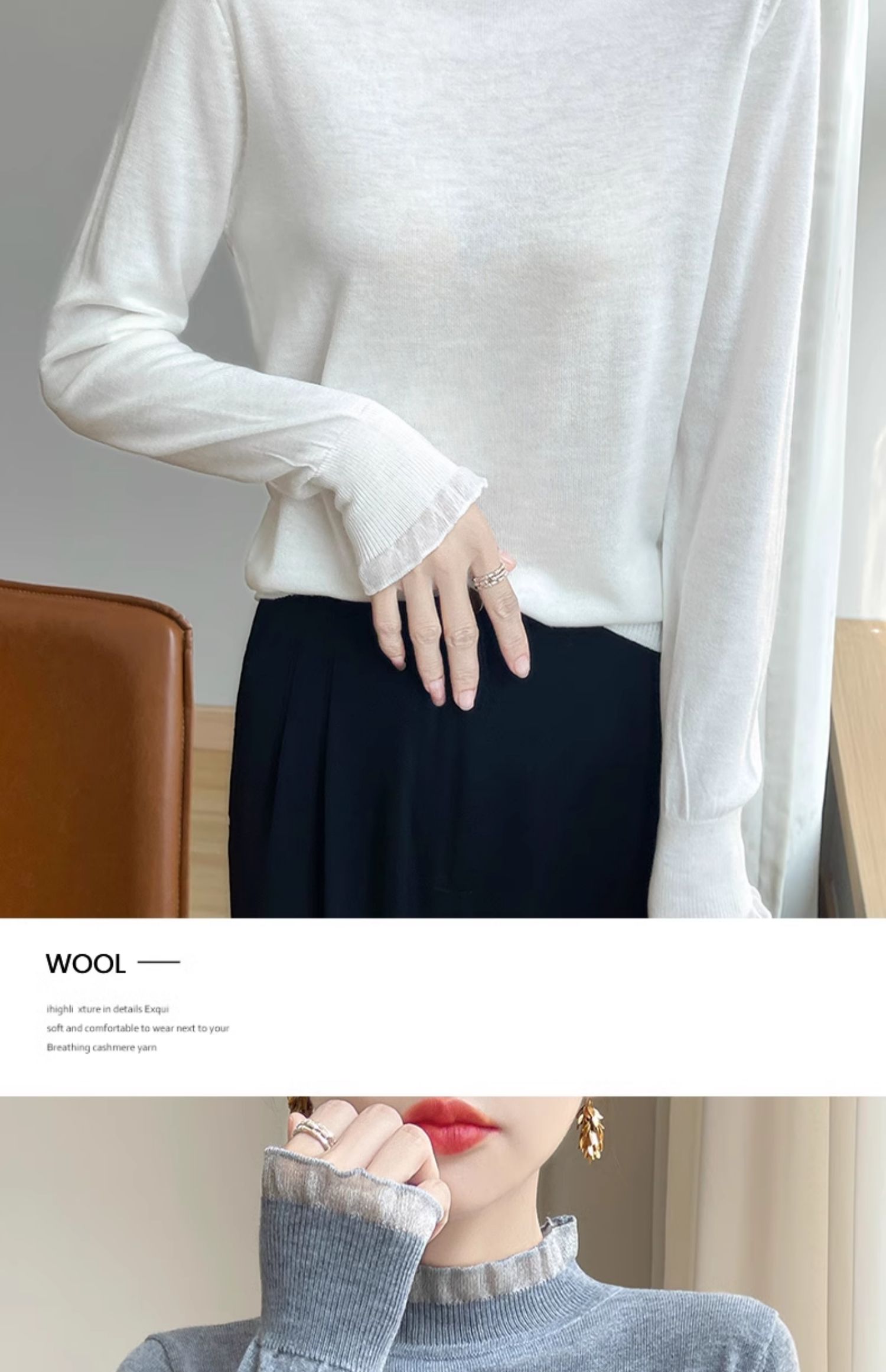 時髦洋氣蕾絲木耳領花邊毛衣女秋冬內搭寬松顯瘦半高領針織打底衫