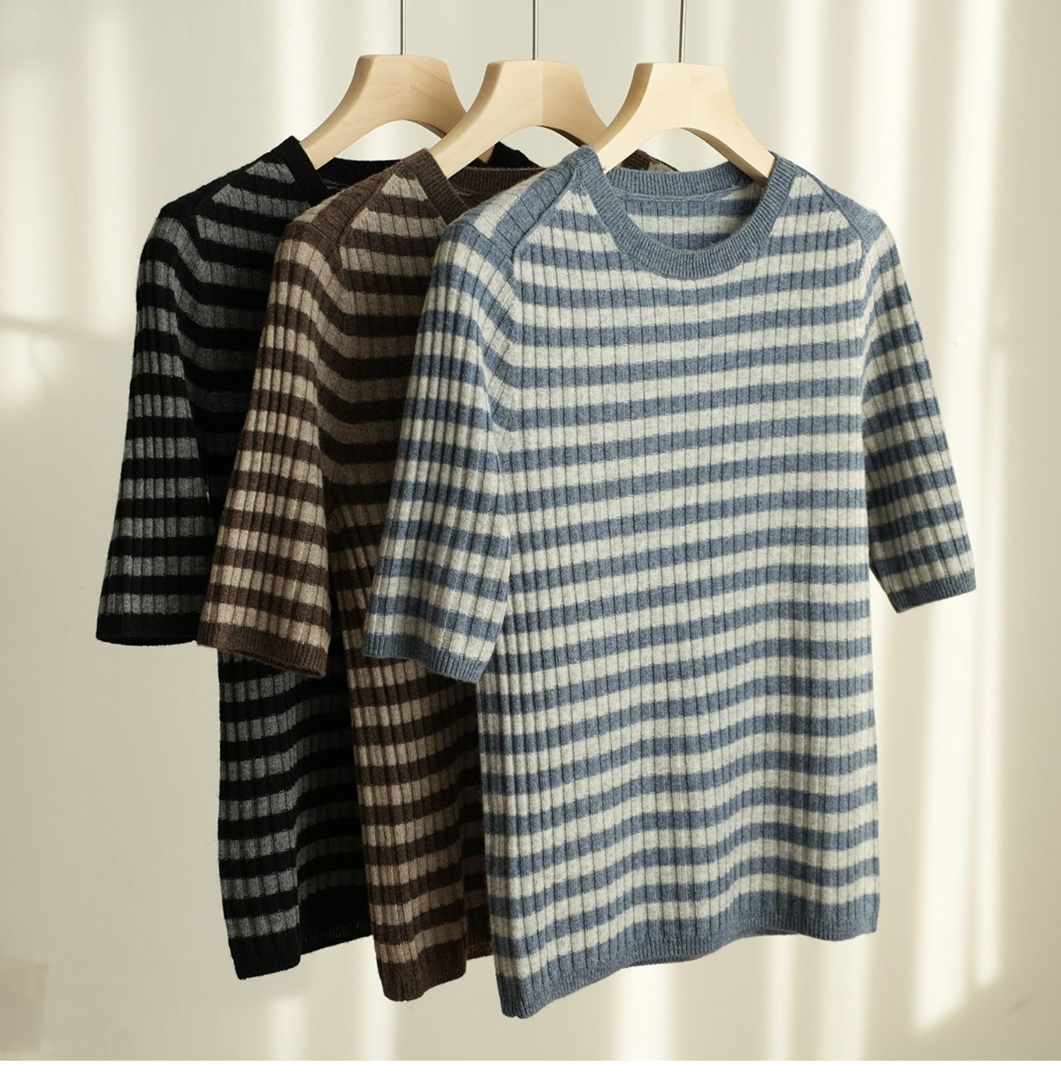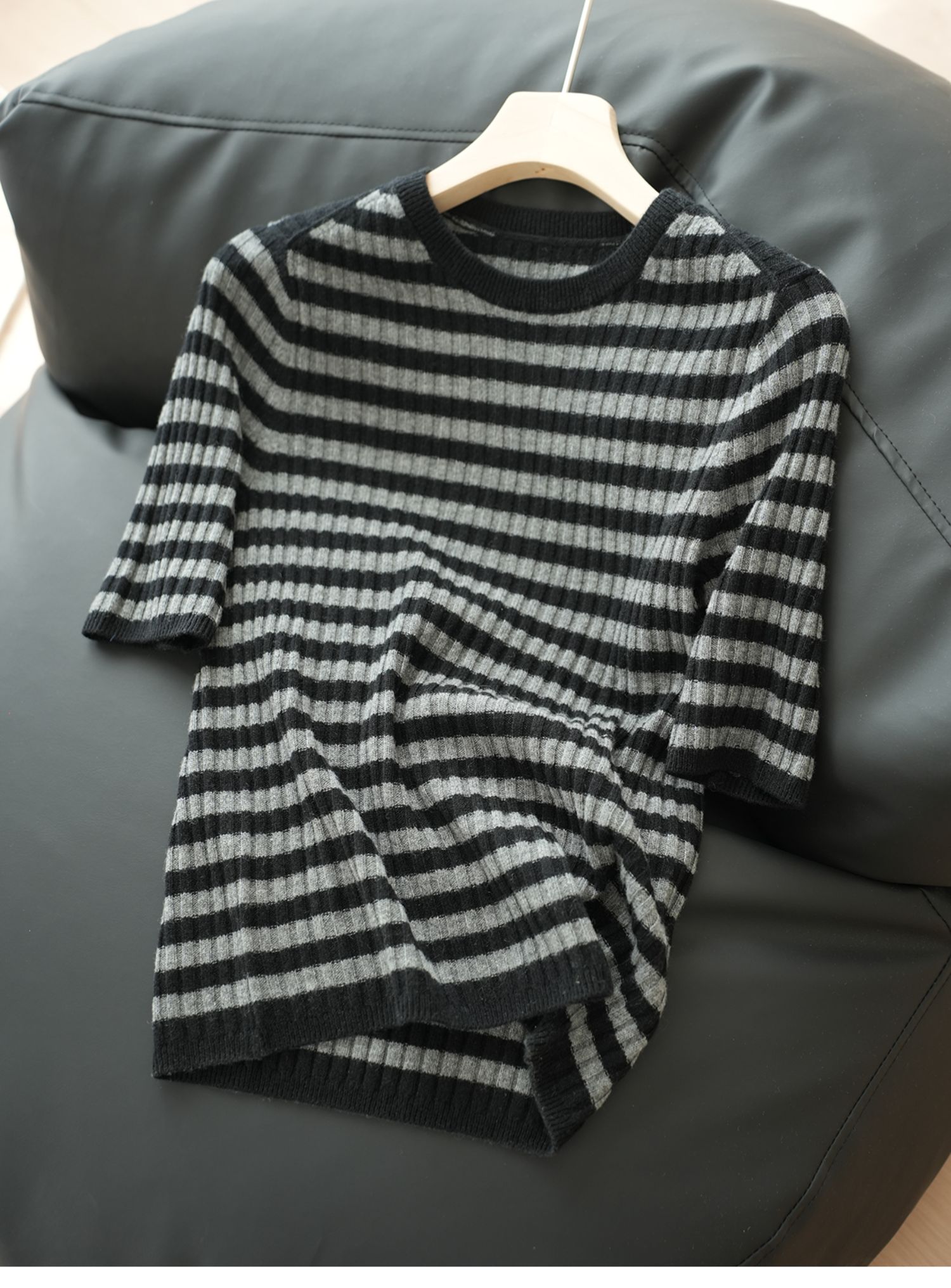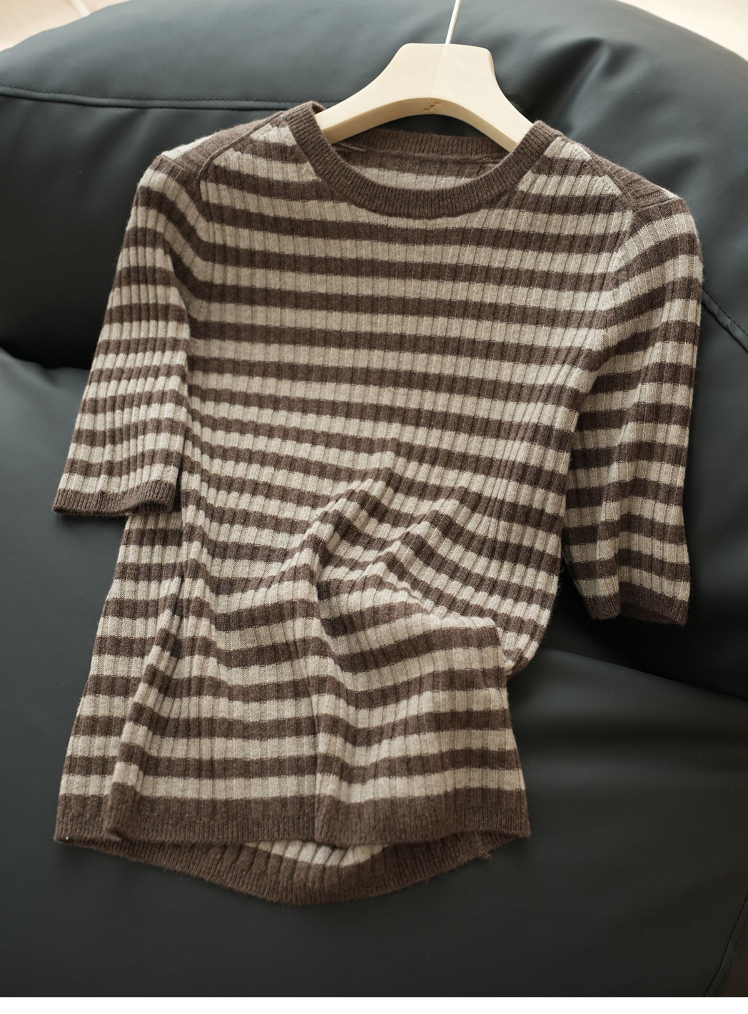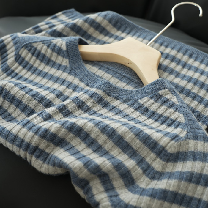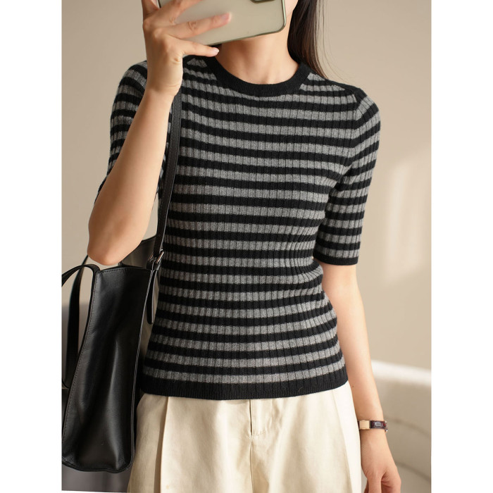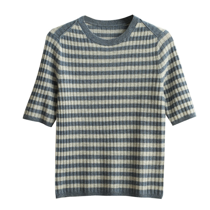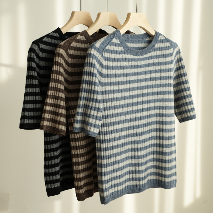福利 無補 90羊毛10羊絨 女士條紋針織衫五分袖打底衫 春秋款