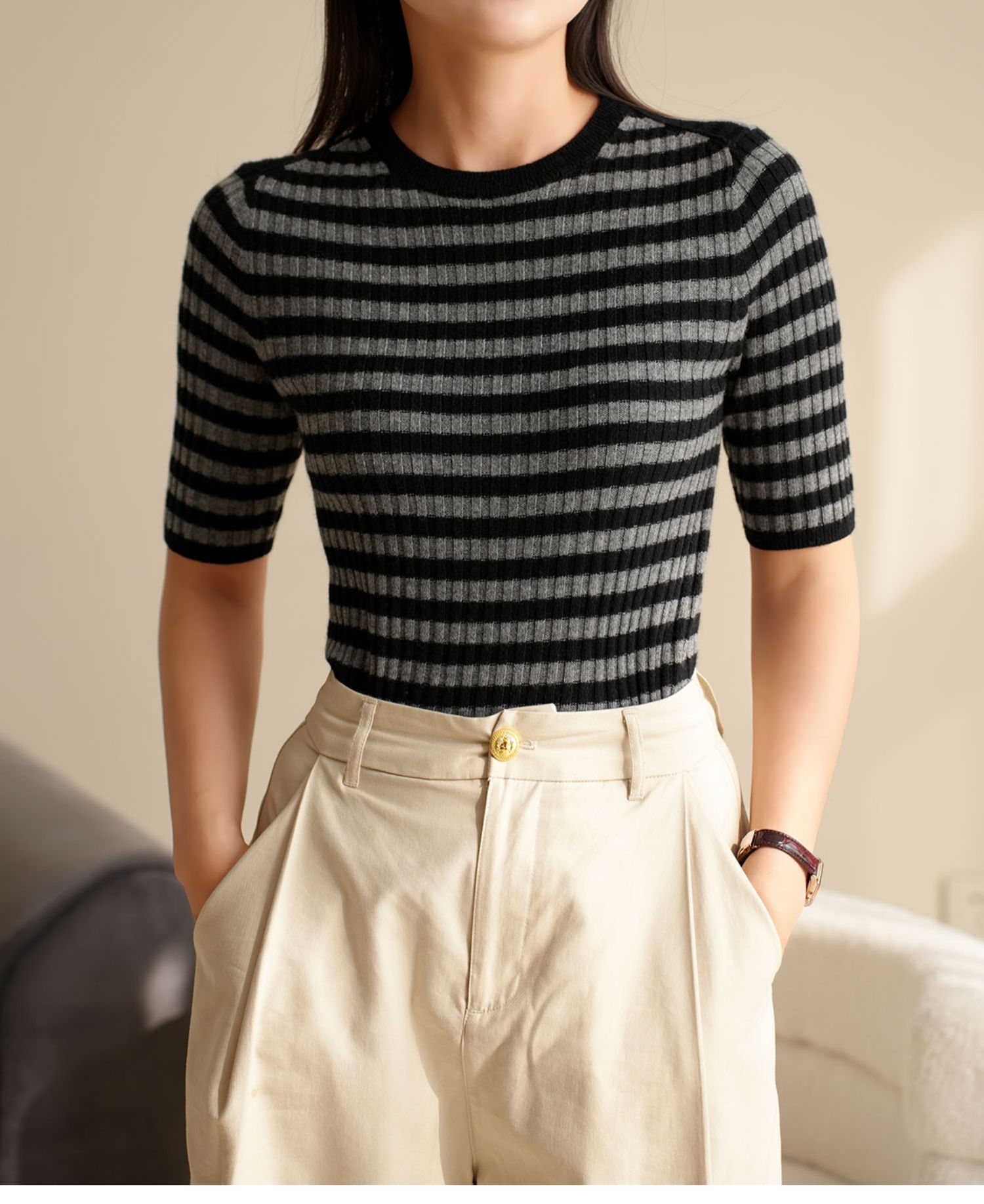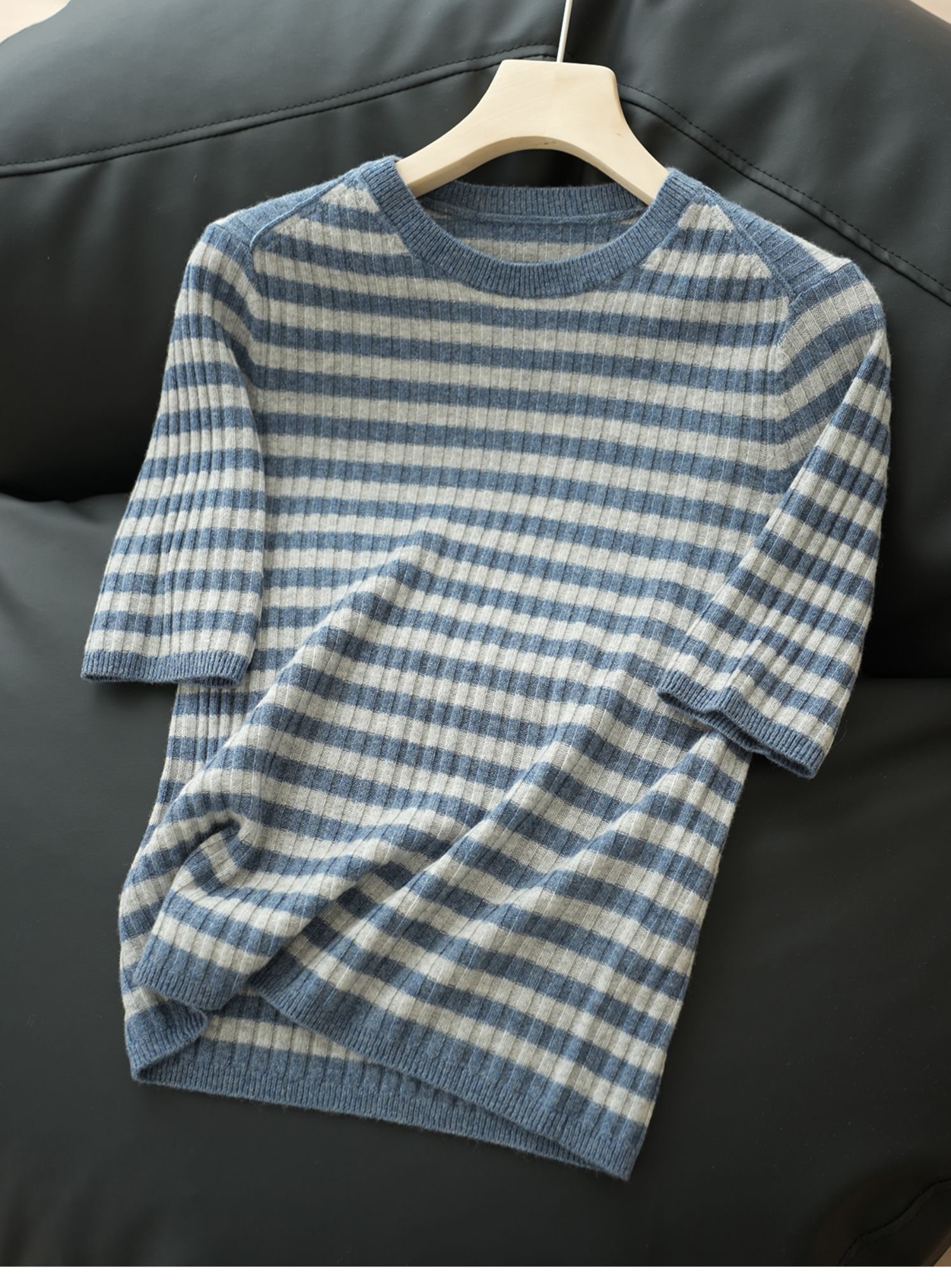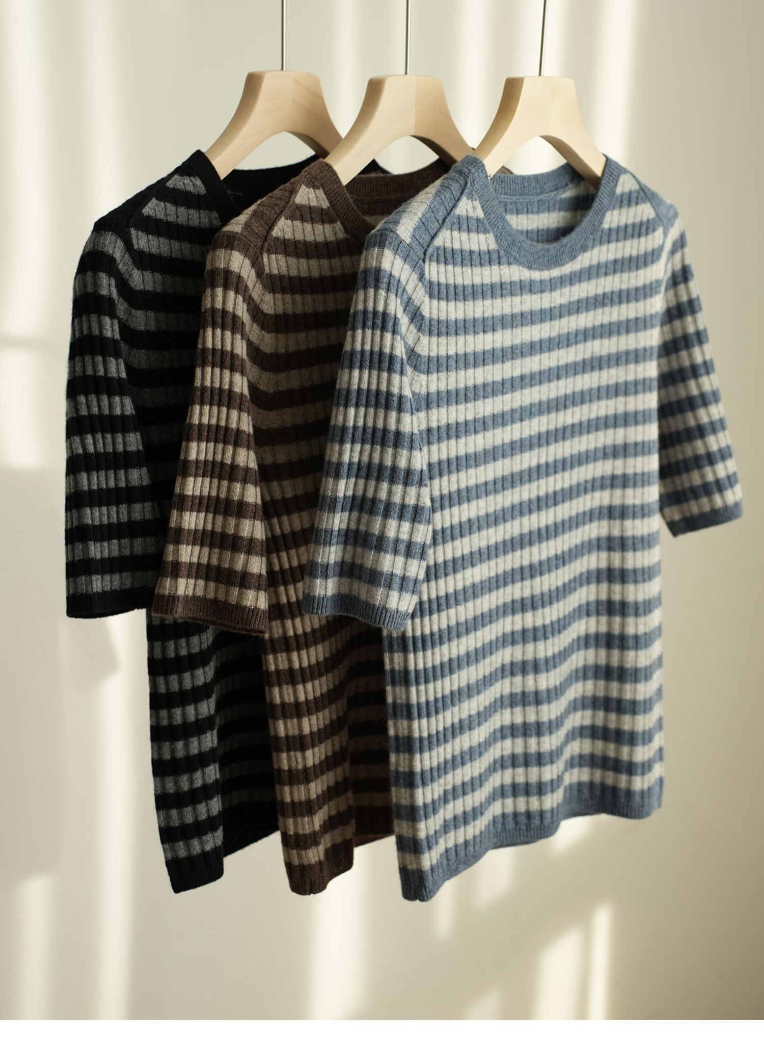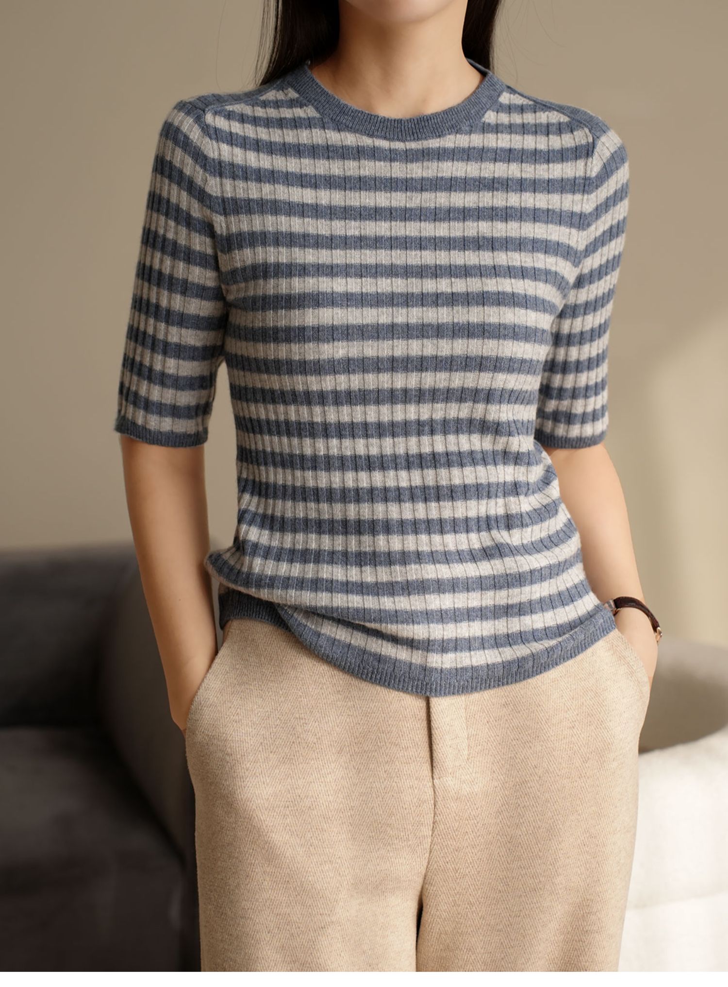 福利 無補 90羊毛10羊絨 女士條紋針織衫五分袖打底衫 春秋款