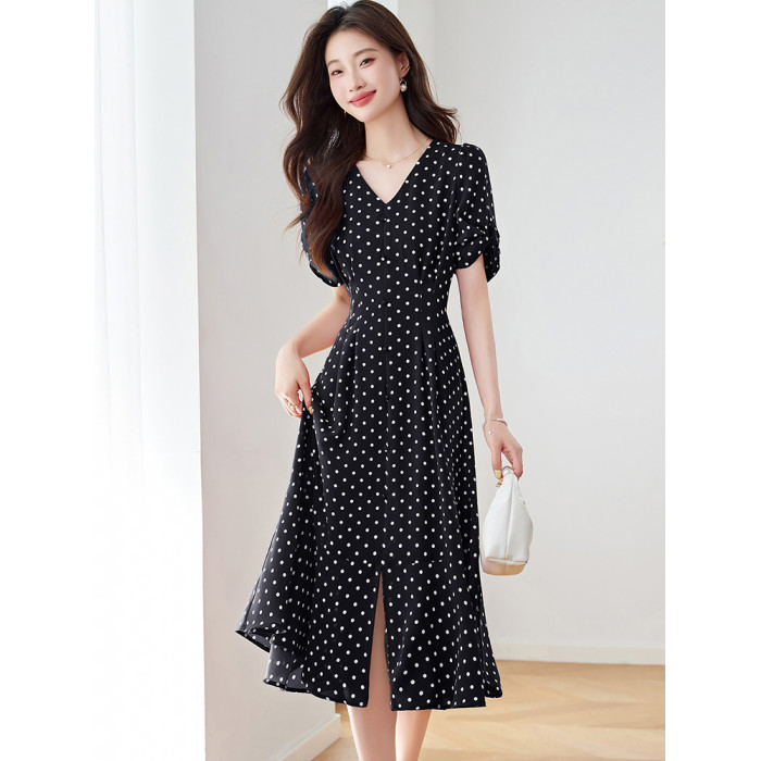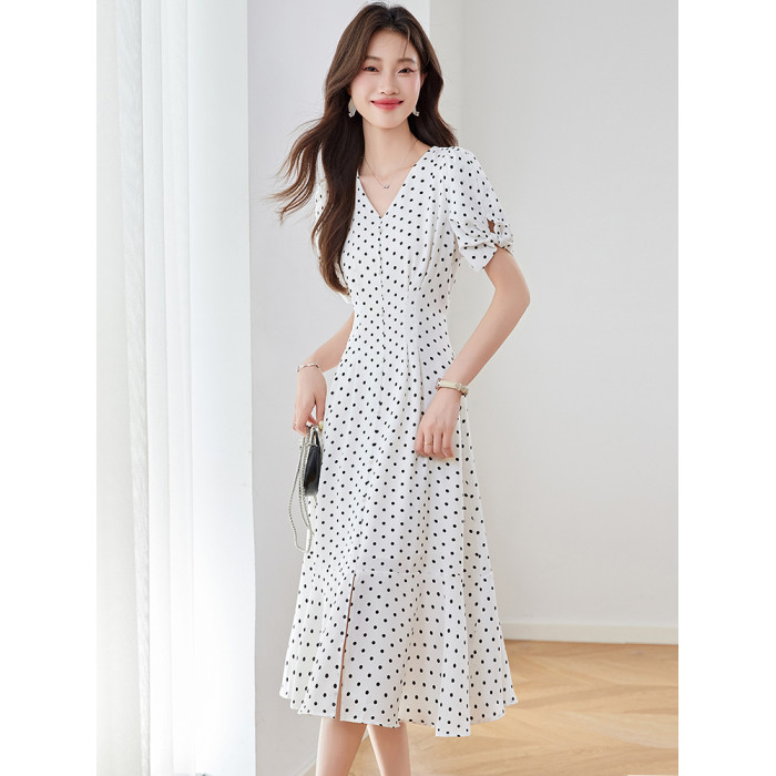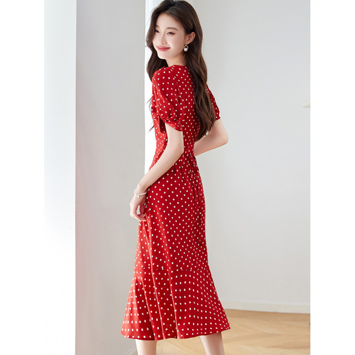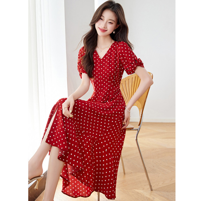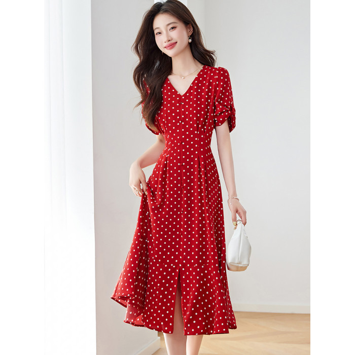 紅色氣質波點真絲連衣裙女2025夏新款洋氣修身顯瘦小個子裙子流行
