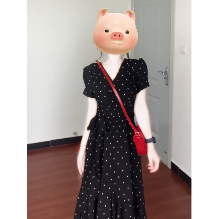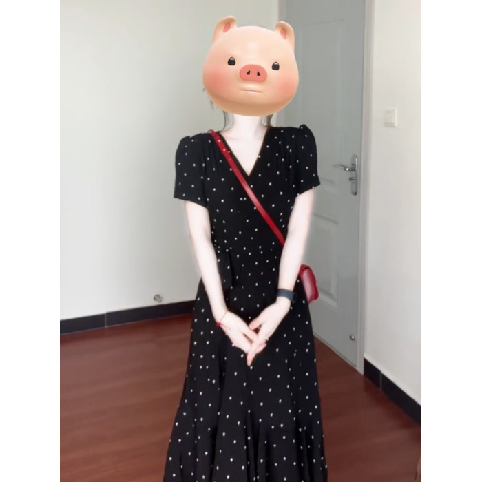 2025新款黑色v領碎花連衣裙子女裝夏季爆款今年流行漂亮掐腰長裙