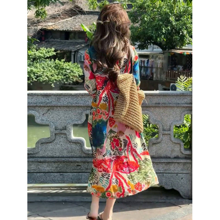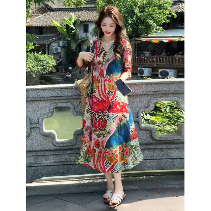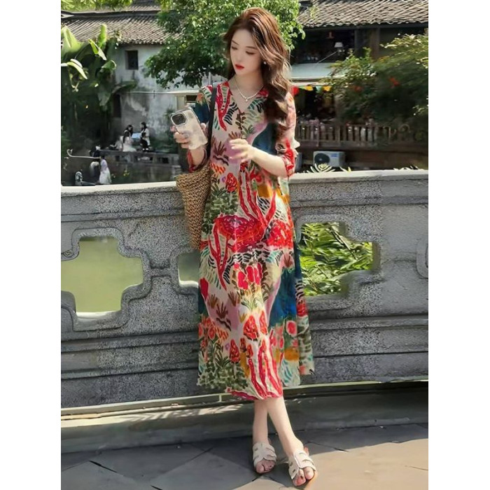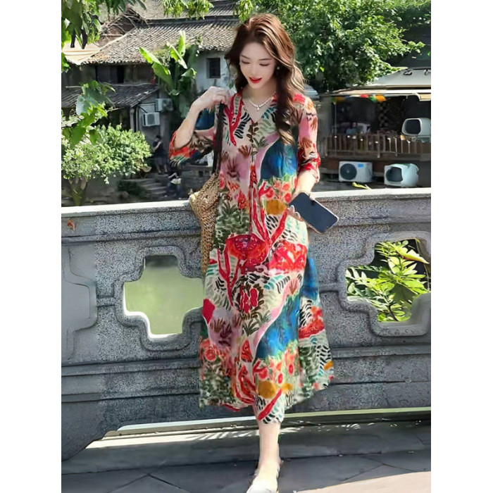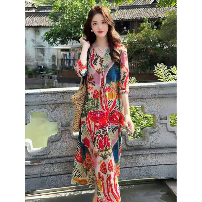 輕奢大牌洋氣真絲印花連衣裙2025夏季新款寬松顯瘦法式氣質長裙