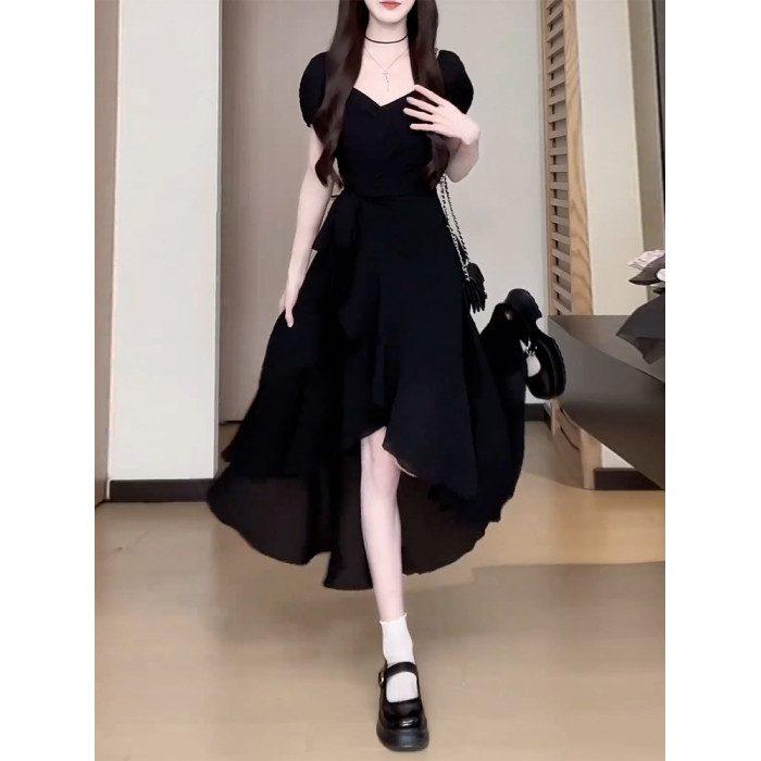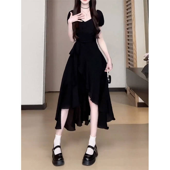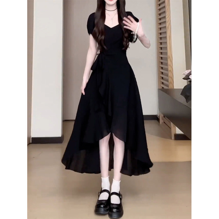 氣質黑色連衣裙子女夏季2025新款今年流行爆款獨特漂亮不規則長裙