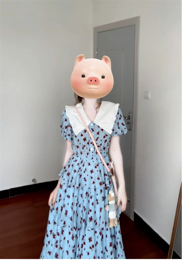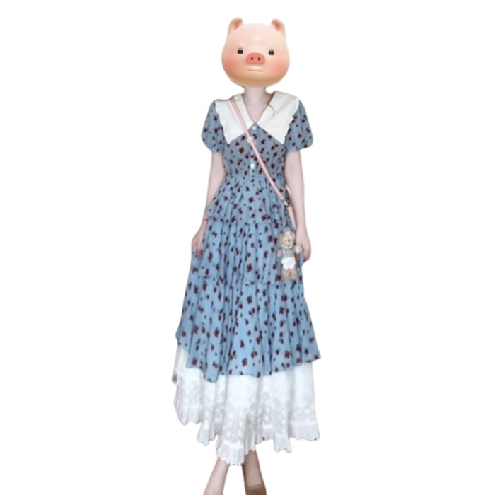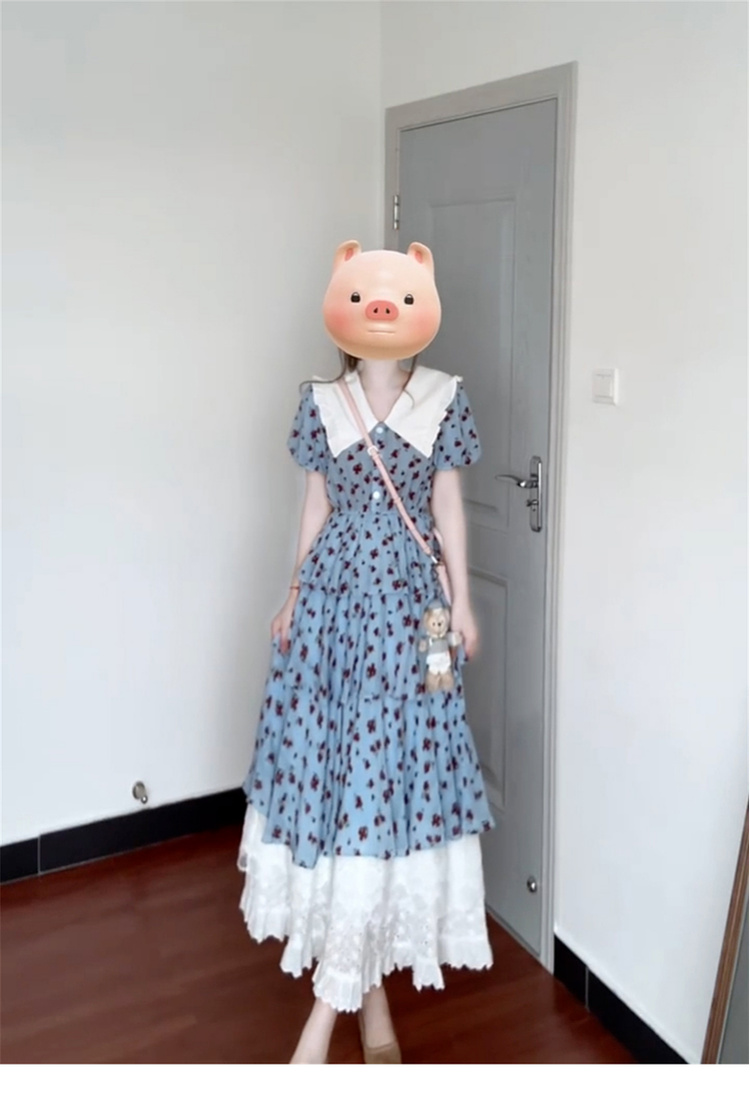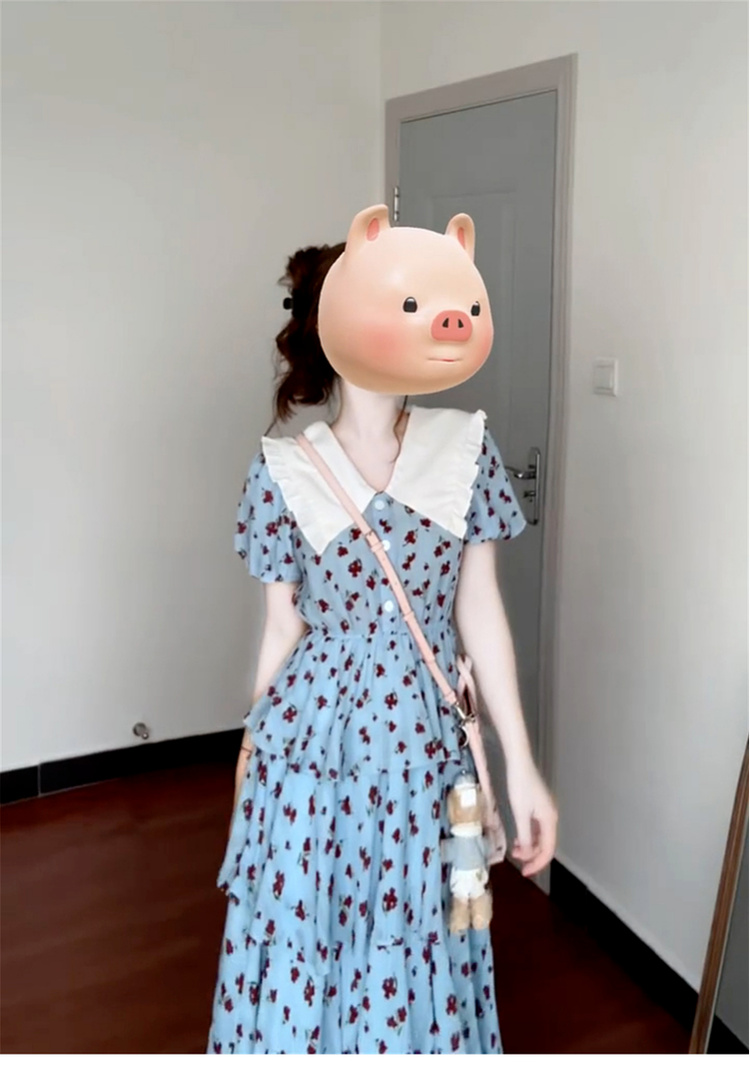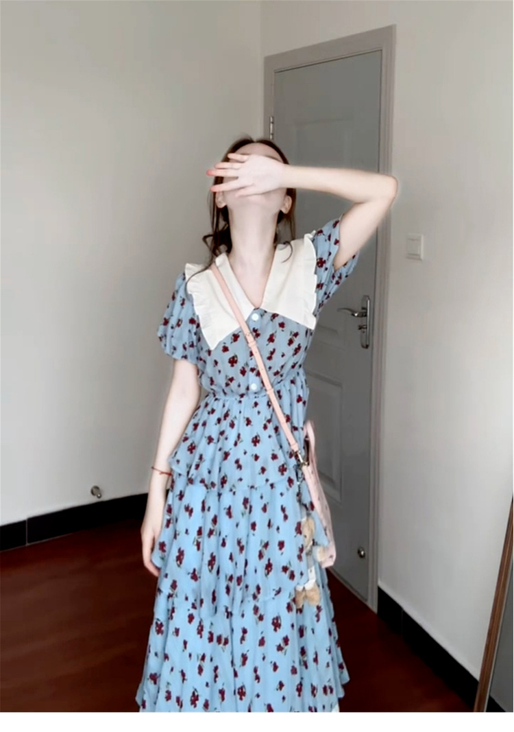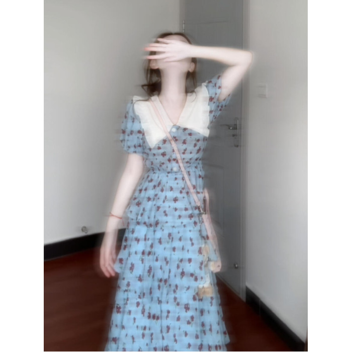 法式藍色碎花短袖襯衫連衣裙子女夏季2025新款小個子氣質收腰長裙