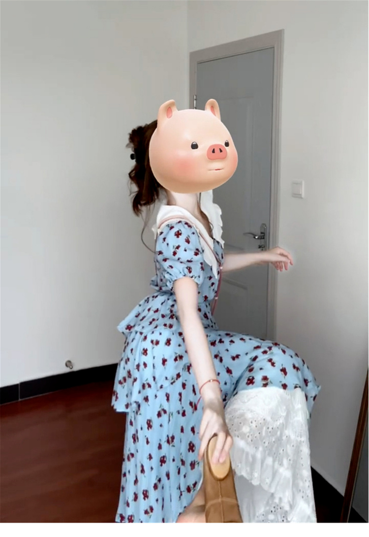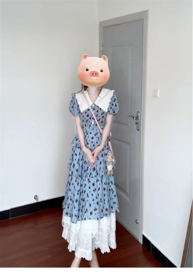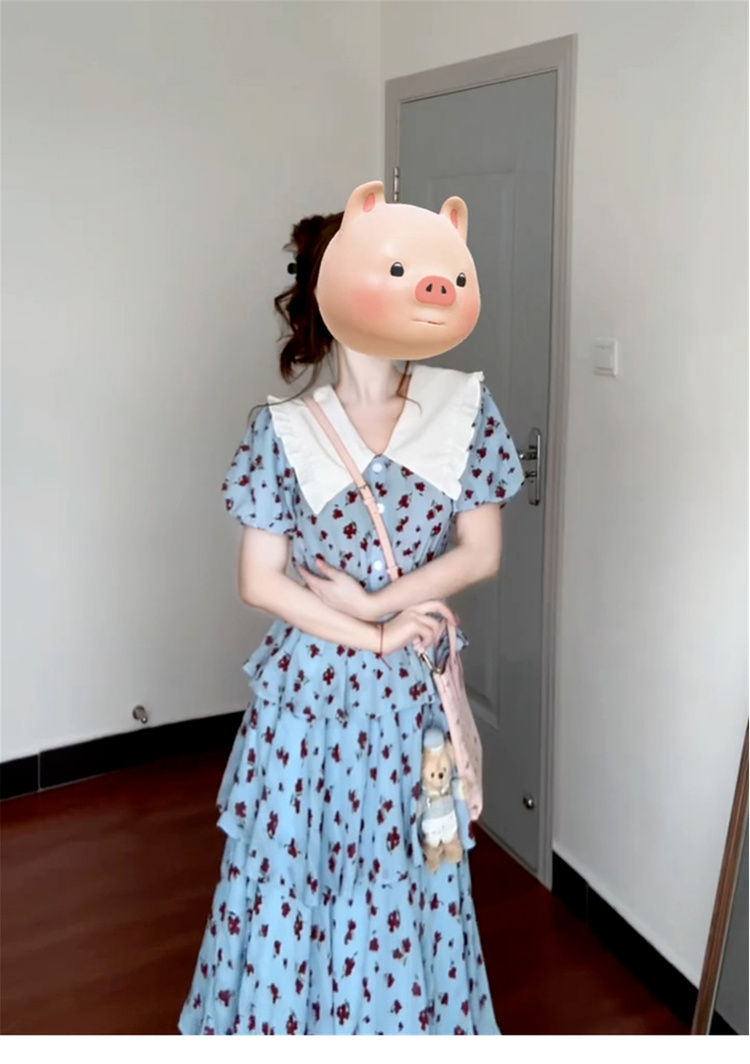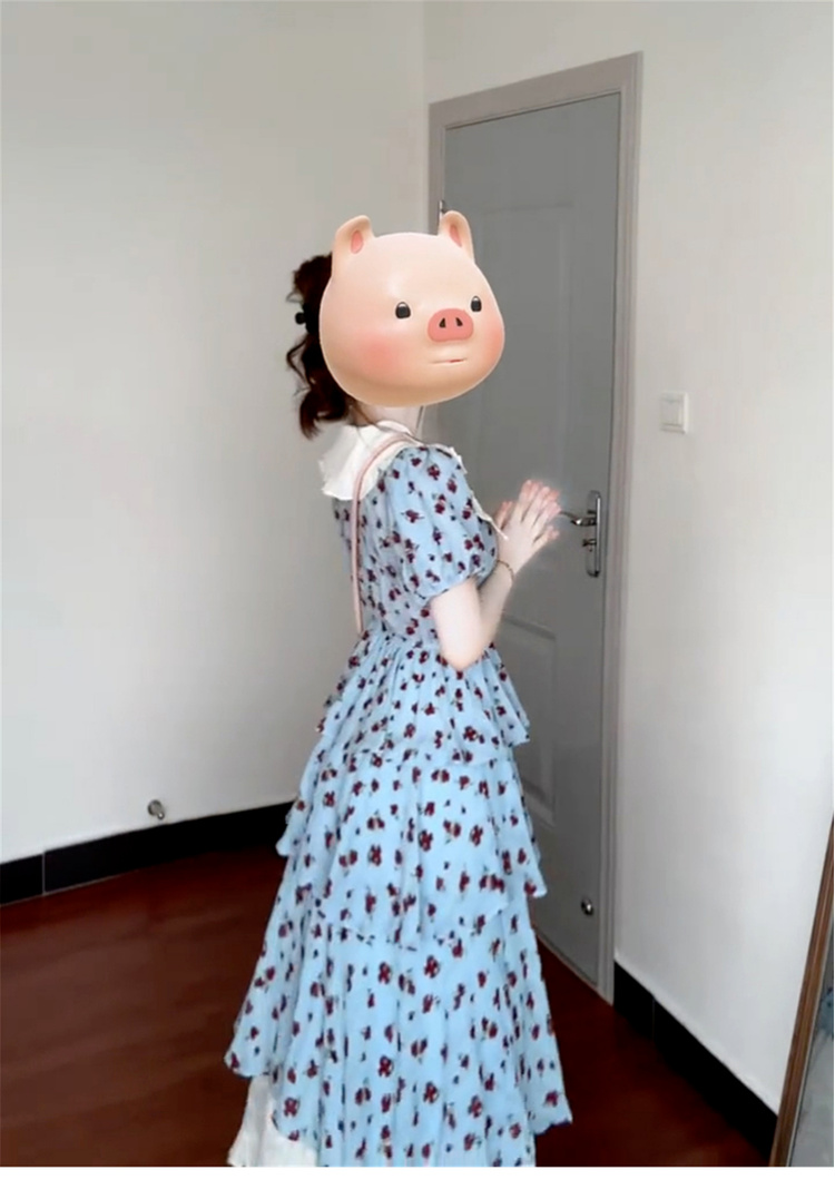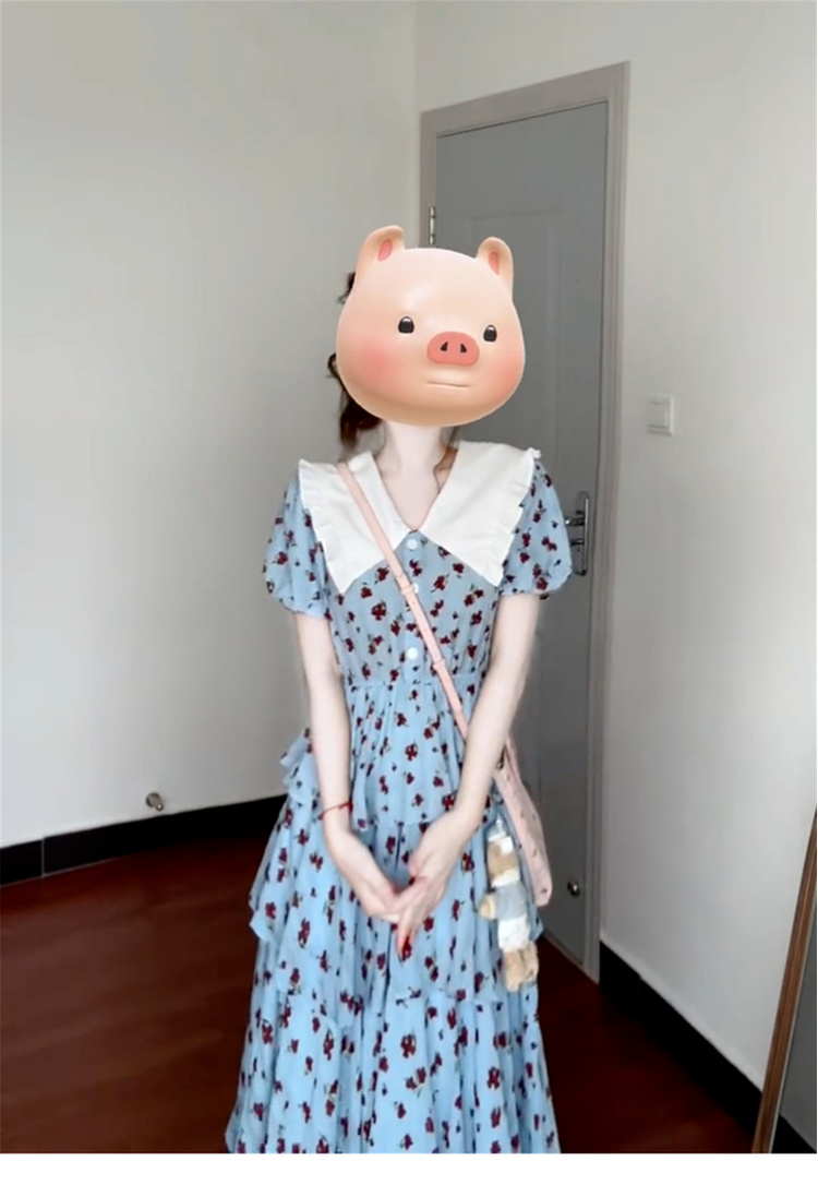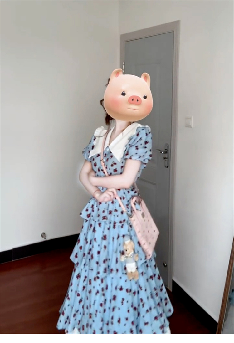 法式藍色碎花短袖襯衫連衣裙子女夏季2025新款小個子氣質收腰長裙