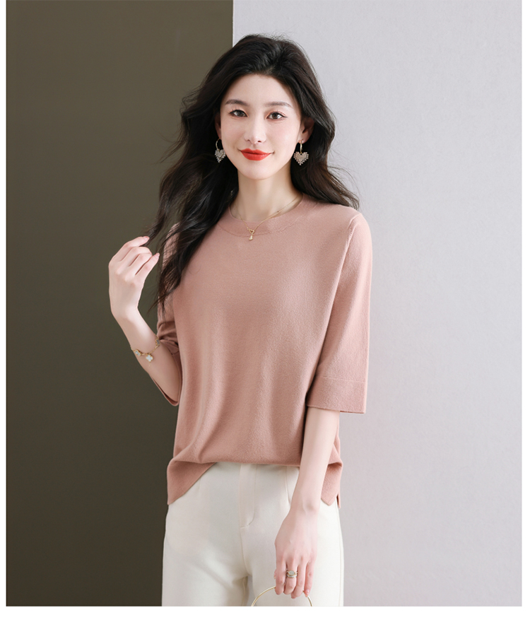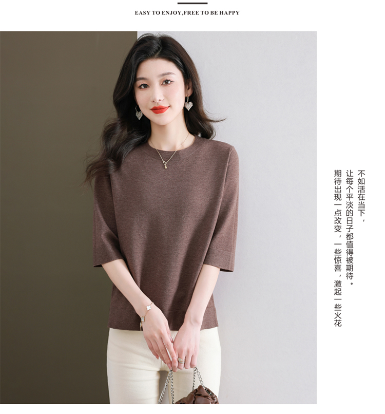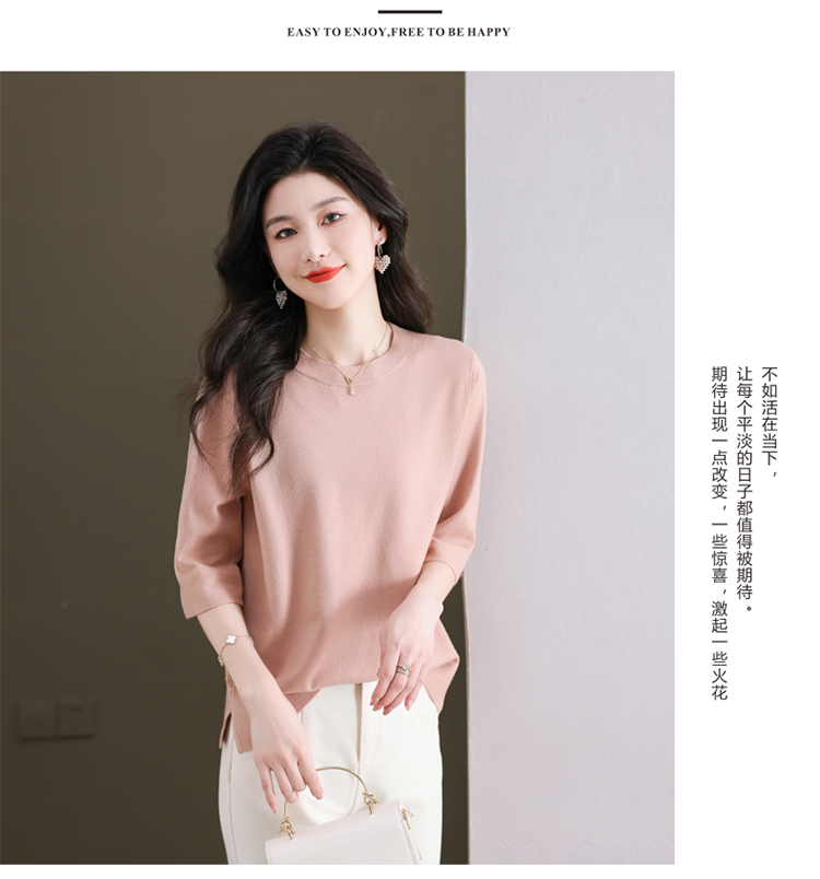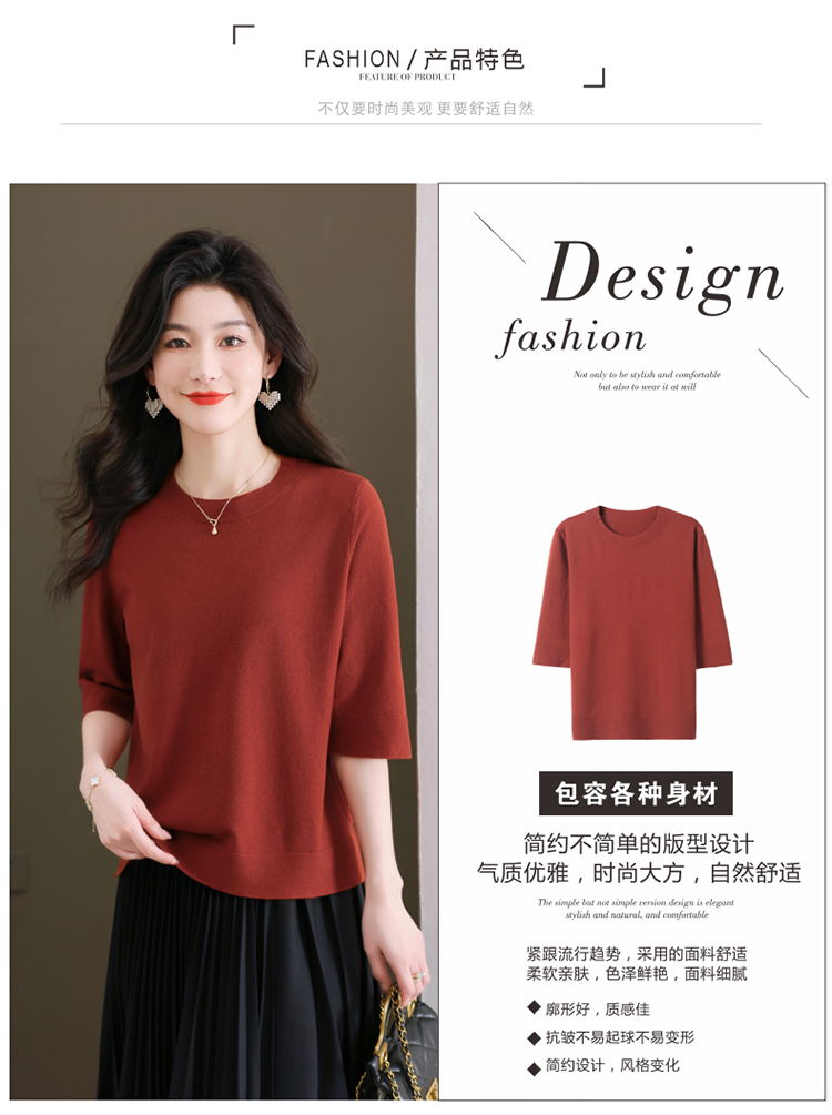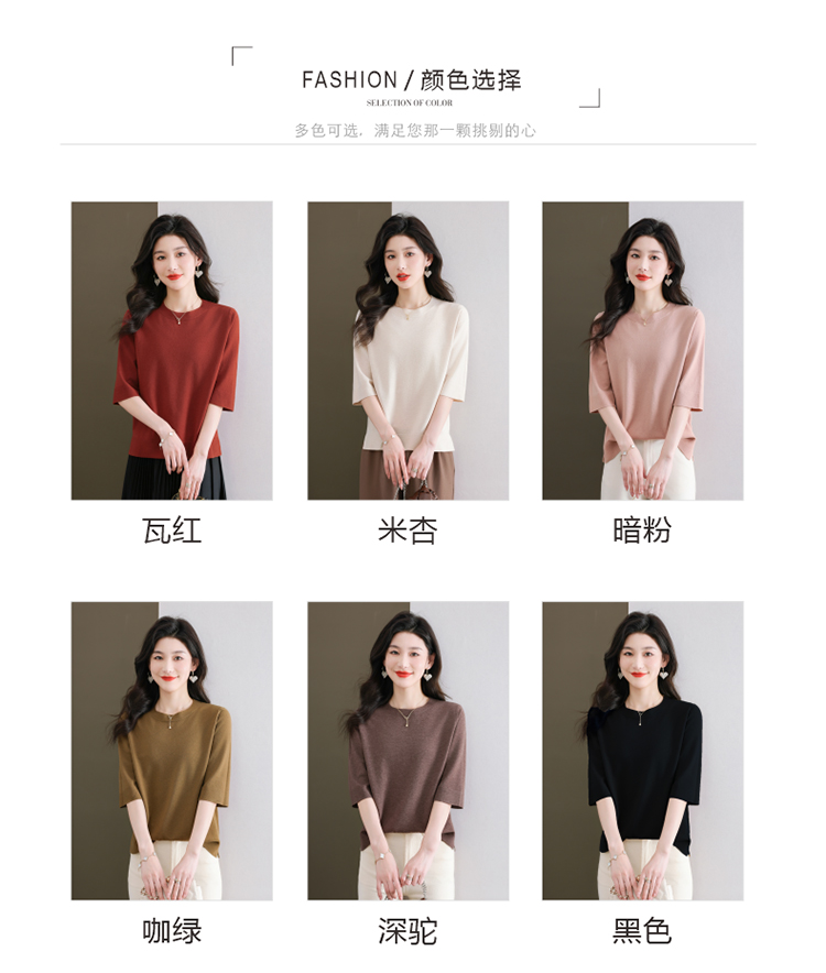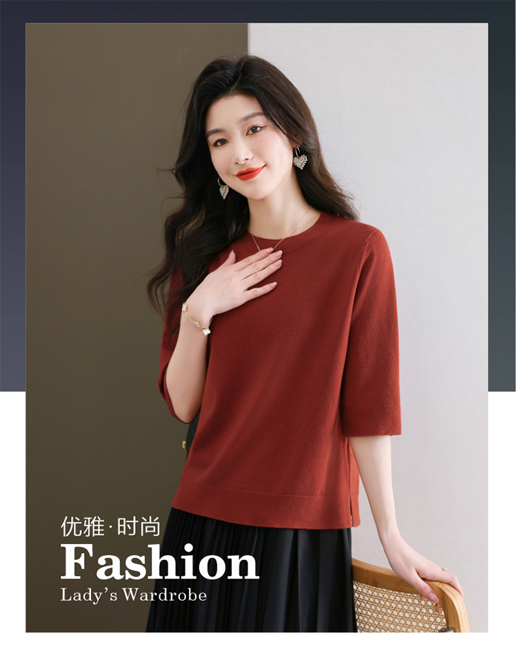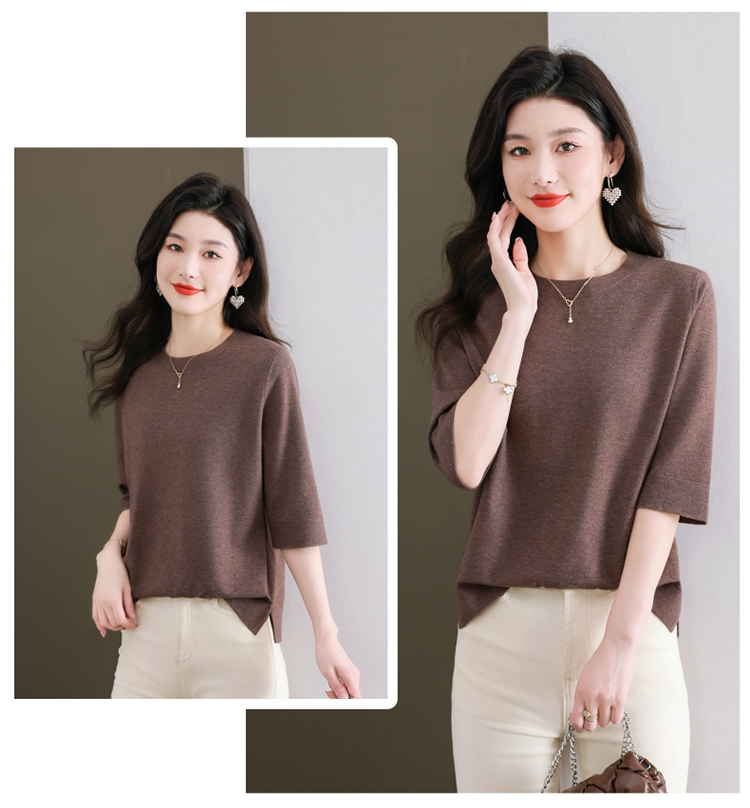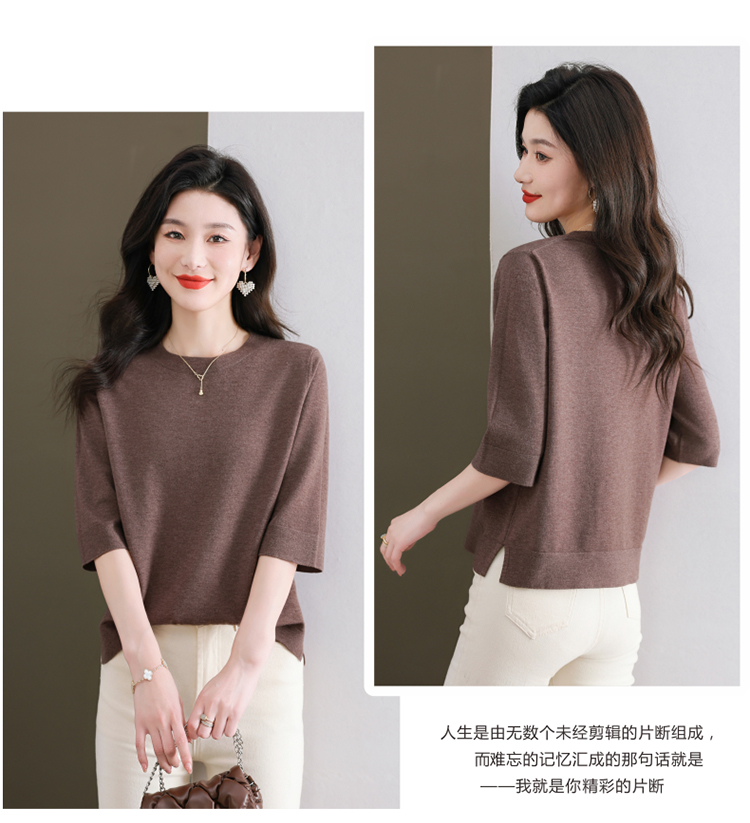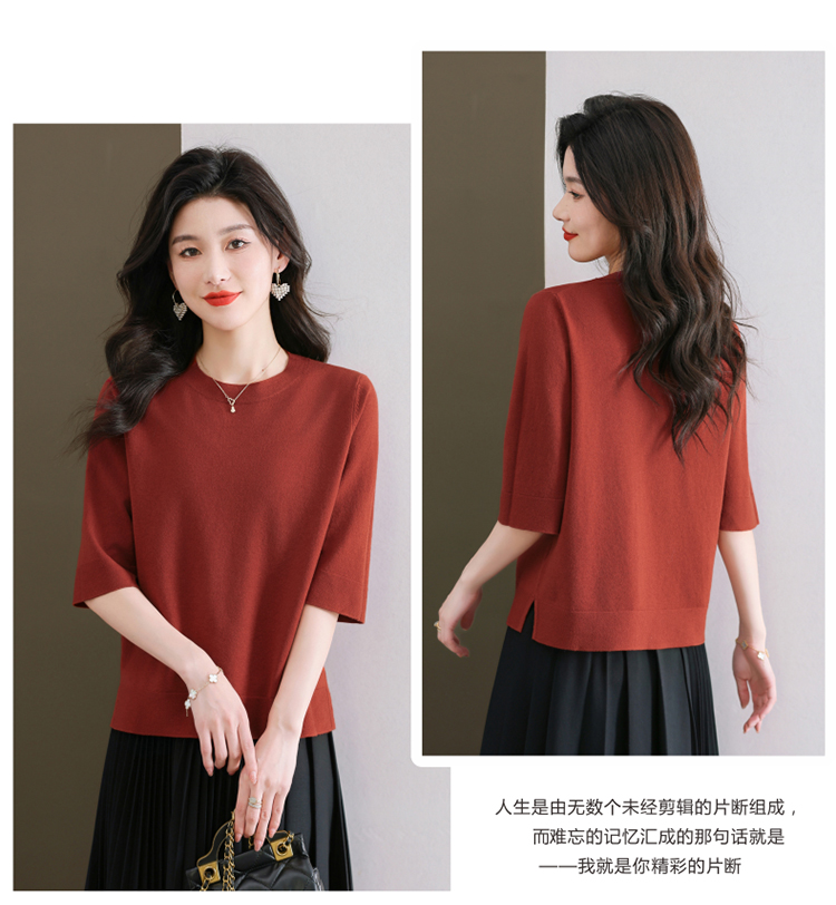 中年媽媽純色中袖羊毛針織上衣寬松大碼顯瘦羊毛衫薄款洋氣打底衫