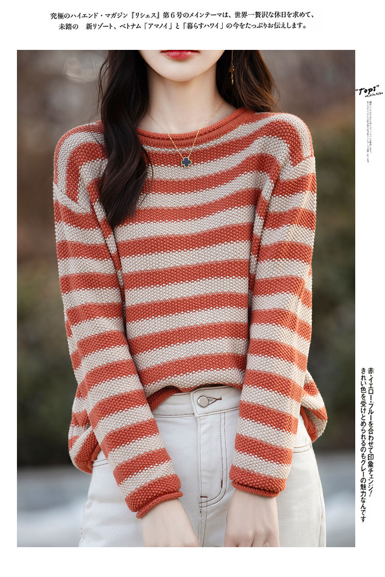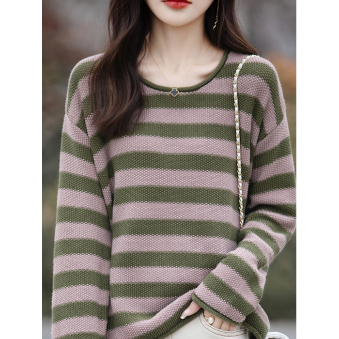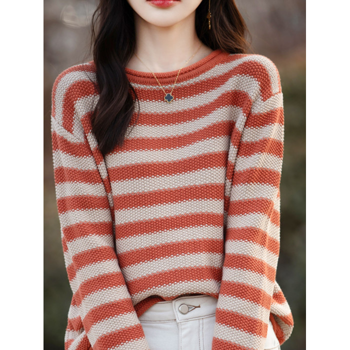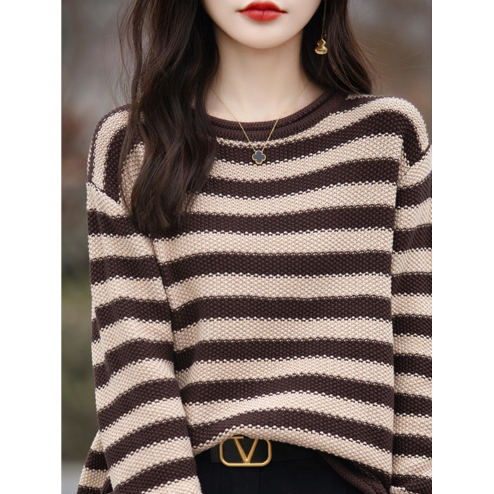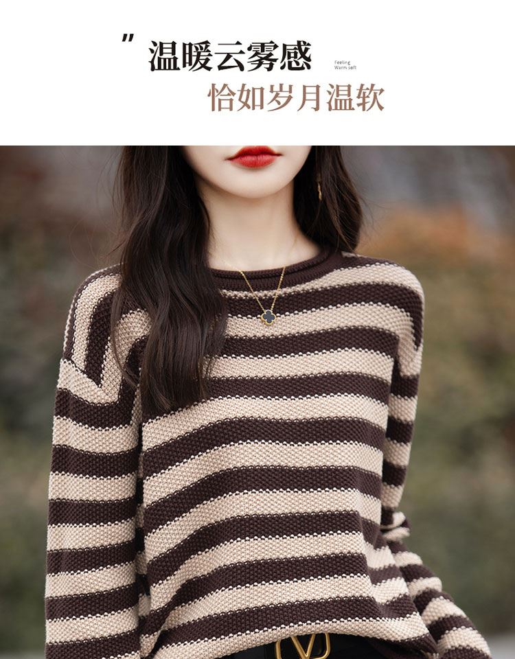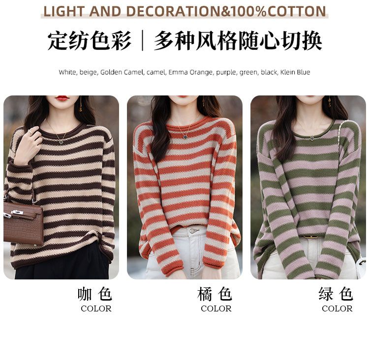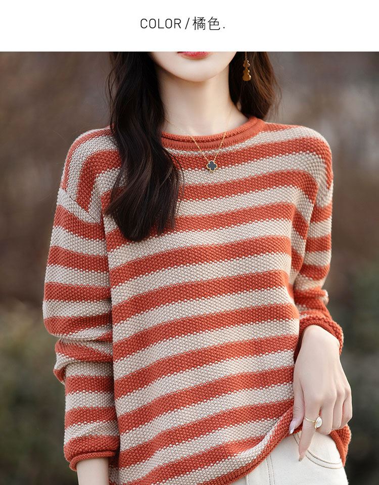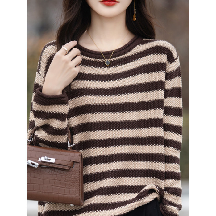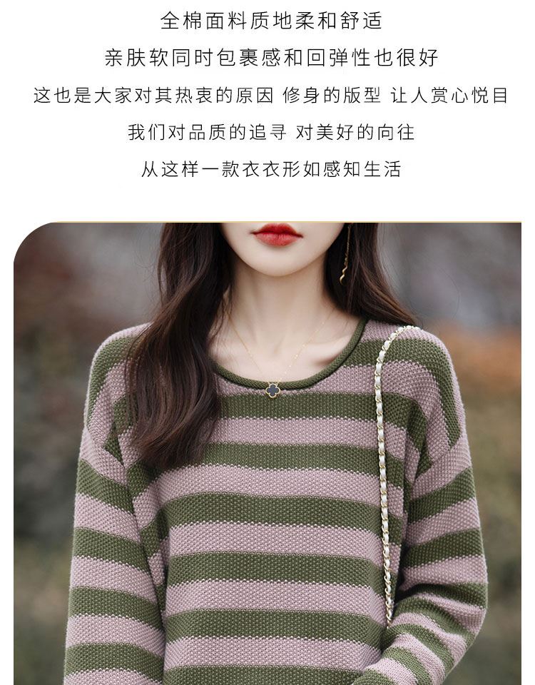 2025春秋季新款條紋打底衫女寬松圓領毛衣長袖純棉線針織衫上衣