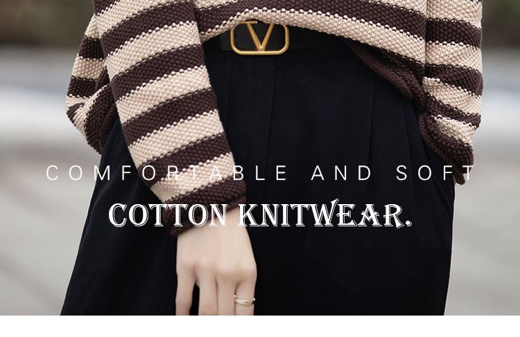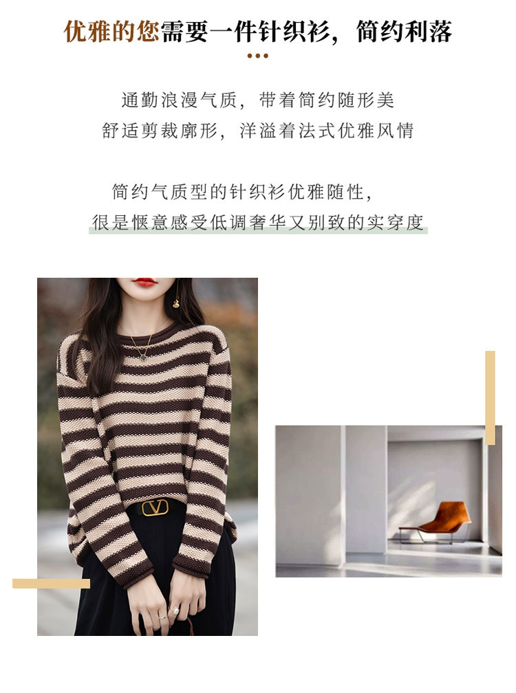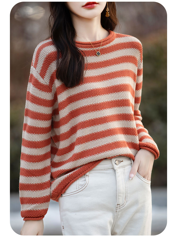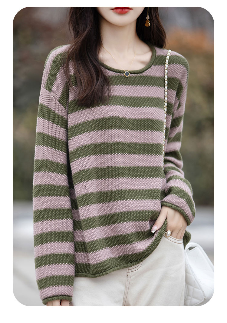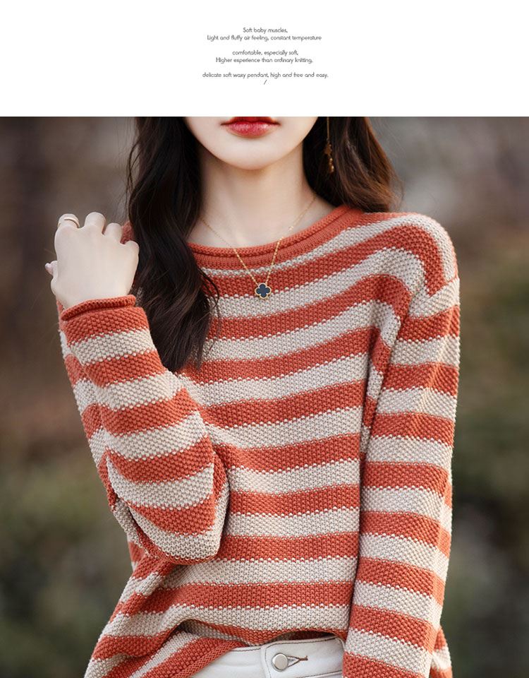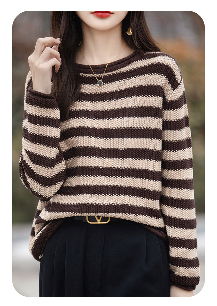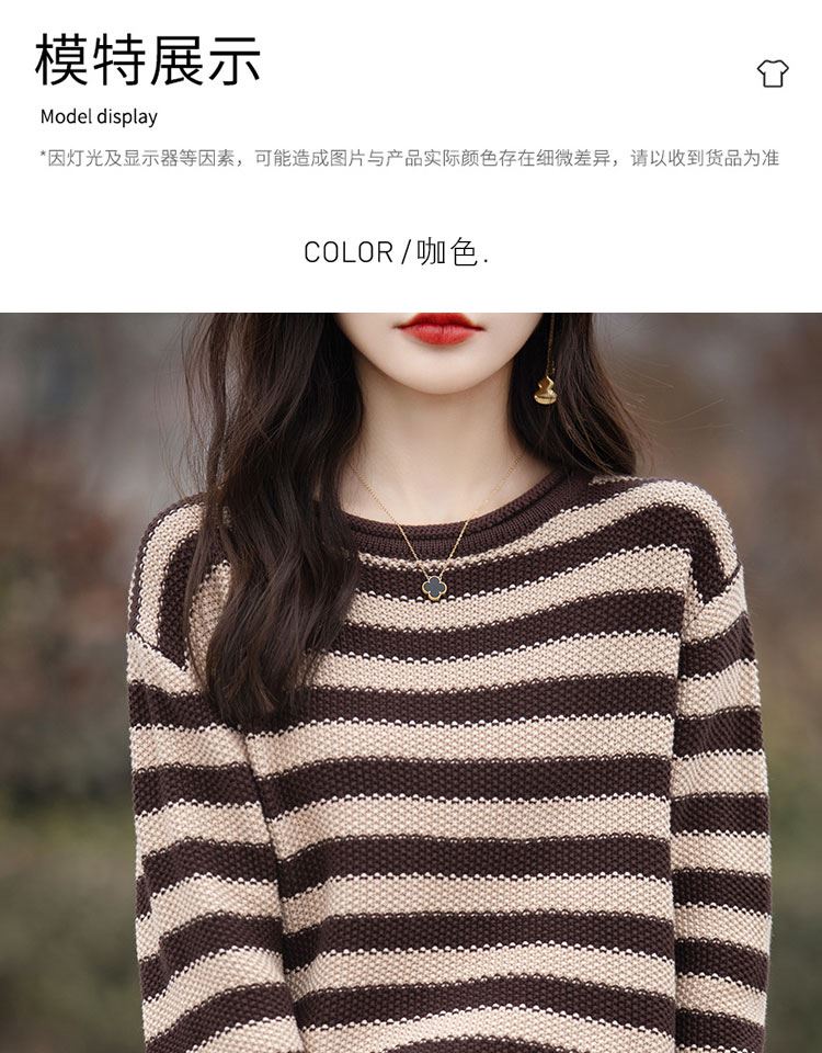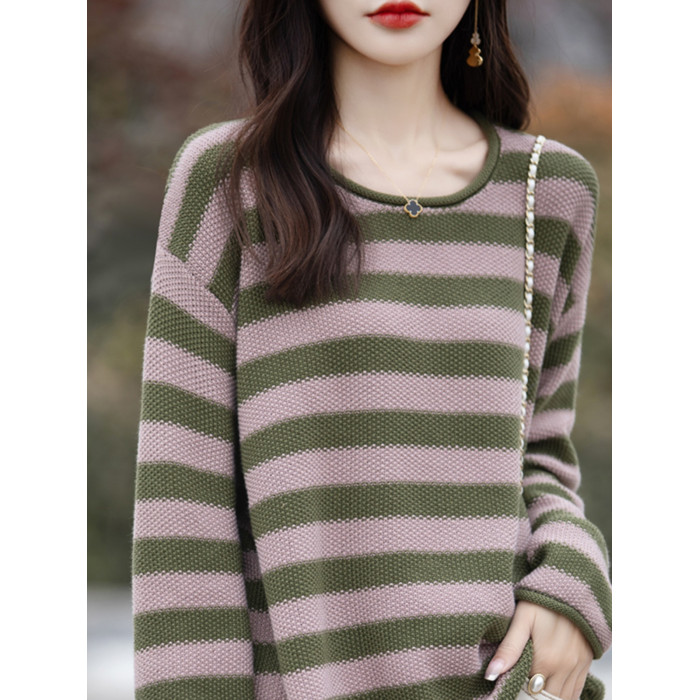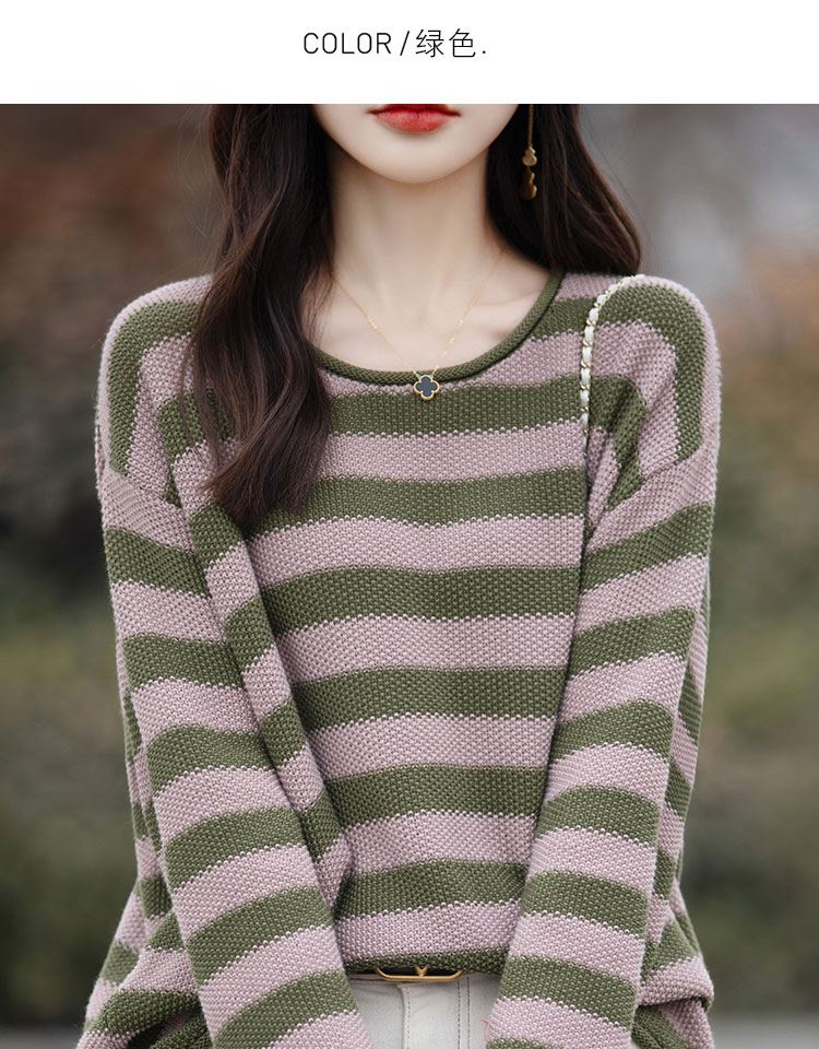 2025春秋季新款條紋打底衫女寬松圓領毛衣長袖純棉線針織衫上衣