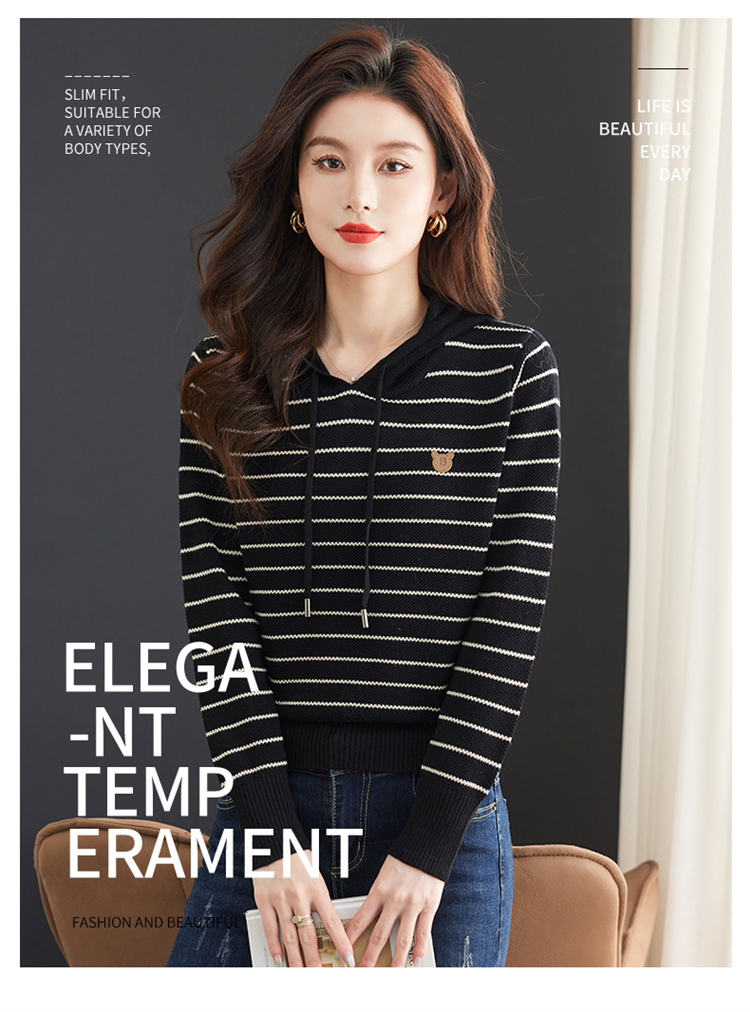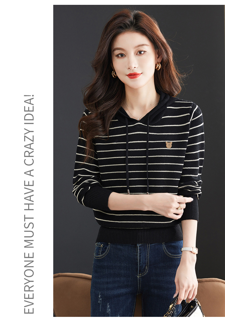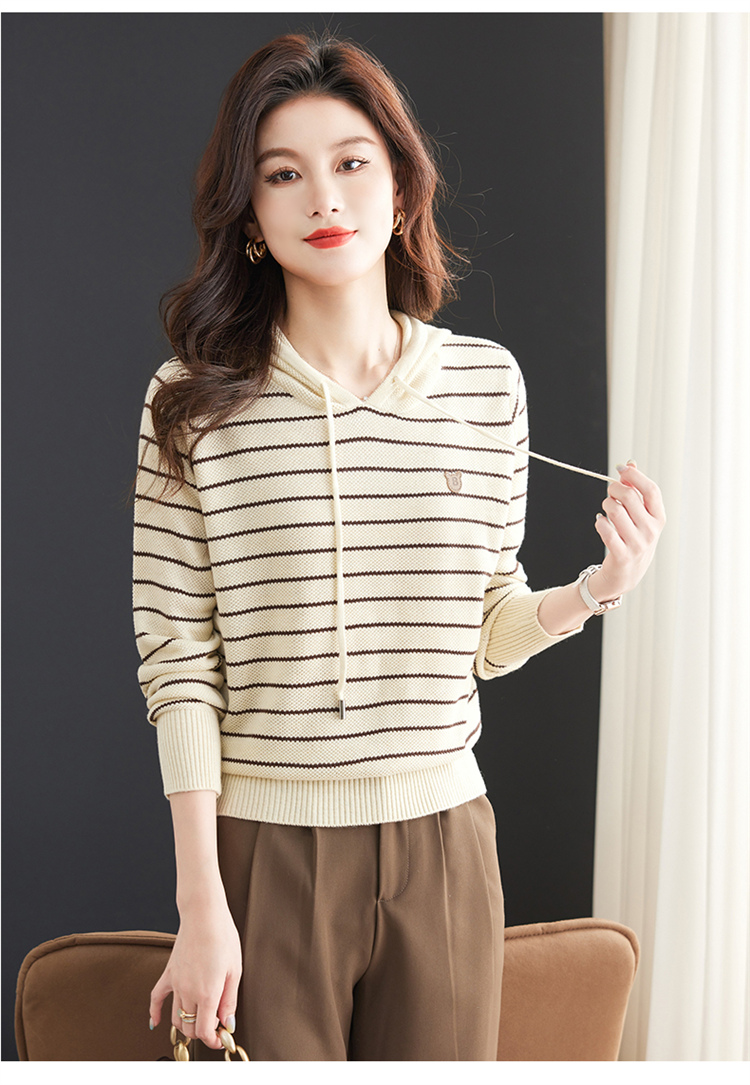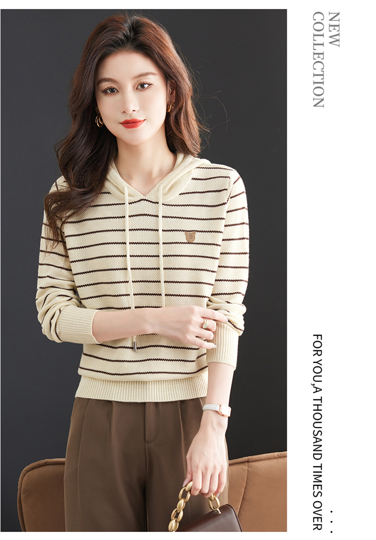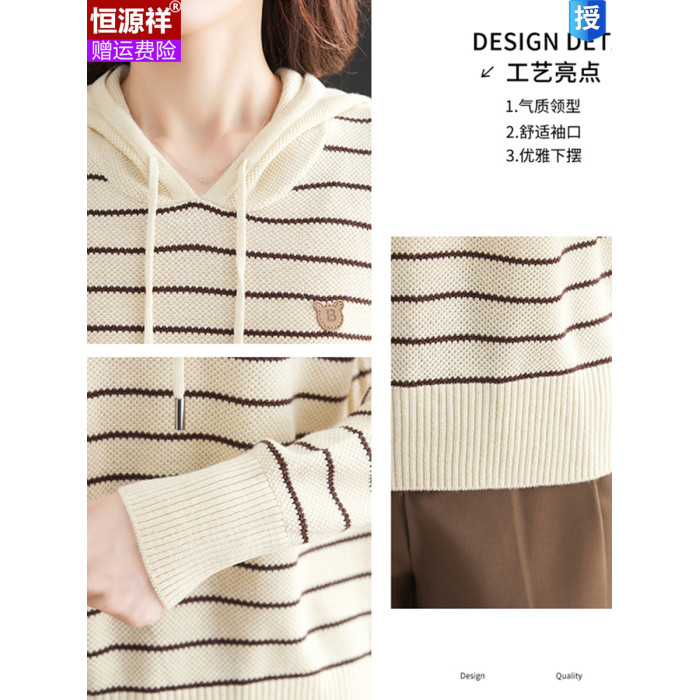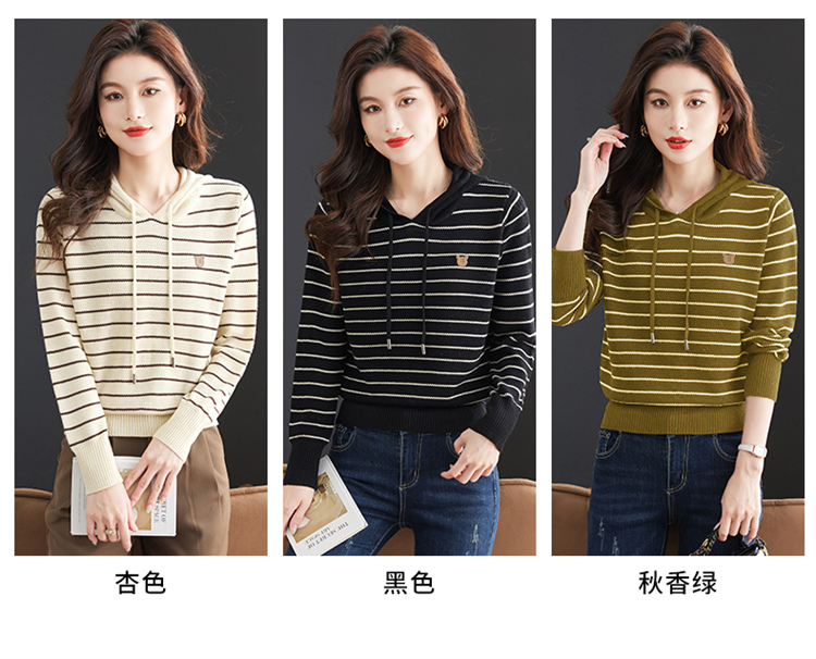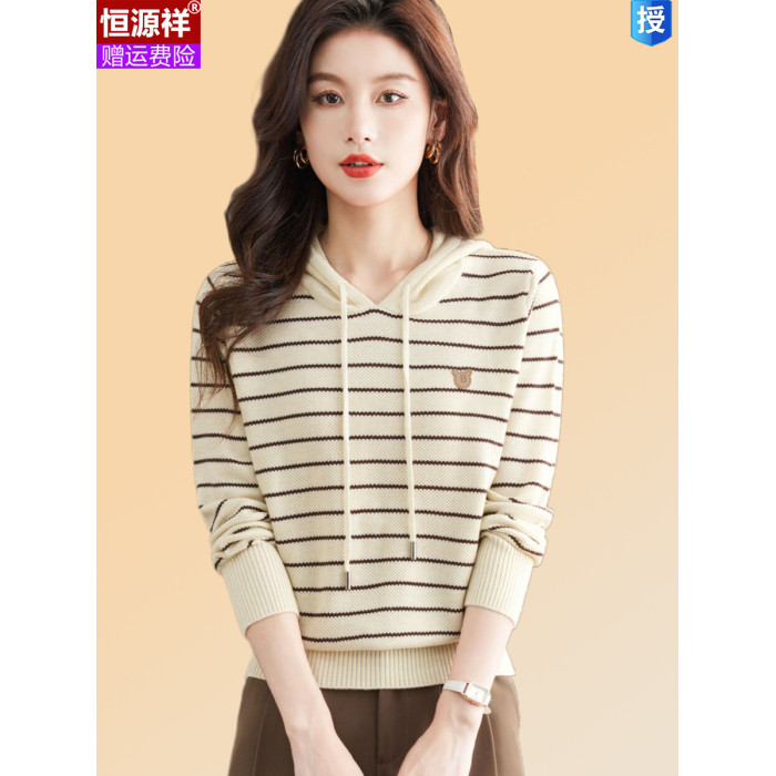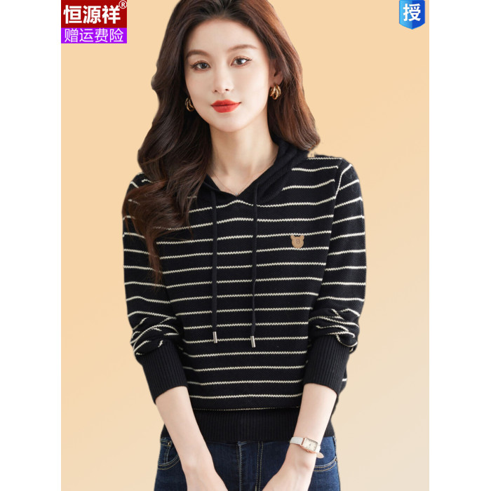 恒源祥連帽羊毛衫女薄款衛衣秋季新款條紋針織打底衫短款帶帽上衣
