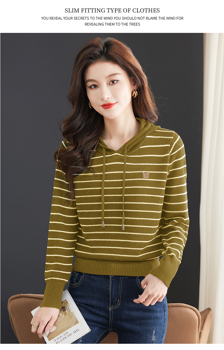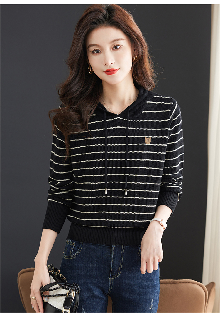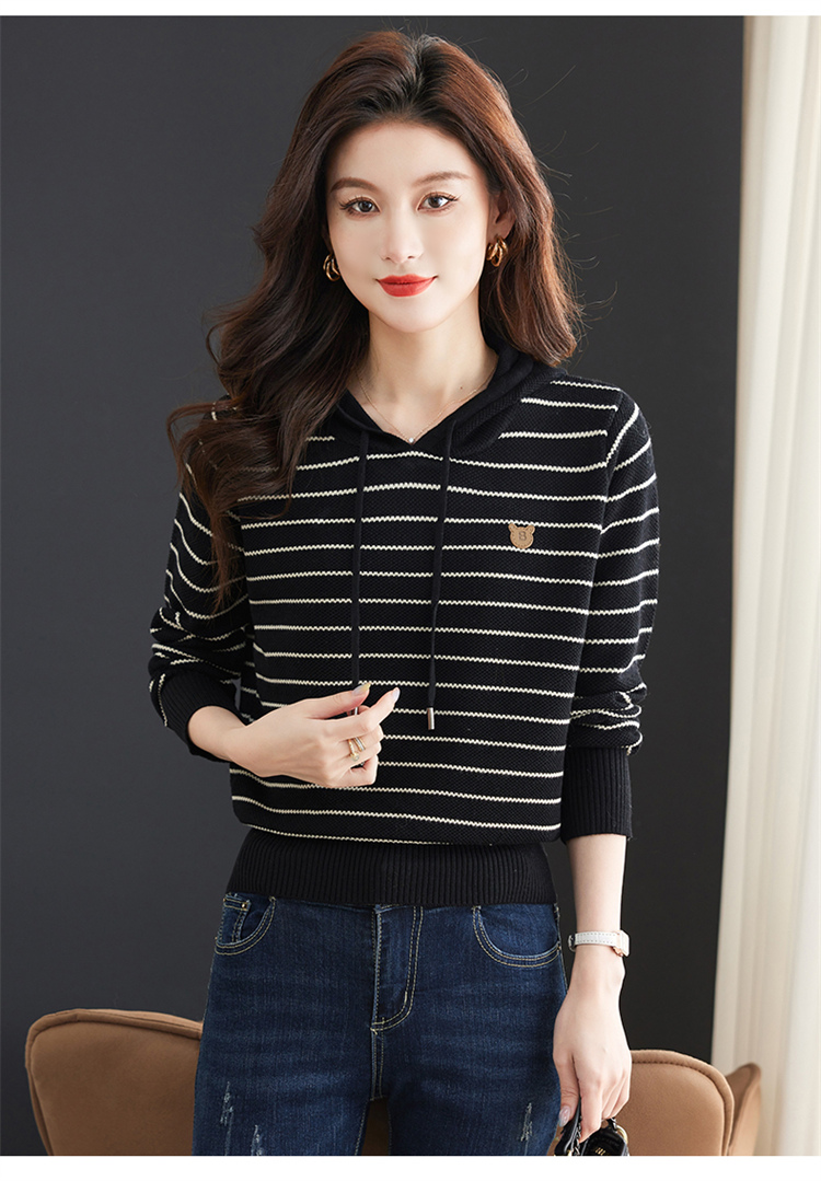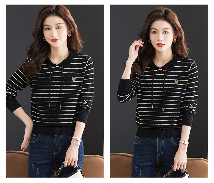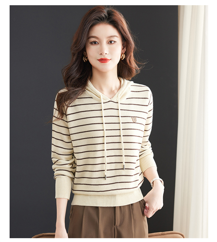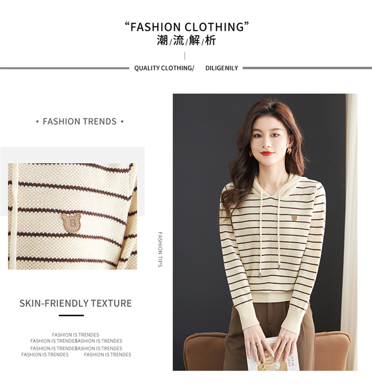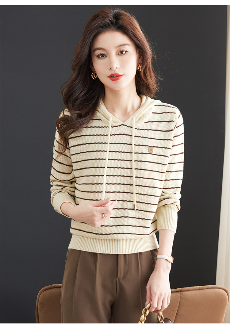 恒源祥連帽羊毛衫女薄款衛衣秋季新款條紋針織打底衫短款帶帽上衣